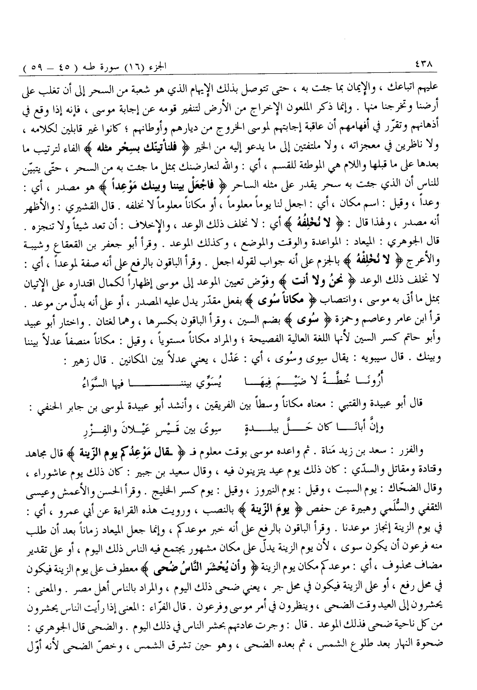 فِي يَوْمِ الزِّينَةِ إِنْجَازُ مَوْعِدَنَا. وَقَرَأَ الْبَاقُونَ بِالرَّفْعِ عَلَى أَنَّهُ خَبَرُ مَوْعِدُكُمْ، وَإِنَّمَا جُعِلَ الْمِيعَادُ زَمَانًا بَعْدَ أَنْ طَلَبَ منه فرعون أن يكون سُوًى، لِأَنَّ يَوْمَ الزِّينَةِ يَدُلُّ عَلَى مَكَانٍ مَشْهُورٍ يَجْتَمِعُ فِيهِ النَّاسُ ذَلِكَ الْيَوْمَ، أَوْ عَلَى تَقْدِيرِ مُضَافٍ مَحْذُوفٍ، أَيْ: مَوْعِدُكُمْ مَكَانُ يَوْمِ الزِّينَةِ وَأَنْ يُحْشَرَ النَّاسُ ضُحًى مَعْطُوفٌ عَلَى يَوْمِ الزِّينَةِ فَيَكُونُ فِي مَحَلِّ رَفْعٍ، أَوْ عَلَى الزِّينَةِ فَيَكُونُ فِي مَحَلِّ جَرٍّ، يَعْنِي ضُحَى ذَلِكَ الْيَوْمِ، وَالْمُرَادُ بِالنَّاسِ أَهْلُ مِصْرَ. وَالْمَعْنَى:
