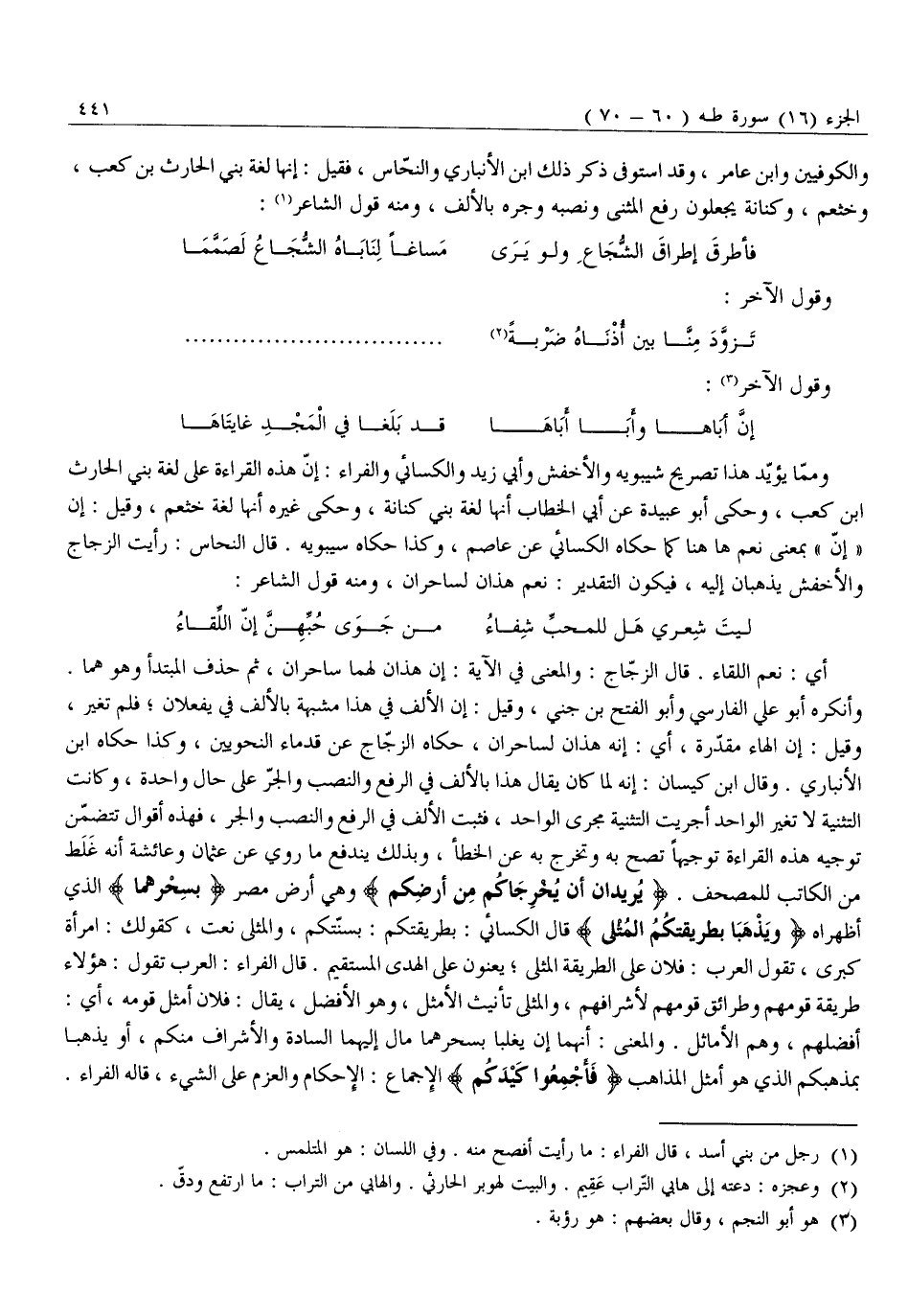 وَأَنْكَرَهُ أَبُو عَلِيٍّ الْفَارِسِيُّ وَأَبُو الْفَتْحِ بْنُ جِنِّي، وَقِيلَ: إِنَّ الْأَلِفَ فِي هَذَا مُشَبَّهَةٌ بِالْأَلِفِ فِي يَفْعَلَانِ فَلَمْ تُغَيَّرْ، وَقِيلَ: إِنَّ الْهَاءَ مُقَدَّرَةٌ، أَيْ: إِنَّهُ هَذَانِ لَسَاحِرَانِ، حَكَاهُ الزَّجَّاجُ عَنْ قُدَمَاءِ النَّحْوِيِّينَ، وَكَذَا حَكَاهُ ابْنُ الْأَنْبَارِيِّ. وَقَالَ ابْنُ كَيْسَانَ: إِنَّهُ لَمَّا كَانَ يُقَالُ هَذَا بِالْأَلِفِ فِي الرَّفْعِ وَالنَّصْبِ وَالْجَرِّ عَلَى حَالٍ وَاحِدَةٍ، وَكَانَتِ التَّثْنِيَةُ لَا تُغَيِّرُ الْوَاحِدَ أُجْرِيَتِ التَّثْنِيَةُ مَجْرَى الْوَاحِدِ، فَثَبَتَ الْأَلِفُ فِي الرَّفْعِ وَالنَّصْبِ وَالْجَرِّ، فَهَذِهِ أَقْوَالٌ تَتَضَمَّنُ توجيه هذه القراءة توجيها تَصِحُّ بِهِ وَتَخْرُجُ بِهِ عَنِ الْخَطَأِ، وَبِذَلِكَ يَنْدَفِعُ مَا رُوِيَ عَنْ عُثْمَانَ وَعَائِشَةَ أَنَّهُ غَلَطٌ مِنَ الْكَاتِبِ لِلْمُصْحَفِ. يُرِيدانِ أَنْ يُخْرِجاكُمْ مِنْ أَرْضِكُمْ وَهِيَ أَرْضُ مِصْرَ بِسِحْرِهِما الَّذِي أَظْهَرَاهُ وَيَذْهَبا بِطَرِيقَتِكُمُ الْمُثْلى قَالَ الْكِسَائِيُّ: بِطَرِيقَتِكُمْ: بِسُنَّتِكُمْ، وَالْمُثْلَى نَعْتٌ، كَقَوْلِكَ: امْرَأَةٌ كُبْرَى، تَقُولُ الْعَرَبُ: فُلَانٌ عَلَى الطَّرِيقَةِ الْمُثْلَى يَعْنُونَ عَلَى الْهُدَى الْمُسْتَقِيمِ. قَالَ الْفَرَّاءُ: الْعَرَبُ تَقُولُ: هَؤُلَاءِ طَرِيقَةُ قَوْمِهِمْ وَطَرَائِقُ قَوْمِهِمْ لِأَشْرَافِهِمْ، وَالْمُثْلَى تَأْنِيثُ الْأَمْثَلِ، وَهُوَ الْأَفْضَلُ، يُقَالُ: فُلَانٌ أَمْثَلُ قَوْمِهِ، أَيْ: