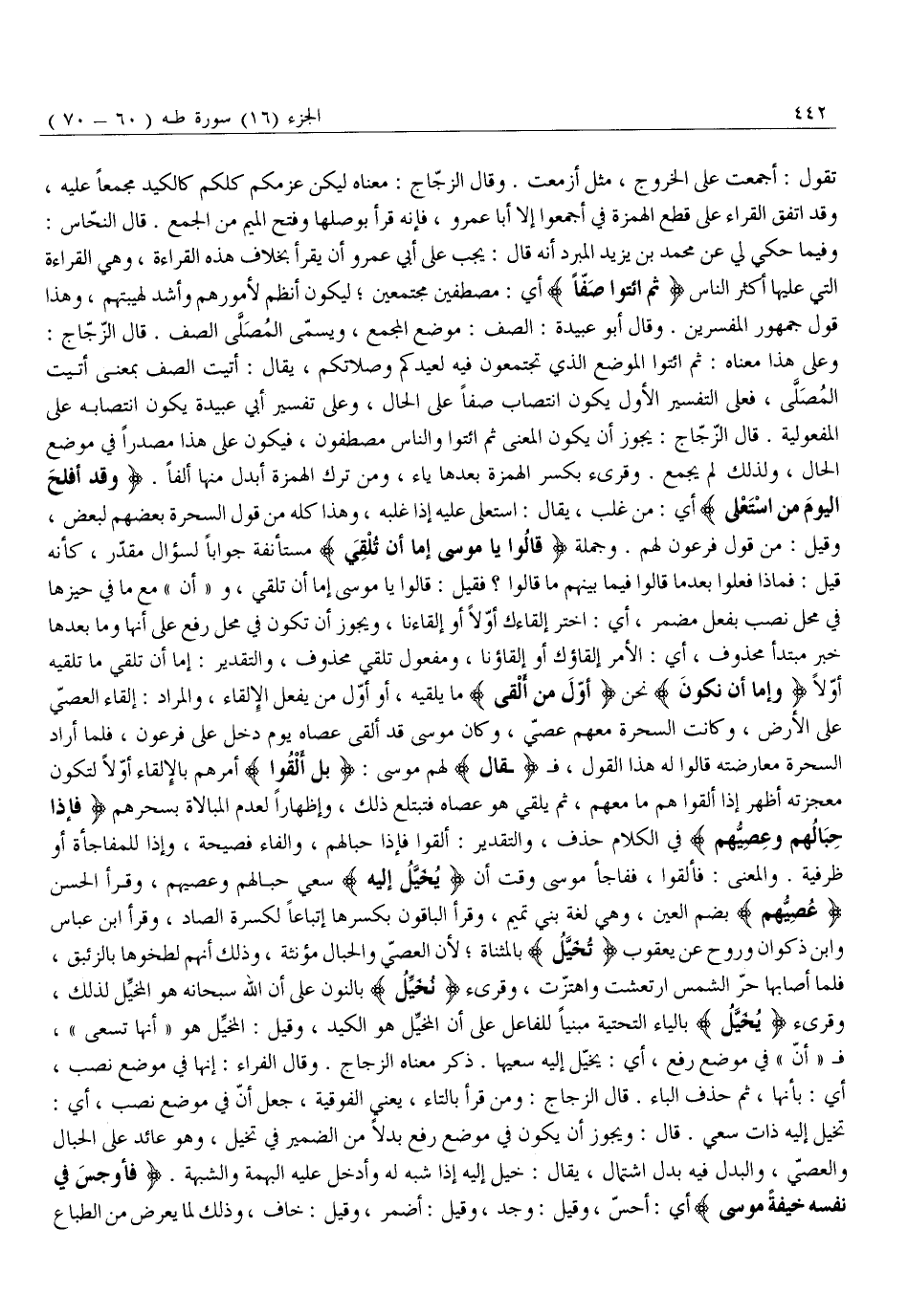 وَعَلَى هَذَا مَعْنَاهُ: ثُمَّ ائْتُوا الْمَوْضِعَ الَّذِي تَجْتَمِعُونَ فِيهِ لِعِيدِكُمْ وَصَلَاتِكُمْ، يُقَالُ: أَتَيْتُ الصَّفَّ بِمَعْنَى أَتَيْتُ الْمُصَلَّى، فَعَلَى التَّفْسِيرِ الْأَوَّلِ يَكُونُ انْتِصَابُ صَفًّا عَلَى الْحَالِ، وَعَلَى تَفْسِيرِ أَبِي عُبَيْدَةَ يَكُونُ انْتِصَابُهُ عَلَى الْمَفْعُولِيَّةِ. قَالَ الزَّجَّاجُ: يَجُوزُ أَنْ يَكُونَ الْمَعْنَى ثُمَّ ائتوا والناس مُصْطَفُّونَ، فَيَكُونُ عَلَى هَذَا مَصْدَرًا فِي مَوْضِعِ الْحَالِ، وَلِذَلِكَ لَمْ يُجْمَعْ. وَقُرِئَ بِكَسْرِ الْهَمْزَةِ بَعْدَهَا يَاءٌ، وَمَنْ تَرَكَ الْهَمْزَةَ أَبْدَلَ مِنْهَا أَلِفًا. وَقَدْ أَفْلَحَ الْيَوْمَ مَنِ اسْتَعْلى أَيْ: مَنْ غَلَبَ، يُقَالُ: اسْتَعْلَى عَلَيْهِ إِذَا غَلَبَهُ، وَهَذَا كُلُّهُ مِنْ قَوْلِ السَّحَرَةِ بَعْضِهِمْ لِبَعْضٍ، وَقِيلَ: مِنْ قَوْلِ فِرْعَوْنَ لَهُمْ. وَجُمْلَةُ قالُوا يَا مُوسى إِمَّا أَنْ تُلْقِيَ مُسْتَأْنَفَةٌ جَوَابًا لسؤال مقدّر، كأنه قيل: فماذا فعلوا بعد ما قَالُوا فِيمَا بَيْنَهُمْ مَا قَالُوا؟ فَقِيلَ: قَالُوا يا موسى إما أن تلقي، و «أن» مَعَ مَا فِي حَيِّزِهَا فِي مَحَلِّ نَصْبٍ بِفِعْلٍ مُضْمَرٍ، أَيِ: اخْتَرْ إِلْقَاءَكَ أَوَّلًا أَوْ إِلْقَاءَنَا، وَيَجُوزُ أَنْ تَكُونَ فِي مَحَلِّ رَفْعٍ عَلَى أَنَّهَا وَمَا بَعْدَهَا خَبَرُ مُبْتَدَأٍ مَحْذُوفٍ، أي: الأمر إلقاؤك أو إلقاؤنا، وَمَفْعُولُ تُلْقِيَ مَحْذُوفٌ، وَالتَّقْدِيرُ: إِمَّا أَنْ تُلْقِيَ مَا تُلْقِيهِ أَوَّلًا وَإِمَّا أَنْ نَكُونَ نَحْنُ أَوَّلَ مَنْ أَلْقى مَا يُلْقِيهِ، أَوْ أَوَّلَ مَنْ يَفْعَلُ الْإِلْقَاءَ، وَالْمُرَادُ: إِلْقَاءُ الْعِصِيِّ عَلَى الْأَرْضِ، وَكَانَتِ السَّحَرَةُ مَعَهُمْ عِصِيٌّ، وَكَانَ مُوسَى قَدْ أَلْقَى عَصَاهُ يَوْمَ دَخَلَ عَلَى فِرْعَوْنَ، فَلَمَّا أَرَادَ السَّحَرَةُ مُعَارَضَتَهُ قَالُوا لَهُ هَذَا الْقَوْلَ، فَ قالَ لَهُمْ مُوسَى: بَلْ أَلْقُوا أَمَرَهُمْ بِالْإِلْقَاءِ أَوَّلًا لِتَكُونَ مُعْجِزَتُهُ أَظْهَرَ إِذَا أَلْقَوْا هُمْ مَا مَعَهُمْ، ثُمَّ يُلْقِي هُوَ عَصَاهُ فَتَبْتَلِعُ ذَلِكَ، وَإِظْهَارًا لِعَدَمِ الْمُبَالَاةِ بِسِحْرِهِمْ فَإِذا حِبالُهُمْ وَعِصِيُّهُمْ فِي الْكَلَامِ حَذْفٌ، وَالتَّقْدِيرُ: ألقوا فَإِذَا حِبَالُهُمْ، وَالْفَاءُ فَصَيْحَةٌ، وَإِذَا لِلْمُفَاجَأَةِ أَوْ ظَرْفِيَّةٌ. وَالْمَعْنَى: فَأَلْقَوْا، فَفَاجَأَ مُوسَى وَقْتَ أَنْ يُخَيَّلُ إِلَيْهِ سَعْيُ حِبَالِهِمْ وَعِصِيِّهِمْ، وَقَرَأَ الْحَسَنُ عِصِيُّهُمْ بِضَمِّ الْعَيْنِ، وَهِيَ لُغَةُ بَنِي تَمِيمٍ، وَقَرَأَ الْبَاقُونَ بِكَسْرِهَا اتِّبَاعًا لِكَسْرَةِ الصَّادِ، وَقَرَأَ ابْنُ عَبَّاسٍ وَابْنُ ذَكْوَانَ وَرَوْحٌ عَنْ يَعْقُوبَ تُخَيَّلُ بِالْمُثَنَّاةِ لِأَنَّ الْعِصِيَّ وَالْحِبَالَ مُؤَنَّثَةٌ، وَذَلِكَ أَنَّهُمْ لَطَّخُوهَا بِالزِّئْبَقِ، فَلَمَّا أَصَابَهَا حَرُّ الشَّمْسِ ارْتَعَشَتْ وَاهْتَزَّتْ، وَقُرِئَ نُخَيِّلُ بِالنُّونِ عَلَى أَنَّ اللَّهَ سُبْحَانَهُ هُوَ الْمُخَيِّلُ لِذَلِكَ، وَقُرِئَ يُخَيِّلُ بِالْيَاءِ التَّحْتِيَّةِ مَبْنِيًّا لِلْفَاعِلِ عَلَى أَنَّ الْمُخَيِّلَ هُوَ الْكَيْدُ، وَقِيلَ: الْمُخَيِّلُ هُوَ «أَنَّهَا تَسْعَى» ، ف «أنّ» فِي مَوْضِعِ رَفْعٍ، أَيْ: يُخَيَّلُ إِلَيْهِ سَعْيُهَا. ذَكَرَ مَعْنَاهُ الزَّجَّاجُ. وَقَالَ الْفَرَّاءُ: إِنَّهَا فِي مَوْضِعِ نَصْبٍ، أَيْ: بِأَنَّهَا، ثُمَّ حَذَفَ الْبَاءَ. قَالَ الزَّجَّاجُ: وَمَنْ قَرَأَ بِالتَّاءِ، يَعْنِي الْفَوْقِيَّةَ، جَعَلَ أَنَّ فِي مَوْضِعِ نَصْبٍ، أَيْ: