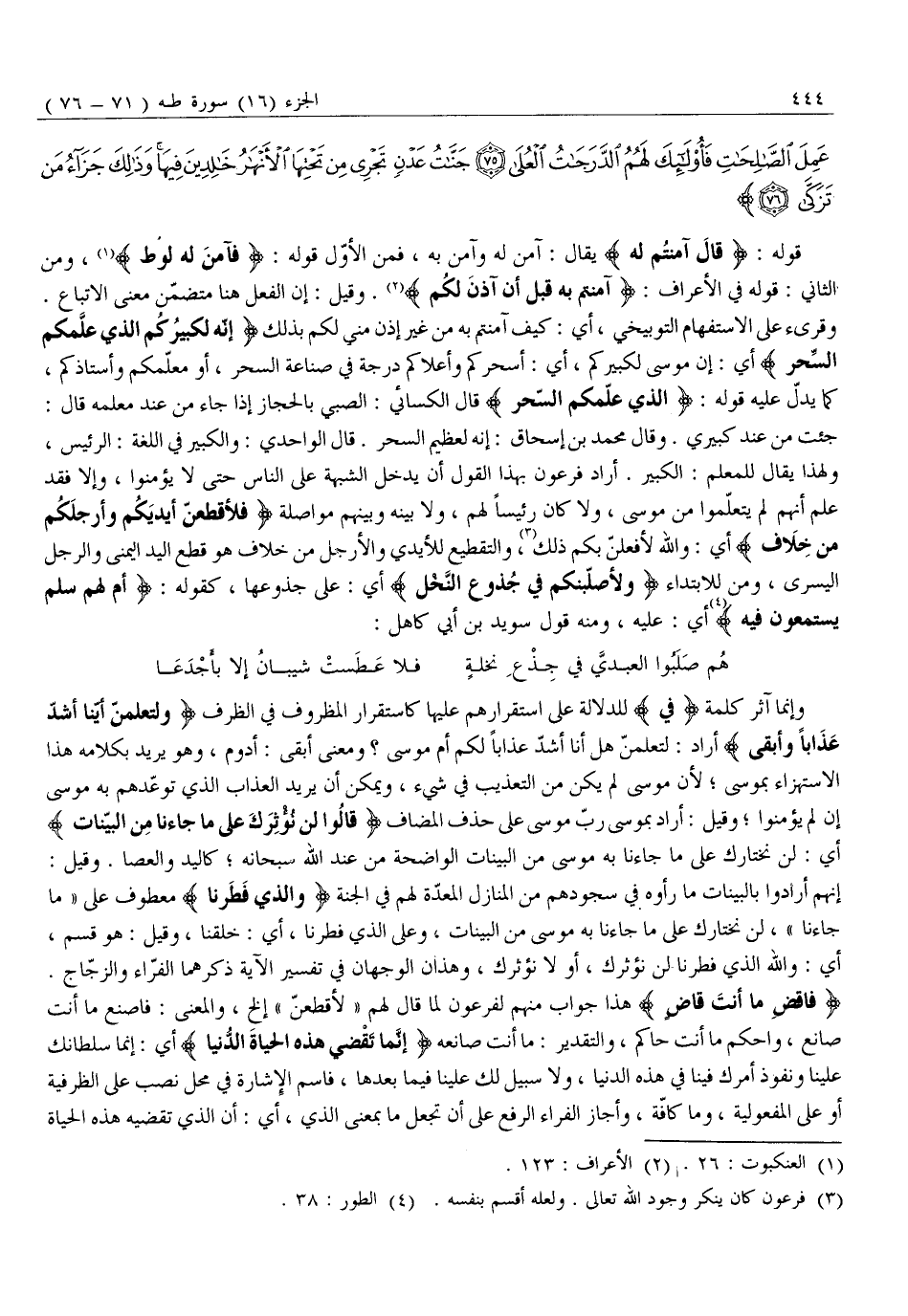 وَإِنَّمَا آثَرَ كَلِمَةَ فِي لِلدَّلَالَةِ عَلَى اسْتِقْرَارِهِمْ عَلَيْهَا كَاسْتِقْرَارِ الْمَظْرُوفِ فِي الظَّرْفِ وَلَتَعْلَمُنَّ أَيُّنا أَشَدُّ عَذاباً وَأَبْقى أَرَادَ: لَتَعْلَمُنَّ هَلْ أَنَا أَشَدُّ عَذَابًا لَكُمْ أَمْ مُوسَى؟ وَمَعْنَى أَبْقَى: أَدْوَمُ، وَهُوَ يُرِيدُ بِكَلَامِهِ هَذَا الِاسْتِهْزَاءَ بِمُوسَى لِأَنَّ مُوسَى لَمْ يَكُنْ مِنَ التَّعْذِيبِ فِي شَيْءٍ، وَيُمْكِنُ أَنْ يُرِيدَ الْعَذَابَ الَّذِي تَوَعَّدَهُمْ بِهِ مُوسَى إِنْ لَمْ يُؤْمِنُوا وَقِيلَ: أَرَادَ بِمُوسَى رَبَّ مُوسَى عَلَى حَذْفِ الْمُضَافِ قالُوا لَنْ نُؤْثِرَكَ عَلى مَا جاءَنا مِنَ الْبَيِّناتِ أَيْ: لَنْ نَخْتَارَكَ عَلَى مَا جَاءَنَا بِهِ مُوسَى مِنَ الْبَيِّنَاتِ الْوَاضِحَةِ مِنْ عِنْدِ اللَّهِ سُبْحَانَهُ كَالْيَدِ وَالْعَصَا. وَقِيلَ: