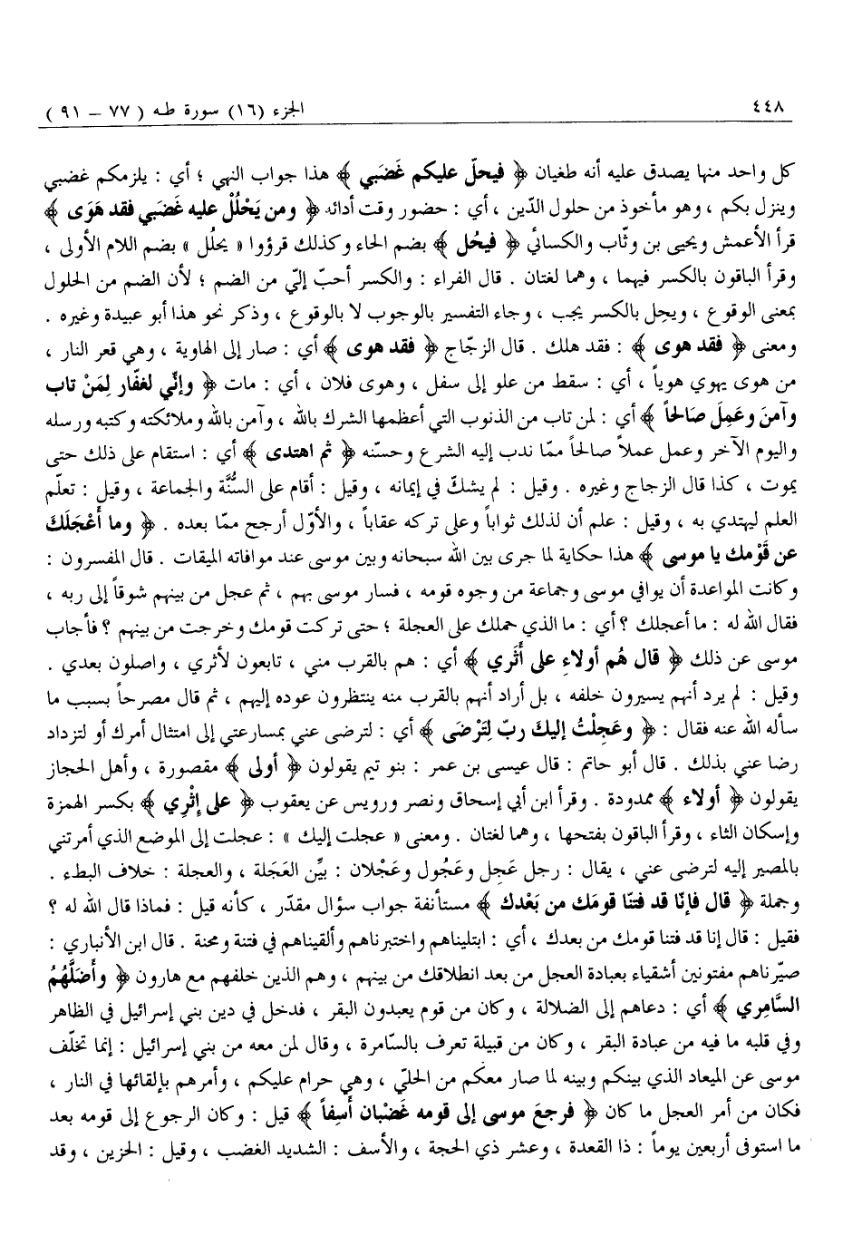 وَمَعْنَى فَقَدْ هَوى: فقد هلك. قَالَ الزَّجَّاجُ فَقَدْ هَوى أَيْ: صَارَ إِلَى الْهَاوِيَةِ، وَهِيَ قَعْرُ النَّارِ، مِنْ هَوَى يَهْوِي هَوْيًا، أَيْ: سَقَطَ مِنْ عُلُوٍّ إِلَى سُفْلٍ، وَهَوَى فُلَانٌ، أَيْ: مَاتَ وَإِنِّي لَغَفَّارٌ لِمَنْ تابَ وَآمَنَ وَعَمِلَ صالِحاً أَيْ: لِمَنْ تَابَ مِنَ الذُّنُوبِ الَّتِي أَعْظَمُهَا الشِّرْكُ بِاللَّهِ، وَآمَنَ بِاللَّهِ وَمَلَائِكَتِهِ وَكُتُبِهِ وَرُسُلِهِ وَالْيَوْمِ الْآخِرِ وَعَمَلِ عَمَلًا صَالِحًا مِمَّا نَدَبَ إِلَيْهِ الشَّرْعُ وَحَسَّنَهُ ثُمَّ اهْتَدى أَيِ: اسْتَقَامَ عَلَى ذَلِكَ حَتَّى يَمُوتَ، كَذَا قَالَ الزَّجَّاجُ وَغَيْرُهُ. وَقِيلَ: لَمْ يَشُكَّ فِي إِيمَانِهِ، وَقِيلَ: أَقَامَ عَلَى السُّنَّةِ وَالْجَمَاعَةِ، وَقِيلَ: تَعَلَّمَ الْعِلْمَ لِيَهْتَدِيَ بِهِ، وَقِيلَ: عَلِمَ أَنَّ لِذَلِكَ ثَوَابًا وَعَلَى تَرْكِهِ عِقَابًا، وَالْأَوَّلُ أَرْجَحُ مِمَّا بَعْدَهُ. وَما أَعْجَلَكَ عَنْ قَوْمِكَ يَا مُوسى هَذَا حِكَايَةٌ لِمَا جَرَى بَيْنَ اللَّهِ سُبْحَانَهُ وَبَيْنَ مُوسَى عِنْدَ مُوَافَاتِهِ الْمِيقَاتَ. قَالَ الْمُفَسِّرُونَ: