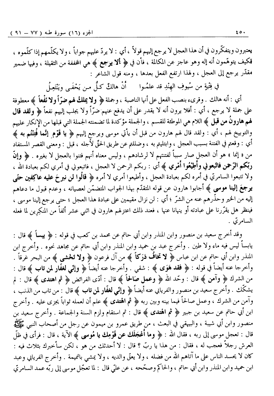 من الشِّرْكِ وَآمَنَ قَالَ: وَحَّدَ اللَّهَ وَعَمِلَ صالِحاً قَالَ: أَدَّى الْفَرَائِضَ ثُمَّ اهْتَدى قَالَ: لَمْ يُشَكِّكْ. وَأَخْرَجَ سَعِيدُ بْنُ مَنْصُورٍ وَالْفِرْيَابِيُّ عَنْهُ أيضا وَإِنِّي لَغَفَّارٌ لِمَنْ تابَ قال: من تَابَ مِنَ الذَّنْبِ، وَآمَنَ مِنَ الشِّرْكِ، وَعَمِلَ صَالِحًا فِيمَا بَيْنَهُ وَبَيْنَ رَبِّهِ ثُمَّ اهْتَدى عَلِمَ أَنَّ لِعَمَلِهِ ثَوَابًا يُجْزَى عَلَيْهِ. وَأَخْرَجَ ابْنُ أَبِي حَاتِمٍ عَنْ سَعِيدِ بْنِ جُبَيْرٍ ثُمَّ اهْتَدى قال: ثم استقام ولزم السُّنَّةَ وَالْجَمَاعَةَ. وَأَخْرَجَ سَعِيدُ بْنُ مَنْصُورٍ وَابْنُ أَبِي شَيْبَةَ، وَالْبَيْهَقِيُّ فِي الْبَعْثِ، مِنْ طَرِيقِ عَمْرِو بْنِ مَيْمُونٍ عَنْ رَجُلٍ مِنْ أَصْحَابِ النَّبِيِّ صَلَّى اللَّهُ عَلَيْهِ وَسَلَّمَ قَالَ: تَعَجَّلَ مُوسَى إِلَى رَبِّهِ، فَقَالَ الله: وَما أَعْجَلَكَ عَنْ قَوْمِكَ يا مُوسى الْآيَةَ، قَالَ: فَرَأَى فِي ظِلِّ الْعَرْشِ رَجُلًا فَعَجِبَ لَهُ، فَقَالَ: مَنْ هَذَا يَا رَبِّ؟ قَالَ: لَا أُحَدِّثُكَ مَنْ هُوَ، لَكِنْ سَأُخْبِرُكَ بِثَلَاثٍ فِيهِ: