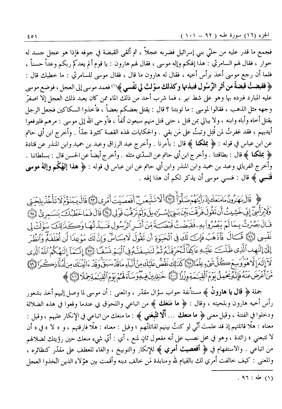 قالَ يا هارُونُ ما مَنَعَكَ إِذْ رَأَيْتَهُمْ ضَلُّوا (92) أَلاَّ تَتَّبِعَنِ أَفَعَصَيْتَ أَمْرِي (93) قالَ يَا بْنَ أُمَّ لَا تَأْخُذْ بِلِحْيَتِي وَلا بِرَأْسِي إِنِّي خَشِيتُ أَنْ تَقُولَ فَرَّقْتَ بَيْنَ بَنِي إِسْرائِيلَ وَلَمْ تَرْقُبْ قَوْلِي (94) قالَ فَما خَطْبُكَ يَا سامِرِيُّ (95) قالَ بَصُرْتُ بِما لَمْ يَبْصُرُوا بِهِ فَقَبَضْتُ قَبْضَةً مِنْ أَثَرِ الرَّسُولِ فَنَبَذْتُها وَكَذلِكَ سَوَّلَتْ لِي نَفْسِي (96)
