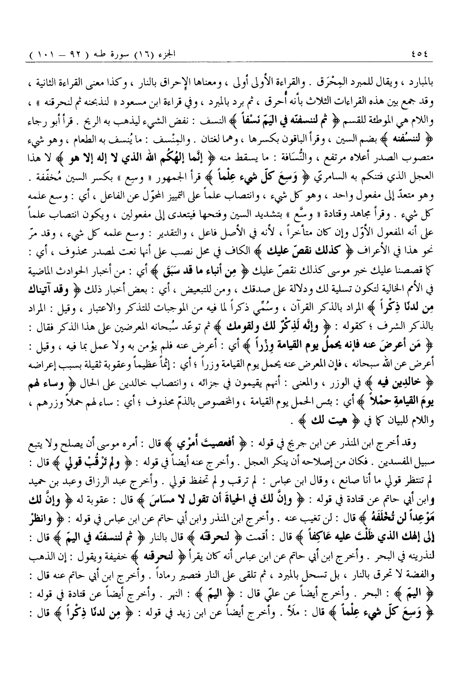 لَنَذْرِيَنَّهُ فِي الْبَحْرِ. وَأَخْرَجَ ابْنُ أَبِي حَاتِمٍ عَنِ ابْنِ عَبَّاسٍ أَنَّهُ كَانَ يَقْرَأُ لَنُحَرِّقَنَّهُ خَفِيفَةٌ وَيَقُولُ: إِنَّ الذَّهَبَ وَالْفِضَّةَ لَا تُحْرَقُ بِالنَّارِ، بَلْ تُسْحَلُ بِالْمِبْرَدِ، ثُمَّ تُلْقَى عَلَى النَّارِ فَتَصِيرُ رَمَادًا. وَأَخْرَجَ ابْنُ أَبِي حَاتِمٍ عَنْهُ قَالَ: