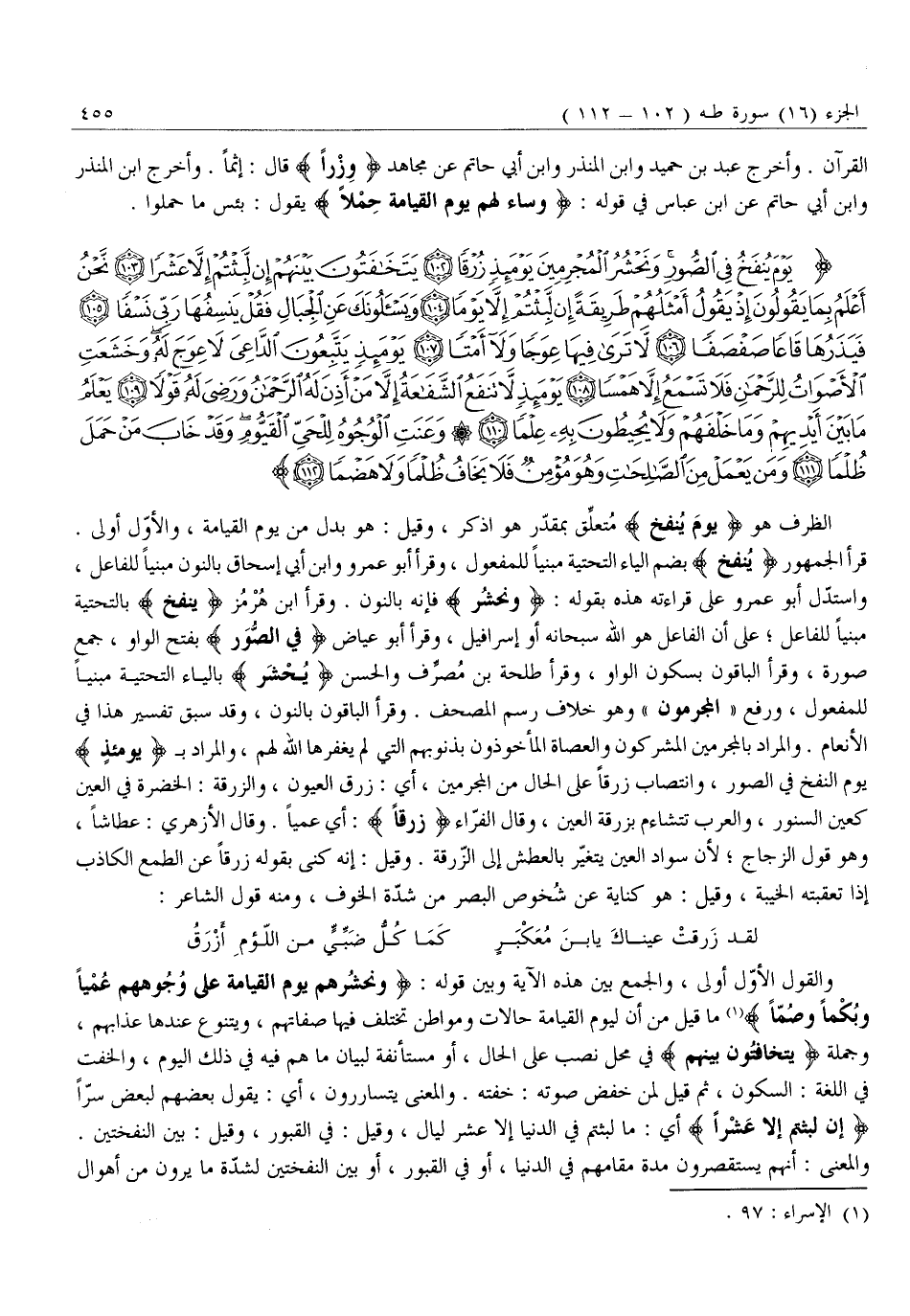 يَوْمَ يُنْفَخُ فِي الصُّورِ وَنَحْشُرُ الْمُجْرِمِينَ يَوْمَئِذٍ زُرْقاً (102) يَتَخافَتُونَ بَيْنَهُمْ إِنْ لَبِثْتُمْ إِلاَّ عَشْراً (103) نَحْنُ أَعْلَمُ بِما يَقُولُونَ إِذْ يَقُولُ أَمْثَلُهُمْ طَرِيقَةً إِنْ لَبِثْتُمْ إِلاَّ يَوْماً (104) وَيَسْئَلُونَكَ عَنِ الْجِبالِ فَقُلْ يَنْسِفُها رَبِّي نَسْفاً (105) فَيَذَرُها قَاعًا صَفْصَفاً (106)