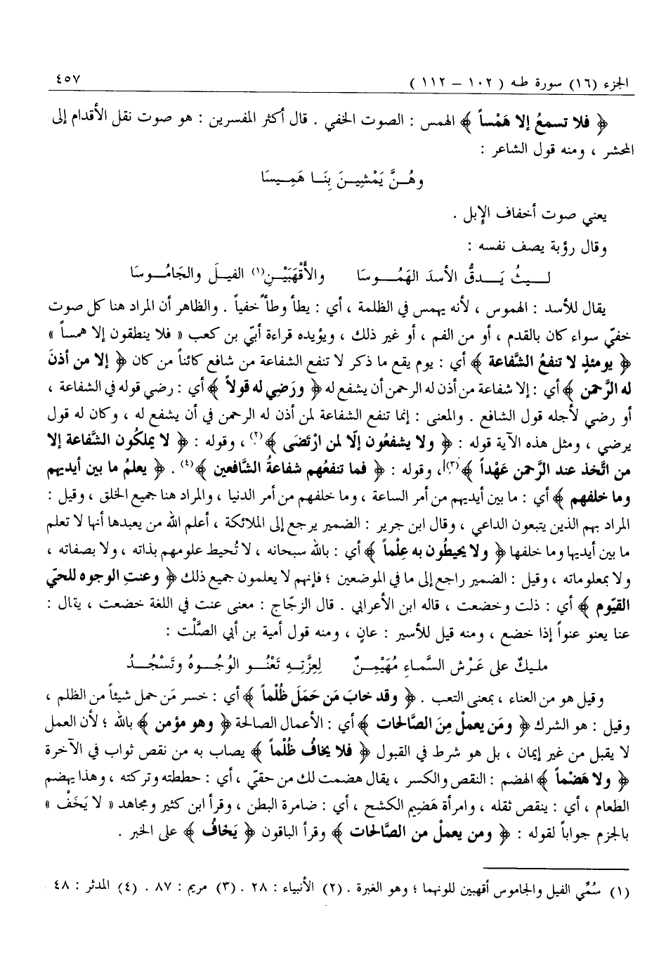يُقَالُ لِلْأُسْدِ: الْهَمُوسُ، لِأَنَّهُ يَهْمِسُ في الظلمة، أي: يطأ وطأ خفيا. وَالظَّاهِرُ أَنَّ الْمُرَادَ هُنَا كُلُّ صَوْتٍ خَفِيٍّ سَوَاءٌ كَانَ بِالْقَدَمِ، أَوْ مِنَ الْفَمِ، أَوْ غَيْرِ ذَلِكَ، وَيُؤَيِّدُهُ قِرَاءَةُ أُبَيِّ بْنِ كَعْبٍ «فَلَا يَنْطِقُونَ إِلَّا هَمْسًا» يَوْمَئِذٍ لَا تَنْفَعُ الشَّفاعَةُ أَيْ: يَوْمَ يَقَعُ مَا ذَكَرَ لَا تنفع الشفاعة من شافع كائنا من كَانَ إِلَّا مَنْ أَذِنَ لَهُ الرَّحْمنُ أَيْ: إِلَّا شَفَاعَةَ مِنْ أَذِنَ لَهُ الرَّحْمَنُ أَنْ يَشْفَعَ لَهُ وَرَضِيَ لَهُ قَوْلًا أَيْ: رَضِيَ قَوْلَهُ فِي الشَّفَاعَةِ، أَوْ رَضِيَ لِأَجْلِهِ قَوْلَ الشَّافِعِ. وَالْمَعْنَى: إِنَّمَا تَنْفَعُ الشَّفَاعَةُ لِمَنْ أَذِنَ لَهُ الرَّحْمَنُ فِي أَنْ يُشْفَعَ لَهُ، وَكَانَ لَهُ قَوْلٌ يُرْضَى، وَمِثْلُ هَذِهِ الْآيَةِ قَوْلُهُ: وَلا يَشْفَعُونَ إِلَّا لِمَنِ ارْتَضى «2» ، وَقَوْلُهُ: لَا يَمْلِكُونَ الشَّفاعَةَ إِلَّا مَنِ اتَّخَذَ عِنْدَ الرَّحْمنِ عَهْداً «3» ، وقوله: فَما تَنْفَعُهُمْ شَفاعَةُ الشَّافِعِينَ «4» . يَعْلَمُ مَا بَيْنَ أَيْدِيهِمْ وَما خَلْفَهُمْ أَيْ: مَا بَيْنَ أَيْدِيهِمْ مِنْ أَمْرِ السَّاعَةِ، وَمَا خَلْفَهُمْ مِنْ أَمْرِ الدُّنْيَا، وَالْمُرَادُ هُنَا جَمِيعُ الْخَلْقِ، وَقِيلَ: