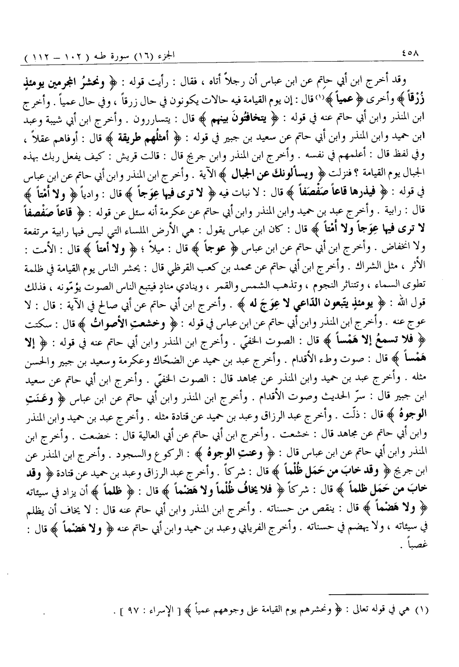 الْأَثَرُ، مِثْلُ الشِّرَاكِ. وَأَخْرَجَ ابْنُ أَبِي حَاتِمٍ عَنْ مُحَمَّدِ بْنِ كَعْبٍ الْقُرَظِيِّ قَالَ: يُحْشَرُ النَّاسُ يَوْمَ الْقِيَامَةِ فِي ظُلْمَةٍ تَطْوِي السَّمَاءَ، وَتَتَنَاثَرُ النُّجُومُ، وَتَذْهَبُ الشَّمْسُ وَالْقَمَرُ، وَيُنَادِي مُنَادٍ فَيَتَّبِعُ الناس الصوت يؤمّونه، فَذَلِكَ قَوْلُ اللَّهِ: يَوْمَئِذٍ يَتَّبِعُونَ الدَّاعِيَ لَا عِوَجَ لَهُ. وَأَخْرَجَ ابْنُ أَبِي حَاتِمٍ عَنْ أَبِي صَالِحٍ فِي الْآيَةِ: قَالَ: لَا عِوَجَ عَنْهُ. وَأَخْرَجَ ابْنُ الْمُنْذِرِ وَابْنُ أَبِي حَاتِمٍ عَنِ ابْنِ عَبَّاسٍ فِي قَوْلِهِ: وَخَشَعَتِ الْأَصْواتُ قال: سكتت فَلا تَسْمَعُ إِلَّا هَمْساً قَالَ: الصَّوْتُ الْخَفِيُّ. وَأَخْرَجَ ابْنُ الْمُنْذِرِ وَابْنُ أَبِي حَاتِمٍ عَنْهُ فِي قَوْلِهِ: إِلَّا هَمْساً قَالَ: صَوْتُ وَطْءِ الْأَقْدَامِ. وَأَخْرَجَ عَبْدُ بْنُ حُمَيْدٍ عَنِ الضَّحَّاكِ وَعِكْرِمَةَ وَسَعِيدِ بْنِ جُبَيْرٍ وَالْحَسَنِ مِثْلَهُ. وَأَخْرَجَ عَبْدُ بْنُ حُمَيْدٍ وَابْنُ الْمُنْذِرِ عَنْ مُجَاهِدٍ قَالَ: الصَّوْتُ الْخَفِيُّ. وَأَخْرَجَ ابْنُ أَبِي حَاتِمٍ عَنْ سَعِيدِ ابْنِ جُبَيْرٍ قَالَ: سِرُّ الْحَدِيثِ وَصَوْتُ الْأَقْدَامِ. وَأَخْرَجَ ابْنُ الْمُنْذِرِ وَابْنُ أَبِي حَاتِمٍ عَنِ ابن عَبَّاسٍ وَعَنَتِ الْوُجُوهُ قَالَ: ذَلَّتْ. وَأَخْرَجَ عَبْدُ الرَّزَّاقِ وَعَبْدُ بْنُ حُمَيْدٍ عَنْ قَتَادَةَ مِثْلَهُ. وَأَخْرَجَ عَبْدُ بْنُ حُمَيْدٍ وَابْنُ الْمُنْذِرِ وَابْنُ أَبِي حَاتِمٍ عَنْ مُجَاهِدٍ قَالَ: خَشَعَتْ. وَأَخْرَجَ ابْنُ أَبِي حَاتِمٍ عَنْ أَبِي الْعَالِيَةِ قَالَ: خَضَعَتْ. وَأَخْرَجَ ابْنُ الْمُنْذِرِ وَابْنُ أَبِي حَاتِمٍ عَنِ ابْنِ عَبَّاسٍ قَالَ: وَعَنَتِ الْوُجُوهُ: الرُّكُوعُ وَالسُّجُودُ. وَأَخْرَجَ ابْنُ الْمُنْذِرِ عَنِ ابْنِ جُرَيْجٍ وَقَدْ خابَ مَنْ حَمَلَ ظُلْماً قَالَ: شِرْكًا. وَأَخْرَجَ عَبْدُ الرَّزَّاقِ وَعَبْدُ بْنُ حُمَيْدٍ عَنْ قَتَادَةَ وَقَدْ خابَ مَنْ حَمَلَ ظُلْماً قَالَ: شِرْكًا فَلا يَخافُ ظُلْماً وَلا هَضْماً قَالَ: ظُلْماً أَنْ يُزَادَ فِي سَيِّئَاتِهِ وَلا هَضْماً قَالَ: يُنْقَصُ مِنْ حَسَنَاتِهِ. وَأَخْرَجَ ابْنُ الْمُنْذِرِ وَابْنُ أَبِي حَاتِمٍ عَنْهُ قَالَ: لَا يَخَافُ أَنْ يُظْلَمَ فِي سَيِّئَاتِهِ، وَلَا يُهْضَمَ فِي حَسَنَاتِهِ. وَأَخْرَجَ الْفِرْيَابِيُّ وَعَبْدُ بْنُ حُمَيْدٍ وَابْنُ أَبِي حَاتِمٍ عَنْهُ وَلا هَضْماً قَالَ: