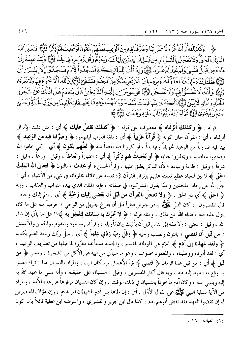 وَكَذلِكَ أَنْزَلْناهُ قُرْآناً عَرَبِيًّا وَصَرَّفْنا فِيهِ مِنَ الْوَعِيدِ لَعَلَّهُمْ يَتَّقُونَ أَوْ يُحْدِثُ لَهُمْ ذِكْراً (113) فَتَعالَى اللَّهُ الْمَلِكُ الْحَقُّ وَلا تَعْجَلْ بِالْقُرْآنِ مِنْ قَبْلِ أَنْ يُقْضى إِلَيْكَ وَحْيُهُ وَقُلْ رَبِّ زِدْنِي عِلْماً (114) وَلَقَدْ عَهِدْنا إِلى آدَمَ مِنْ قَبْلُ فَنَسِيَ وَلَمْ نَجِدْ لَهُ عَزْماً (115) وَإِذْ قُلْنا لِلْمَلائِكَةِ اسْجُدُوا لِآدَمَ فَسَجَدُوا إِلاَّ إِبْلِيسَ أَبى (116) فَقُلْنا يَا آدَمُ إِنَّ هَذَا عَدُوٌّ لَكَ وَلِزَوْجِكَ فَلا يُخْرِجَنَّكُما مِنَ الْجَنَّةِ فَتَشْقى (117)