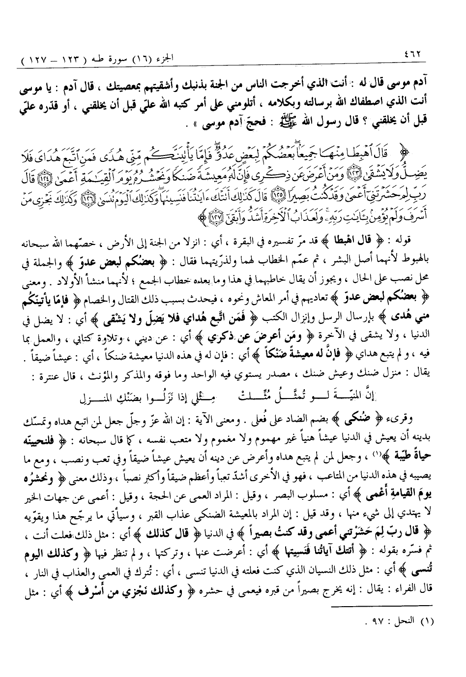 قالَ اهْبِطا مِنْها جَمِيعاً بَعْضُكُمْ لِبَعْضٍ عَدُوٌّ فَإِمَّا يَأْتِيَنَّكُمْ مِنِّي هُدىً فَمَنِ اتَّبَعَ هُدايَ فَلا يَضِلُّ وَلا يَشْقى (123) وَمَنْ أَعْرَضَ عَنْ ذِكْرِي فَإِنَّ لَهُ مَعِيشَةً ضَنْكاً وَنَحْشُرُهُ يَوْمَ الْقِيامَةِ أَعْمى (124) قالَ رَبِّ لِمَ حَشَرْتَنِي أَعْمى وَقَدْ كُنْتُ بَصِيراً (125) قالَ كَذلِكَ أَتَتْكَ آياتُنا فَنَسِيتَها وَكَذلِكَ الْيَوْمَ تُنْسى (126) وَكَذلِكَ نَجْزِي مَنْ أَسْرَفَ وَلَمْ يُؤْمِنْ بِآياتِ رَبِّهِ وَلَعَذابُ الْآخِرَةِ أَشَدُّ وَأَبْقى (127)