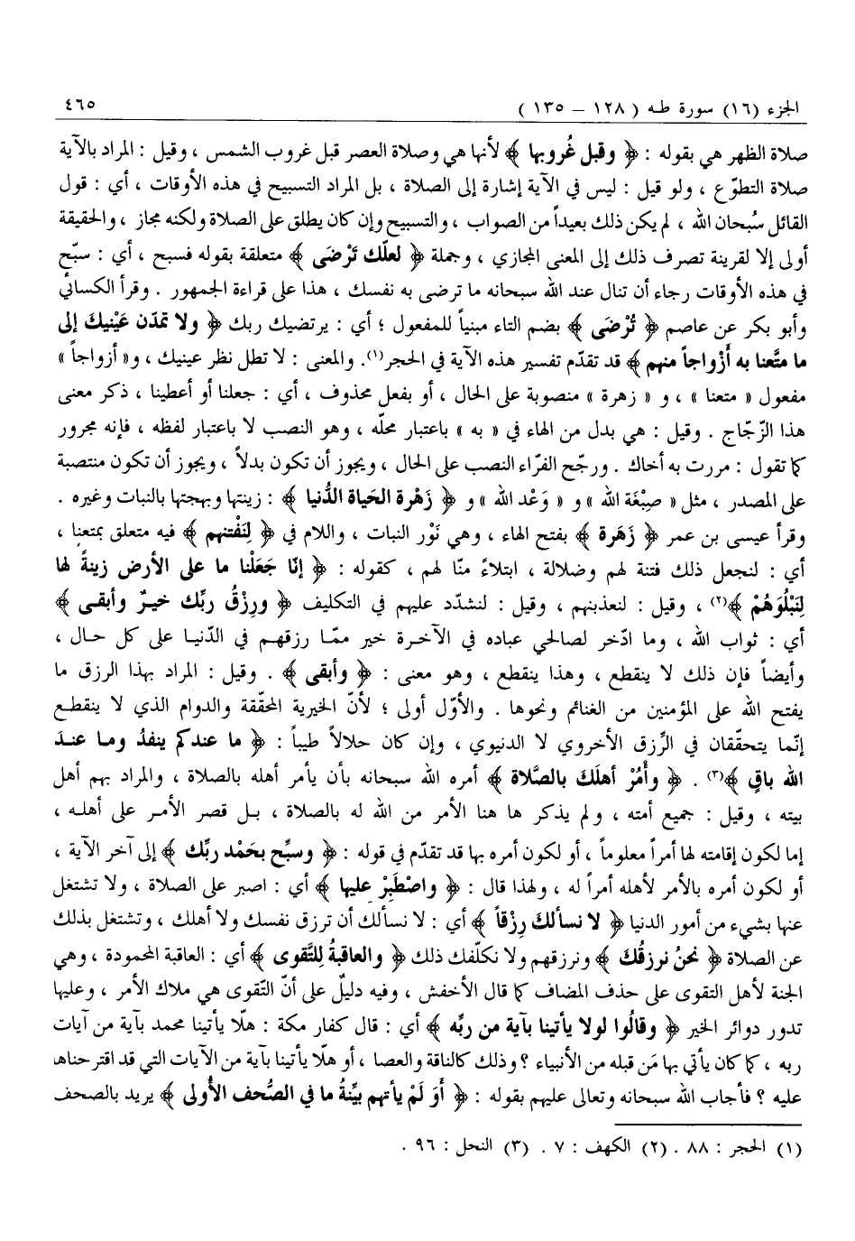 صَلَاةِ الظُّهْرِ هِيَ بِقَوْلِهِ: وَقَبْلَ غُرُوبِها لِأَنَّهَا هِيَ وَصَلَاةُ الْعَصْرِ قَبْلَ غُرُوبِ الشَّمْسِ، وَقِيلَ: الْمُرَادُ بِالْآيَةِ صَلَاةُ التَّطَوُّعِ، وَلَوْ قِيلَ: لَيْسَ فِي الْآيَةِ إِشَارَةٌ إِلَى الصَّلَاةِ، بَلِ الْمُرَادُ التَّسْبِيحُ فِي هَذِهِ الْأَوْقَاتِ، أَيْ: قَوْلُ الْقَائِلِ سُبْحَانَ اللَّهِ، لَمْ يَكُنْ ذَلِكَ بَعِيدًا مِنَ الصواب، والتسبيح وَإِنْ كَانَ يُطْلَقُ عَلَى الصَّلَاةِ وَلَكِنَّهُ مَجَازٌ، وَالْحَقِيقَةُ أَوْلَى إِلَّا لِقَرِينَةٍ تَصْرِفُ ذَلِكَ إِلَى الْمَعْنَى الْمَجَازِيِّ، وَجُمْلَةُ لَعَلَّكَ تَرْضى مُتَعَلِّقَةٌ بِقَوْلِهِ فَسَبِّحْ، أَيْ: سَبِّحْ فِي هَذِهِ الْأَوْقَاتِ رَجَاءَ أَنْ تَنَالَ عِنْدَ اللَّهِ سُبْحَانَهُ مَا تَرْضَى بِهِ نَفْسُكَ، هَذَا عَلَى قِرَاءَةِ الْجُمْهُورِ. وَقَرَأَ الْكِسَائِيُّ وَأَبُو بَكْرٍ عَنْ عَاصِمٍ تُرْضَى بِضَمِّ التَّاءِ مَبْنِيًّا لِلْمَفْعُولِ أَيْ: يَرْتَضِيكَ رَبُّكَ وَلا تَمُدَّنَّ عَيْنَيْكَ إِلى مَا مَتَّعْنا بِهِ أَزْواجاً مِنْهُمْ قَدْ تَقَدَّمَ تَفْسِيرُ هَذِهِ الْآيَةِ فِي الحجر «1» . والمعنى: لا تطل نظر عينيك، و «أَزْواجاً» مفعول «متعنا» ، و «زهرة» مَنْصُوبَةٌ عَلَى الْحَالِ، أَوْ بِفِعْلٍ مَحْذُوفٍ، أَيْ: جَعَلْنَا أَوْ أَعْطَيْنَا، ذَكَرَ مَعْنَى هَذَا الزَّجَّاجُ. وَقِيلَ: هِيَ بَدَلٌ مِنَ الْهَاءِ فِي «بِهِ» بِاعْتِبَارِ مَحَلِّهِ، وَهُوَ النَّصْبُ لَا بِاعْتِبَارِ لَفْظِهِ، فَإِنَّهُ مَجْرُورٌ كَمَا تَقُولُ: مَرَرْتُ بِهِ أَخَاكَ. وَرَجَّحَ الْفَرَّاءُ النَّصْبَ عَلَى الْحَالِ، وَيَجُوزُ أَنْ تَكُونَ بَدَلًا، وَيَجُوزُ أَنْ تَكُونَ مُنْتَصِبَةً عَلَى الْمَصْدَرِ، مِثْلَ «صِبْغَةَ اللَّهِ» وَ «وَعَدَ اللَّهُ» وزَهْرَةَ الْحَياةِ الدُّنْيا: زِينَتُهَا وَبَهْجَتُهَا بِالنَّبَاتِ وَغَيْرِهِ.