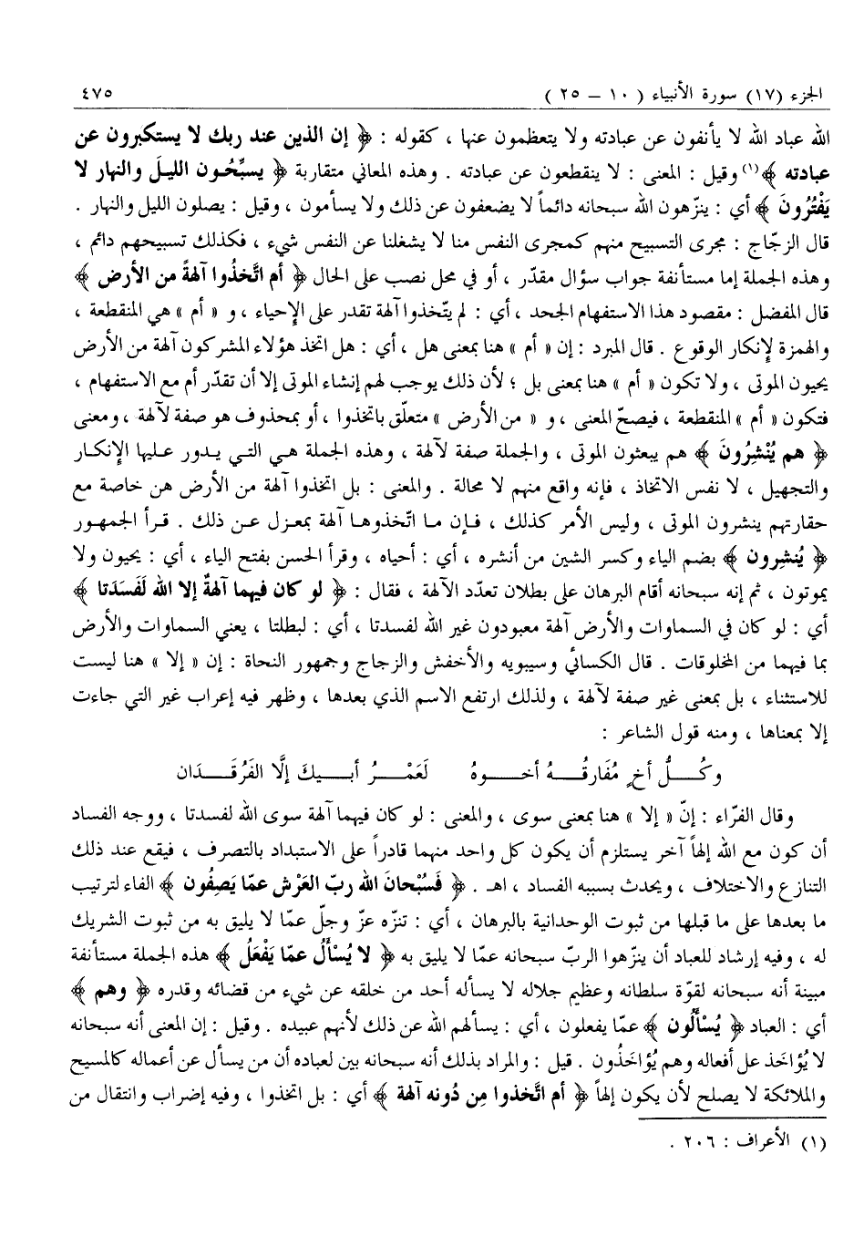 قَالَ الزَّجَّاجُ: مَجْرَى التَّسْبِيحِ مِنْهُمْ كَمَجْرَى النَّفْسِ مِنَّا لَا يَشْغَلُنَا عَنِ النَّفَسِ شَيْءٌ، فَكَذَلِكَ تَسْبِيحُهُمْ دَائِمٌ، وَهَذِهِ الْجُمْلَةُ إِمَّا مُسْتَأْنَفَةٌ جَوَابُ سُؤَالٍ مُقَدَّرٍ، أَوْ فِي مَحَلِّ نَصْبٍ عَلَى الْحَالِ أَمِ اتَّخَذُوا آلِهَةً مِنَ الْأَرْضِ قَالَ الْمُفَضَّلُ: مَقْصُودُ هَذَا الِاسْتِفْهَامِ الْجَحْدُ، أَيْ: لم يتّخذوا آلهة تقدر على الإحياء، و «أم» هِيَ الْمُنْقَطِعَةُ، وَالْهَمْزَةُ لِإِنْكَارِ الْوُقُوعِ. قَالَ الْمُبَرِّدُ: إِنَّ «أَمْ» هُنَا بِمَعْنَى هَلْ، أَيْ: هَلِ اتَّخَذَ هَؤُلَاءِ الْمُشْرِكُونَ آلِهَةً مِنَ الْأَرْضِ يُحْيُونَ الْمَوْتَى، وَلَا تَكُونُ «أَمْ» هُنَا بِمَعْنَى بَلْ لِأَنَّ ذَلِكَ يُوجِبُ لَهُمْ إِنْشَاءَ الْمَوْتَى إِلَّا أَنْ تُقَدَّرَ أَمْ مَعَ الِاسْتِفْهَامِ، فَتَكُونُ «أَمِ» المنقطعة، فيصحّ المعنى، و «من الْأَرْضِ» مُتَعَلِّقٌ بِاتَّخَذُوا، أَوْ بِمَحْذُوفٍ هُوَ صِفَةٌ لِآلِهَةٍ، وَمَعْنَى هُمْ يُنْشِرُونَ هُمْ يَبْعَثُونَ الْمَوْتَى، وَالْجُمْلَةُ صِفَةٌ لِآلِهَةٍ، وَهَذِهِ الْجُمْلَةُ هِيَ الَّتِي يَدُورُ عَلَيْهَا الْإِنْكَارُ وَالتَّجْهِيلُ، لَا نَفْسُ الِاتِّخَاذِ، فَإِنَّهُ وَاقِعٌ مِنْهُمْ لَا مَحَالَةَ. وَالْمَعْنَى: بَلِ اتخذوا آلهة من الأرض هن خَاصَّةً مَعَ حَقَارَتِهِمْ يُنْشِرُونَ الْمَوْتَى، وَلَيْسَ الْأَمْرُ كَذَلِكَ، فَإِنَّ مَا اتَّخَذُوهَا آلِهَةً بِمَعْزِلٍ عَنْ ذَلِكَ. قَرَأَ الْجُمْهُورُ يُنْشِرُونَ بِضَمِّ الْيَاءِ وَكَسْرِ الشِّينِ مِنْ أَنْشَرَهُ، أَيْ: أَحْيَاهُ، وَقَرَأَ الْحَسَنُ بِفَتْحِ الْيَاءِ، أَيْ: يَحْيَوْنَ وَلَا يَمُوتُونَ، ثُمَّ إِنَّهُ سُبْحَانَهُ أَقَامَ الْبُرْهَانَ عَلَى بُطْلَانِ تَعَدُّدِ الْآلِهَةِ، فَقَالَ: لَوْ كانَ فِيهِما آلِهَةٌ إِلَّا اللَّهُ لَفَسَدَتا أَيْ: لَوْ كَانَ فِي السَّمَاوَاتِ وَالْأَرْضِ آلِهَةٌ مَعْبُودُونَ غَيْرُ اللَّهِ لَفَسَدَتَا، أَيْ: لَبَطَلَتَا، يَعْنِي السَّمَاوَاتِ وَالْأَرْضَ بِمَا فِيهِمَا مِنَ الْمَخْلُوقَاتِ. قَالَ الْكِسَائِيُّ وَسِيبَوَيْهِ وَالْأَخْفَشُ وَالزَّجَّاجُ وَجُمْهُورُ النُّحَاةِ: إِنَّ «إِلَّا» هُنَا لَيْسَتْ لِلِاسْتِثْنَاءِ، بَلْ بِمَعْنَى غَيْرُ صِفَةٌ لِآلِهَةٍ، وَلِذَلِكَ ارْتَفَعَ الِاسْمُ الَّذِي بَعْدَهَا، وَظَهَرَ فِيهِ إِعْرَابُ غَيْرُ الَّتِي جَاءَتْ إِلَّا بِمَعْنَاهَا، وَمِنْهُ قَوْلُ الشَّاعِرِ: