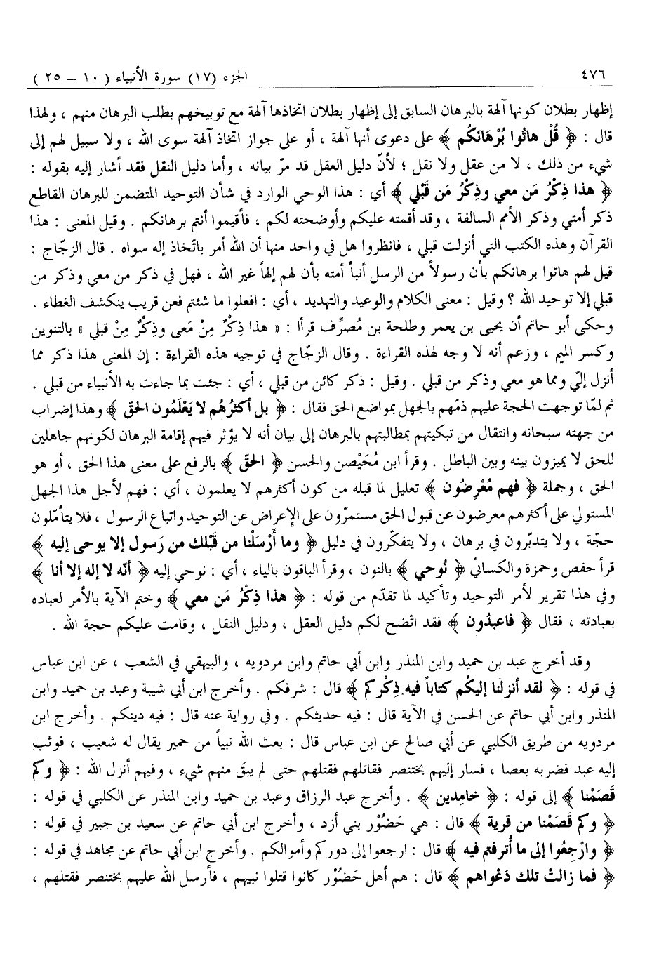 هَذَا ذِكْرُ مَنْ مَعِيَ وَذِكْرُ مَنْ قَبْلِي أَيْ: هَذَا الْوَحْيُ الْوَارِدُ فِي شَأْنِ التَّوْحِيدِ الْمُتَضَمِّنِ لِلْبُرْهَانِ الْقَاطِعِ ذِكْرُ أُمَّتِي وَذِكْرُ الْأُمَمِ السَّالِفَةِ، وَقَدْ أَقَمْتُهُ عَلَيْكُمْ وَأَوْضَحْتُهُ لَكُمْ، فَأَقِيمُوا أَنْتُمْ بُرْهَانَكُمْ. وَقِيلَ الْمَعْنَى: هَذَا الْقُرْآنُ وَهَذِهِ الْكُتُبُ الَّتِي أُنْزِلَتْ قَبْلِي، فَانْظُرُوا هَلْ فِي وَاحِدٍ مِنْهَا أَنَّ اللَّهَ أَمَرَ بِاتِّخَاذِ إِلَهٍ سِوَاهُ. قَالَ الزَّجَّاجُ: