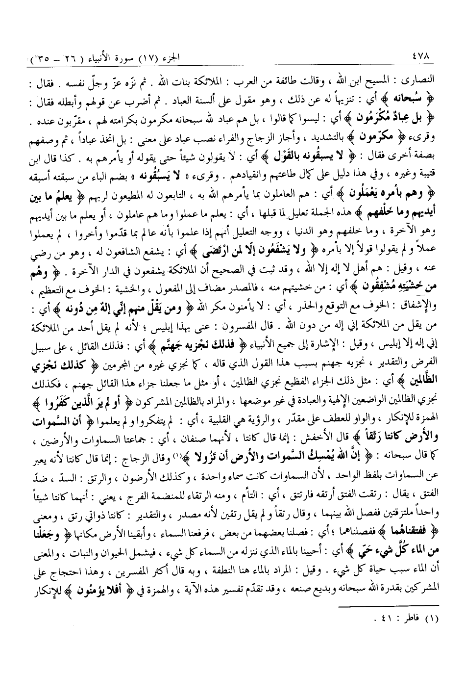 مِنْ يَقُلْ مِنَ الْمَلَائِكَةِ إِنِّي إِلَهٌ مَنْ دُونِ اللَّهِ. قَالَ الْمُفَسِّرُونَ: عَنَى بِهَذَا إِبْلِيسَ لِأَنَّهُ لَمْ يَقُلْ أَحَدٌ مِنَ الْمَلَائِكَةِ إِنِّي إِلَهٌ إِلَّا إِبْلِيسَ، وَقِيلَ: الْإِشَارَةُ إِلَى جَمِيعِ الْأَنْبِيَاءِ فَذلِكَ نَجْزِيهِ جَهَنَّمَ أَيْ: فَذَلِكَ الْقَائِلُ، عَلَى سَبِيلِ الْفَرْضِ وَالتَّقْدِيرِ، نَجْزِيهِ جَهَنَّمَ بِسَبَبِ هَذَا الْقَوْلِ الَّذِي قَالَهُ، كَمَا نَجْزِي غَيْرَهُ مِنَ الْمُجْرِمِينَ كَذلِكَ نَجْزِي الظَّالِمِينَ أَيْ: مِثْلَ ذَلِكَ الْجَزَاءِ الْفَظِيعِ نَجْزِي الظَّالِمِينَ، أَوْ مِثْلَ مَا جَعَلْنَا جَزَاءَ هَذَا الْقَائِلَ جَهَنَّمَ، فَكَذَلِكَ نَجْزِي الظَّالِمِينَ الْوَاضِعِينَ الْإِلَهِيَّةَ وَالْعِبَادَةَ فِي غَيْرِ مَوْضِعِهَا، وَالْمُرَادُ بِالظَّالِمِينَ الْمُشْرِكُونَ أَوَلَمْ يَرَ الَّذِينَ كَفَرُوا الْهَمْزَةُ لِلْإِنْكَارِ، وَالْوَاوُ لِلْعَطْفِ عَلَى مقدّر، والرؤية هي القلبية، أي: لم يتفكروا ولم يَعْلَمُوا أَنَّ السَّماواتِ وَالْأَرْضَ كانَتا رَتْقاً قَالَ الْأَخْفَشُ: إِنَّمَا قَالَ كَانَتَا، لِأَنَّهُمَا صِنْفَانِ، أَيْ: جَمَاعَتَا السَّمَاوَاتِ وَالْأَرَضِينَ، كَمَا قَالَ سُبْحَانَهُ: إِنَّ اللَّهَ يُمْسِكُ السَّماواتِ وَالْأَرْضَ أَنْ تَزُولا «1» وَقَالَ الزَّجَّاجُ: إِنَّمَا قَالَ كَانَتَا لِأَنَّهُ يُعَبِّرُ عَنِ السَّمَاوَاتِ بِلَفْظِ الْوَاحِدِ، لِأَنَّ السَّمَاوَاتِ كَانَتْ سَمَاءً وَاحِدَةً، وَكَذَلِكَ الْأَرَضُونَ، وَالرَّتْقُ: السَّدُّ، ضِدُّ الْفَتْقِ، يُقَالُ: رَتَقْتُ الْفَتْقَ أَرْتُقُهُ فَارْتَتَقَ، أَيِ: الْتَأَمَ، وَمِنْهُ الرَّتْقَاءُ لِلْمُنْضَمَّةِ الْفَرْجِ، يَعْنِي: أَنَّهُمَا كَانَتَا شَيْئًا وَاحِدًا مُلْتَزِقَتَيْنِ فَفَصَلَ اللَّهُ بَيْنَهُمَا، وَقَالَ رَتْقًا وَلَمْ يَقُلْ رَتْقَيْنِ لِأَنَّهُ مَصْدَرٌ، وَالتَّقْدِيرُ: كَانَتَا ذَوَاتِي رَتْقٍ، وَمَعْنَى فَفَتَقْناهُما فَفَصَلْنَاهُمَا أَيْ: فَصَلْنَا بَعْضَهُمَا مِنْ بَعْضٍ، فَرَفَعْنَا السَّمَاءَ، وَأَبْقَيْنَا الْأَرْضَ مَكَانَهَا وَجَعَلْنا مِنَ الْماءِ كُلَّ شَيْءٍ حَيٍّ أَيْ: أَحْيَيْنَا بِالْمَاءِ الَّذِي نُنْزِلُهُ مِنَ السَّمَاءِ كُلَّ شَيْءٍ، فَيَشْمَلُ الْحَيَوَانَ وَالنَّبَاتَ، وَالْمَعْنَى أَنَّ الْمَاءَ سَبَبُ حَيَاةِ كُلِّ شَيْءٍ. وَقِيلَ: الْمُرَادُ بِالْمَاءِ هُنَا النُّطْفَةُ، وَبِهِ قَالَ أَكْثَرُ الْمُفَسِّرِينَ، وَهَذَا احْتِجَاجٌ عَلَى الْمُشْرِكِينَ بِقُدْرَةِ اللَّهِ سُبْحَانَهُ وَبَدِيعِ صُنْعِهِ، وَقَدْ تَقَدَّمَ تَفْسِيرُ هَذِهِ الْآيَةِ، وَالْهَمْزَةُ فِي أَفَلا يُؤْمِنُونَ لِلْإِنْكَارِ