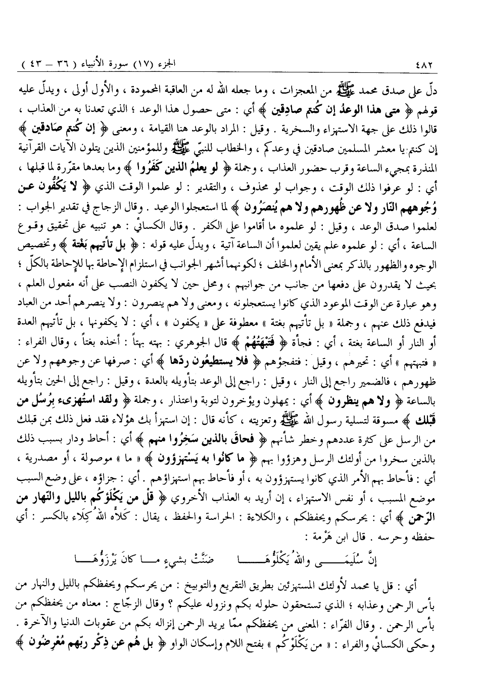 «فَتَبْهَتُهُمْ» أَيْ: تُحَيِّرُهُمْ، وَقِيلَ: فَتَفْجَؤُهُمْ فَلا يَسْتَطِيعُونَ رَدَّها أَيْ: صَرْفَهَا عَنْ وُجُوهِهِمْ وَلَا عَنْ ظُهُورِهِمْ، فَالضَّمِيرُ رَاجِعٌ إِلَى النَّارِ، وَقِيلَ: رَاجِعٌ إِلَى الْوَعْدِ بِتَأْوِيلِهِ بِالْعِدَّةِ، وَقِيلَ: رَاجِعٌ إِلَى الْحِينِ بِتَأْوِيلِهِ بِالسَّاعَةِ وَلا هُمْ يُنْظَرُونَ أَيْ: يُمْهَلُونَ وَيُؤَخَّرُونَ لِتَوْبَةٍ وَاعْتِذَارٍ، وَجُمْلَةُ وَلَقَدِ اسْتُهْزِئَ بِرُسُلٍ مِنْ قَبْلِكَ مَسُوقَةٌ لِتَسْلِيَةِ رَسُولِ اللَّهِ صَلَّى اللَّهُ عَلَيْهِ وَسَلَّمَ وَتَعْزِيَتِهِ، كَأَنَّهُ قَالَ: إِنِ اسْتَهْزَأَ بِكَ هَؤُلَاءِ فَقَدْ فُعِلَ ذَلِكَ بِمَنْ قَبْلَكَ مِنَ الرُّسُلِ عَلَى كَثْرَةِ عَدَدِهِمْ وَخَطَرِ شَأْنِهِمْ فَحاقَ بِالَّذِينَ سَخِرُوا مِنْهُمْ أَيْ: أَحَاطَ وَدَارَ بِسَبَبِ ذلك بالذين سخروا من أولئك الرسل وهزءوا بهم ما كانُوا بِهِ يَسْتَهْزِؤُنَ «مَا» مَوْصُولَةٌ، أَوْ مَصْدَرِيَّةٌ، أَيْ: فَأَحَاطَ بِهِمُ الأمر الذي كانوا يستهزءون بِهِ، أَوْ فَأَحَاطَ بِهِمُ اسْتِهْزَاؤُهُمْ. أَيْ: جَزَاؤُهُ، عَلَى وَضْعِ السَّبَبِ مَوْضِعَ الْمُسَبَّبِ، أَوْ نَفْسِ الِاسْتِهْزَاءِ، إِنْ أُرِيدَ بِهِ الْعَذَابُ الْأُخْرَوِيُّ قُلْ مَنْ يَكْلَؤُكُمْ بِاللَّيْلِ وَالنَّهارِ مِنَ الرَّحْمنِ أَيْ: يَحْرُسُكُمْ وَيَحْفَظُكُمْ، وَالْكَلَاءَةُ: الْحِرَاسَةُ وَالْحِفْظُ، يُقَالُ: كَلَأَهُ الله كلاء بِالْكَسْرِ: أَيْ حَفِظَهُ وَحَرَسَهُ. قَالَ ابْنُ هَرْمَةَ: