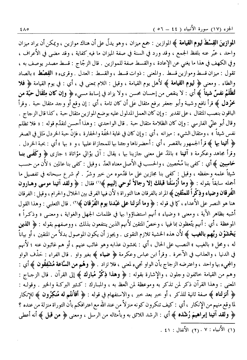 وَنَضَعُ الْمَوازِينَ الْقِسْطَ لِيَوْمِ الْقِيامَةِ الْمَوَازِينُ: جَمْعُ مِيزَانٍ، وَهُوَ يَدُلُّ عَلَى أَنَّ هُنَاكَ مَوَازِينَ، وَيُمْكِنُ أَنْ يُرَادَ مِيزَانٌ وَاحِدٌ، عَبَّرَ عَنْهُ بِلَفْظِ الْجَمْعِ، وَقَدْ وَرَدَ فِي السُّنَّةِ فِي صِفَةِ الْمِيزَانِ مَا فِيهِ كِفَايَةٌ، وَقَدْ مَضَى فِي الْأَعْرَافِ، وَفِي الْكَهْفِ فِي هَذَا مَا يُغْنِي عَنِ الْإِعَادَةِ، وَالْقِسْطِ صِفَةٌ لِلْمَوَازِينِ. قَالَ الزَّجَّاجُ: قِسْطٌ مَصْدَرٌ يُوصَفُ بِهِ، تَقُولُ: مِيزَانُ قِسْطٍ وَمَوَازِينُ قِسْطٍ. وَالْمَعْنَى: ذَوَاتُ قِسْطٍ، وَالْقِسْطُ: الْعَدْلُ. وَقُرِئَ «الْقِصْطُ» بِالصَّادِّ وَالطَّاءِ. وَمَعْنَى لِيَوْمِ الْقِيامَةِ لِأَهْلِ يَوْمِ الْقِيَامَةِ، وَقِيلَ: اللَّامُ بِمَعْنَى فِي، أَيْ: فِي يَوْمِ الْقِيَامَةِ فَلا تُظْلَمُ نَفْسٌ شَيْئاً أَيْ: لَا يُنْقَصُ مِنْ إِحْسَانِ مُحْسِنٍ، وَلَا يُزَادُ فِي إِسَاءَةِ مُسِيءٍ وَإِنْ كانَ مِثْقالَ حَبَّةٍ مِنْ خَرْدَلٍ قَرَأَ نَافِعٌ وَشَيْبَةُ وَأَبُو جَعْفَرٍ بِرَفْعِ مِثْقَالُ عَلَى أَنَّ كَانَ تَامَّةٌ، أَيْ: إِنْ وَقَعَ أَوْ وَجَدَ مِثْقَالَ حَبَّةٍ. وَقَرَأَ الْبَاقُونَ بِنَصْبِ الْمِثْقَالِ، عَلَى تَقْدِيرِ: وَإِنْ كَانَ الْعَمَلُ الْمَدْلُولُ عَلَيْهِ بِوَضْعِ الْمَوَازِينِ مِثْقَالَ حَبَّةٍ، كَذَا قَالَ الزَّجَّاجُ.