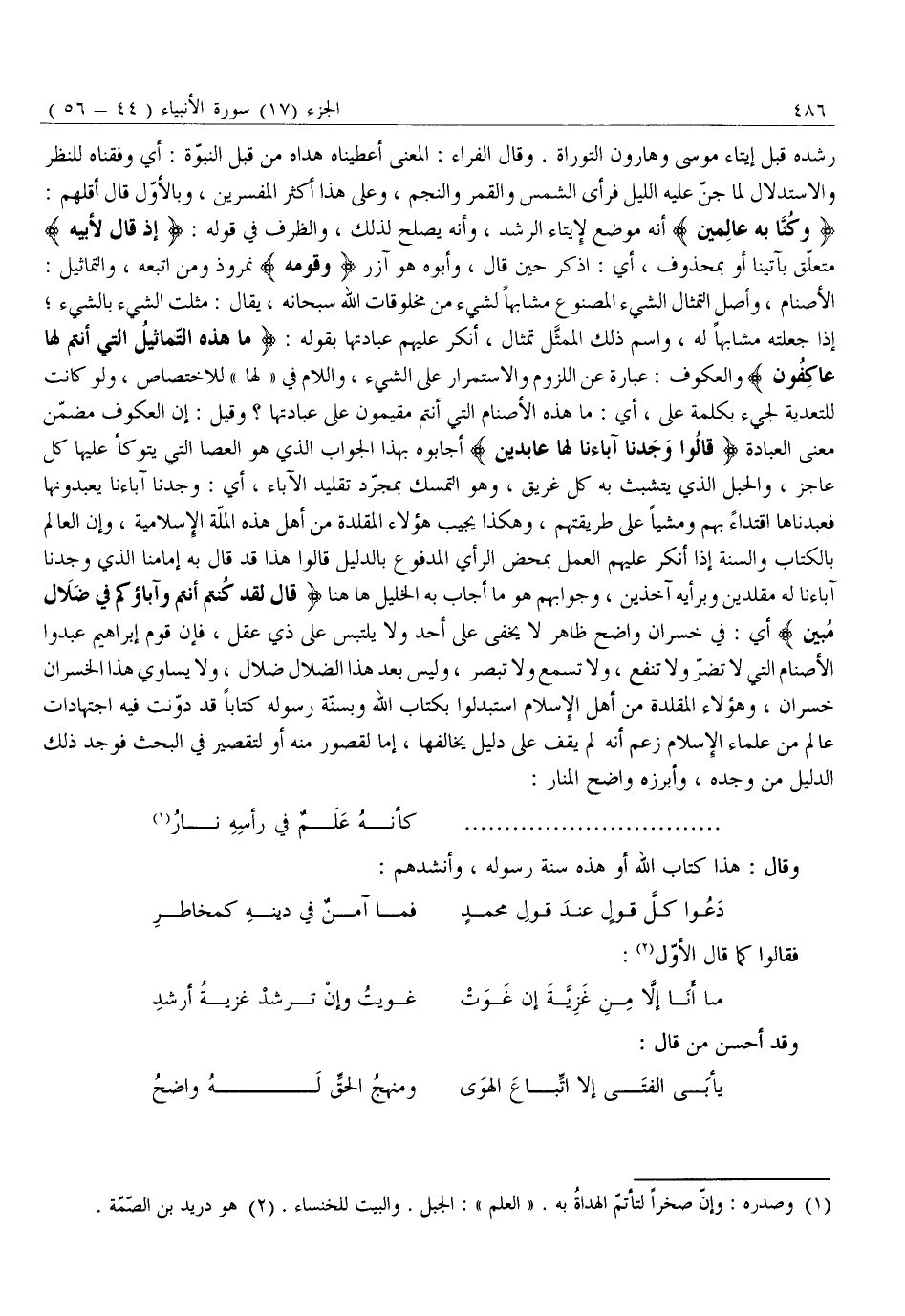 الْأَصْنَامُ، وَأَصْلُ التِّمْثَالِ الشَّيْءُ الْمَصْنُوعُ مُشَابِهًا لِشَيْءٍ مِنْ مَخْلُوقَاتِ اللَّهِ سُبْحَانَهُ، يُقَالُ: مَثَّلْتُ الشَّيْءَ بِالشَّيْءِ إِذَا جَعَلْتُهُ مُشَابِهًا لَهُ، وَاسْمُ ذَلِكَ الْمُمَثَّلِ تِمْثَالٌ، أَنْكَرَ عَلَيْهِمْ عِبَادَتَهَا بِقَوْلِهِ: مَا هذِهِ التَّماثِيلُ الَّتِي أَنْتُمْ لَها عاكِفُونَ وَالْعُكُوفُ: عِبَارَةٌ عَنِ اللُّزُومِ وَالِاسْتِمْرَارِ عَلَى الشَّيْءِ، وَاللَّامُ فِي «لَهَا» لِلِاخْتِصَاصِ، وَلَوْ كَانَتْ لِلتَّعْدِيَةِ لَجِيءَ بِكَلِمَةِ عَلَى، أَيْ: مَا هَذِهِ الْأَصْنَامُ الَّتِي أَنْتُمْ مُقِيمُونَ عَلَى عِبَادَتِهَا؟ وَقِيلَ: إِنَّ الْعُكُوفَ مُضَمَّنٌ مَعْنَى الْعِبَادَةِ قالُوا وَجَدْنا آباءَنا لَها عابِدِينَ أَجَابُوهُ بِهَذَا الْجَوَابِ الَّذِي هُوَ الْعَصَا الَّتِي يَتَوَكَّأُ عَلَيْهَا كُلُّ عَاجِزٍ، وَالْحَبْلُ الَّذِي يَتَشَبَّثُ بِهِ كُلُّ غَرِيقٍ، وَهُوَ التَّمَسُّكُ بِمُجَرَّدِ تَقْلِيدِ الْآبَاءِ، أَيْ: وَجَدْنَا آبَاءَنَا يَعْبُدُونَهَا فَعَبَدْنَاهَا اقْتِدَاءً بِهِمْ وَمَشْيًا عَلَى طَرِيقَتِهِمْ، وَهَكَذَا يُجِيبُ هَؤُلَاءِ الْمُقَلِّدَةُ مِنْ أَهْلِ هَذِهِ الْمِلَّةِ الْإِسْلَامِيَّةِ، وَإِنَّ الْعَالِمَ بِالْكِتَابِ وَالسُّنَّةِ إِذَا أَنْكَرَ عَلَيْهِمُ الْعَمَلَ بِمَحْضِ الرَّأْيِ الْمَدْفُوعِ بِالدَّلِيلِ قَالُوا هَذَا قَدْ قَالَ بِهِ إِمَامُنَا الَّذِي وَجَدْنَا آبَاءَنَا لَهُ مُقَلِّدِينَ وَبِرَأْيِهِ آخِذِينَ، وَجَوَابُهُمْ هُوَ مَا أَجَابَ بِهِ الْخَلِيلُ هَاهُنَا قالَ لَقَدْ كُنْتُمْ أَنْتُمْ وَآباؤُكُمْ فِي ضَلالٍ مُبِينٍ أَيْ: فِي خُسْرَانٍ وَاضِحٍ ظَاهِرٍ لَا يَخْفَى عَلَى أَحَدٍ وَلَا يَلْتَبِسُ عَلَى ذِي عَقْلٍ، فَإِنَّ قَوْمَ إِبْرَاهِيمَ عَبَدُوا الْأَصْنَامَ الَّتِي لَا تَضُرُّ وَلَا تَنْفَعُ، وَلَا تَسْمَعُ وَلَا تُبْصِرُ، وَلَيْسَ بَعْدَ هَذَا الضَّلَالِ ضَلَالٌ، وَلَا يُسَاوِي هَذَا الْخُسْرَانَ خُسْرَانٌ، وَهَؤُلَاءِ الْمُقَلِّدَةُ مِنْ أَهْلِ الْإِسْلَامِ اسْتَبْدَلُوا بِكِتَابِ اللَّهِ وَبِسُنَّةِ رَسُولِهِ كِتَابًا قَدْ دُوِّنَتْ فِيهِ اجْتِهَادَاتُ عَالِمٍ مِنْ عُلَمَاءِ الْإِسْلَامِ زَعَمَ أَنَّهُ لَمْ يَقِفْ عَلَى دَلِيلٍ يُخَالِفُهَا، إِمَّا لِقُصُورٍ مِنْهُ أَوْ لِتَقْصِيرٍ فِي الْبَحْثِ فَوَجَدَ ذَلِكَ الدَّلِيلَ مَنْ وَجَدَهُ، وَأَبْرَزَهُ وَاضِحُ الْمَنَارِ: