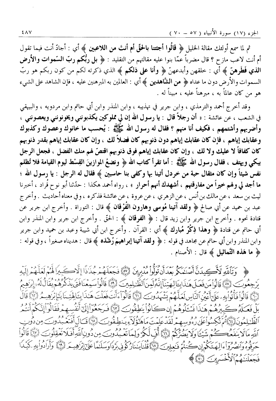 وَقَدْ أَخْرَجَ أَحْمَدُ وَالتِّرْمِذِيُّ، وَابْنُ جَرِيرٍ فِي تَهْذِيبِهِ، وَابْنُ الْمُنْذِرِ وَابْنُ أَبِي حَاتِمٍ وَابْنُ مَرْدَوَيْهِ، والبيهقي في الشعب، عَنْ عَائِشَةَ: «أَنَّ رَجُلًا قَالَ: يَا رَسُولَ اللَّهِ إِنَّ لِي مَمْلُوكِينَ يُكَذِّبُونَنِي وَيَخُونُونَنِي وَيَعْصُونَنِي، وَأَضْرِبُهُمْ وَأَشْتُمُهُمْ، فَكَيْفَ أَنَا مِنْهُمْ؟ فَقَالَ لَهُ رَسُولُ اللَّهِ صَلَّى اللَّهُ عَلَيْهِ وَسَلَّمَ: يحسب ما خانوك وعصوك وكذبوك وعقابك إِيَّاهُمْ، فَإِنْ كَانَ عِقَابُكَ إِيَّاهُمْ دُونَ ذُنُوبِهِمْ كَانَ فَضْلًا لَكَ، وَإِنْ كَانَ عِقَابُكَ إِيَّاهُمْ بِقَدْرِ ذُنُوبِهِمْ كَانَ كَفَافًا لَا عَلَيْكَ وَلَا لَكَ، وَإِنْ كَانَ عِقَابُكَ إِيَّاهُمْ فَوْقَ ذُنُوبِهِمُ اقْتُصَّ لَهُمْ مِنْكَ الْفَضْلُ، فَجَعَلَ الرَّجُلُ يَبْكِي وَيَهْتِفُ، فَقَالَ رَسُولُ اللَّهِ صَلَّى اللَّهُ عَلَيْهِ وَسَلَّمَ: أَمَّا تَقْرَأُ كِتَابَ اللَّهِ وَنَضَعُ الْمَوازِينَ الْقِسْطَ لِيَوْمِ الْقِيامَةِ فَلا تُظْلَمُ نَفْسٌ شَيْئاً وَإِنْ كانَ مِثْقالَ حَبَّةٍ مِنْ خَرْدَلٍ أَتَيْنا بِها وَكَفى بِنا حاسِبِينَ فَقَالَ لَهُ الرَّجُلُ: يَا رَسُولَ اللَّهِ مَا أَجِدُ لِي وَلَهُمْ خَيْرًا مِنْ مُفَارَقَتِهِمْ، أُشْهِدُكَ أَنَّهُمْ أَحْرَارٌ» ، رَوَاهُ أحمد هكذا: حدّثنا أبو نوح قراد، أَخْبَرَنَا لَيْثُ بْنُ سَعْدٍ، عَنْ مَالِكِ بْنِ أَنَسٍ، عَنِ الزُّهْرِيِّ، عَنْ عُرْوَةَ، عَنْ عَائِشَةَ فَذَكَرَهُ، وفي معناه أحاديث. وَأَخْرَجَ عَبْدُ بْنُ حُمَيْدٍ عَنْ أَبِي صَالِحٍ وَلَقَدْ آتَيْنا مُوسى وَهارُونَ الْفُرْقانَ قَالَ: التَّوْرَاةُ. وَأَخْرَجَ ابْنُ جَرِيرٍ عَنْ قَتَادَةَ نَحْوَهُ. وَأَخْرَجَ ابْنُ جَرِيرٍ وَابْنُ زَيْدٍ قَالَ: الْفُرْقانَ: الْحَقُّ. وَأَخْرَجَ ابْنُ جَرِيرٍ وَابْنُ الْمُنْذِرِ وَابْنُ أَبِي حَاتِمٍ عَنْ قَتَادَةَ وَهذا ذِكْرٌ مُبارَكٌ أَيِ: الْقُرْآنُ. وَأَخْرَجَ ابْنُ أَبِي شَيْبَةَ وَعَبْدُ بْنُ حُمَيْدٍ وَابْنُ جَرِيرٍ وَابْنُ الْمُنْذِرِ وَابْنُ أَبِي حَاتِمٍ عَنْ مُجَاهِدٍ فِي قَوْلِهِ: وَلَقَدْ آتَيْنا إِبْراهِيمَ رُشْدَهُ قَالَ: هَدَيْنَاهُ صَغِيرًا، وَفِي قَوْلِهِ: