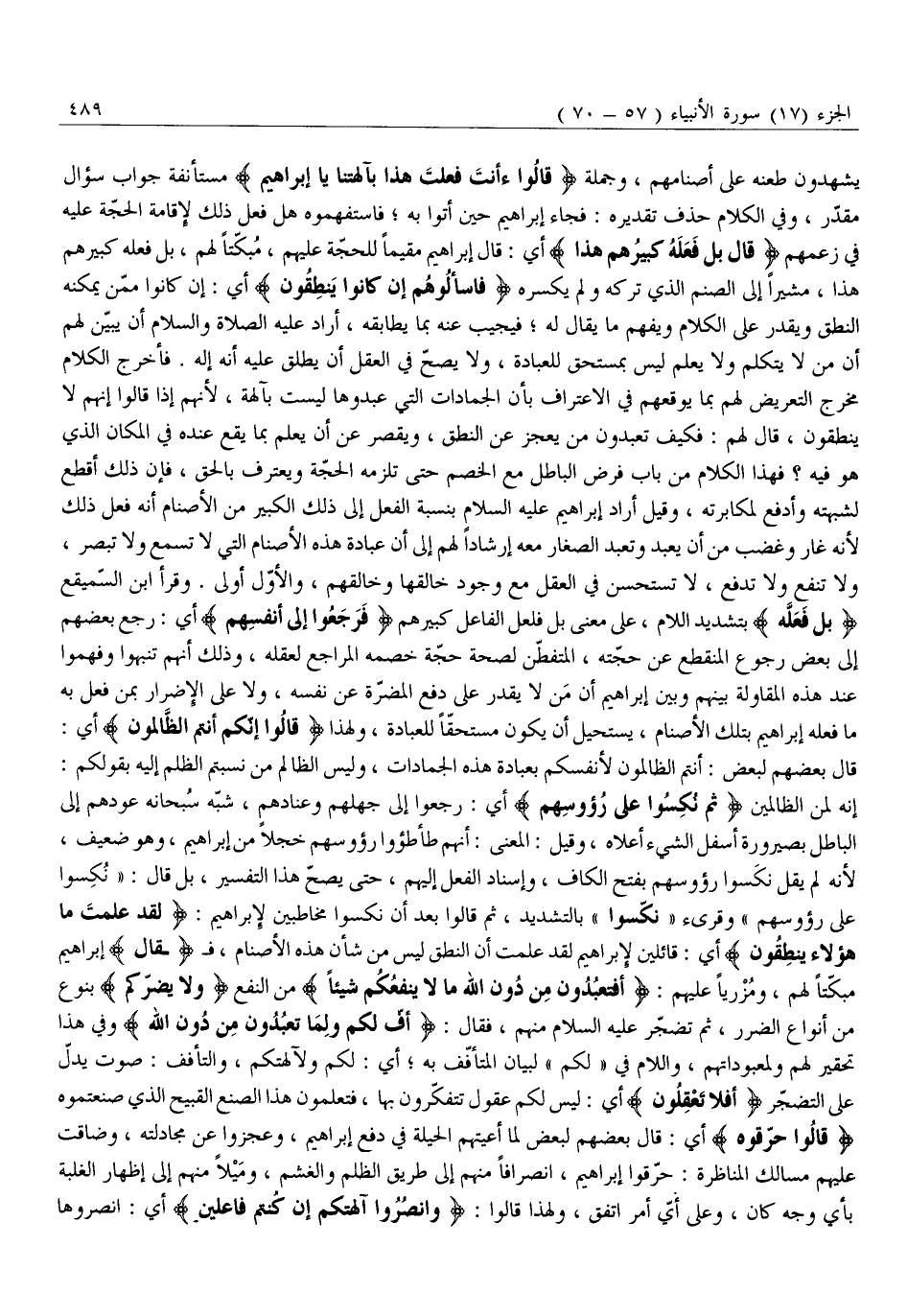 إِنَّهُ لَمِنَ الظَّالِمِينَ ثُمَّ نُكِسُوا عَلى رُؤُسِهِمْ أَيْ: رَجَعُوا إِلَى جَهْلِهِمْ وَعِنَادِهِمْ، شَبَّهَ سُبْحَانَهُ عَوْدَهُمْ إِلَى الْبَاطِلِ بِصَيْرُورَةِ أَسْفَلِ الشَّيْءِ أَعْلَاهُ، وقيل: المعنى: أنهم طأطئوا رؤوسهم خجلا مِنْ إِبْرَاهِيمَ، وَهُوَ ضَعِيفٌ، لِأَنَّهُ لَمْ يَقُلْ نكسوا رؤوسهم بِفَتْحِ الْكَافِ، وَإِسْنَادِ الْفِعْلِ إِلَيْهِمْ، حَتَّى يَصِحَّ هذا التفسير، بل قال: «نكسوا على رؤوسهم» وَقُرِئَ «نُكِّسُوا» بِالتَّشْدِيدِ، ثُمَّ قَالُوا بَعْدَ أَنْ نُكِسُوا مُخَاطِبِينَ لِإِبْرَاهِيمَ: لَقَدْ عَلِمْتَ مَا هؤُلاءِ يَنْطِقُونَ أَيْ: قَائِلِينَ لِإِبْرَاهِيمَ لَقَدْ عَلِمْتَ أَنَّ النطق ليس من شأن هذه الأصنام، ف قالَ إِبْرَاهِيمُ مُبَكِّتًا لَهُمْ، وَمُزْرِيًا عَلَيْهِمْ: أَفَتَعْبُدُونَ مِنْ دُونِ اللَّهِ مَا لَا يَنْفَعُكُمْ شَيْئاً مِنَ النَّفْعِ وَلا يَضُرُّكُمْ بِنَوْعٍ مِنْ أَنْوَاعِ الضَّرَرِ، ثُمَّ تَضَجَّرَ عَلَيْهِ السَّلَامُ مِنْهُمْ، فَقَالَ: أُفٍّ لَكُمْ وَلِما تَعْبُدُونَ مِنْ دُونِ اللَّهِ وَفِي هَذَا تَحْقِيرٌ لَهُمْ وَلِمَعْبُودَاتِهِمْ، وَاللَّامُ فِي «لَكُمْ» لِبَيَانِ الْمُتَأَفَّفِ بِهِ أَيْ: لَكُمْ وَلِآلِهَتِكُمْ، وَالتَّأَفُّفُ: صَوْتٌ يَدُلُّ عَلَى التَّضَجُّرِ أَفَلا تَعْقِلُونَ أَيْ: لَيْسَ لَكُمْ عُقُولٌ تَتَفَكَّرُونَ بِهَا، فَتَعْلَمُونَ هَذَا الصُّنْعَ الْقَبِيحَ الَّذِي صَنَعْتُمُوهُ قالُوا حَرِّقُوهُ أَيْ: قَالَ بَعْضُهُمْ لِبَعْضٍ لَمَّا أَعْيَتْهُمُ الْحِيلَةُ فِي دَفْعِ إِبْرَاهِيمَ، وَعَجَزُوا عَنْ مُجَادَلَتِهِ، وَضَاقَتْ عَلَيْهِمْ مَسَالِكُ الْمُنَاظَرَةِ: حَرِّقُوا إِبْرَاهِيمَ، انْصِرَافًا مِنْهُمْ إِلَى طَرِيقِ الظُّلْمِ وَالْغَشْمِ، وَمَيْلًا مِنْهُمْ إِلَى إِظْهَارِ الْغَلَبَةِ بِأَيِّ وَجْهٍ كَانَ، وَعَلَى أَيِّ أَمْرٍ اتَّفَقَ، وَلِهَذَا قَالُوا: وَانْصُرُوا آلِهَتَكُمْ إِنْ كُنْتُمْ فاعِلِينَ أَيِ: انْصُرُوهَا