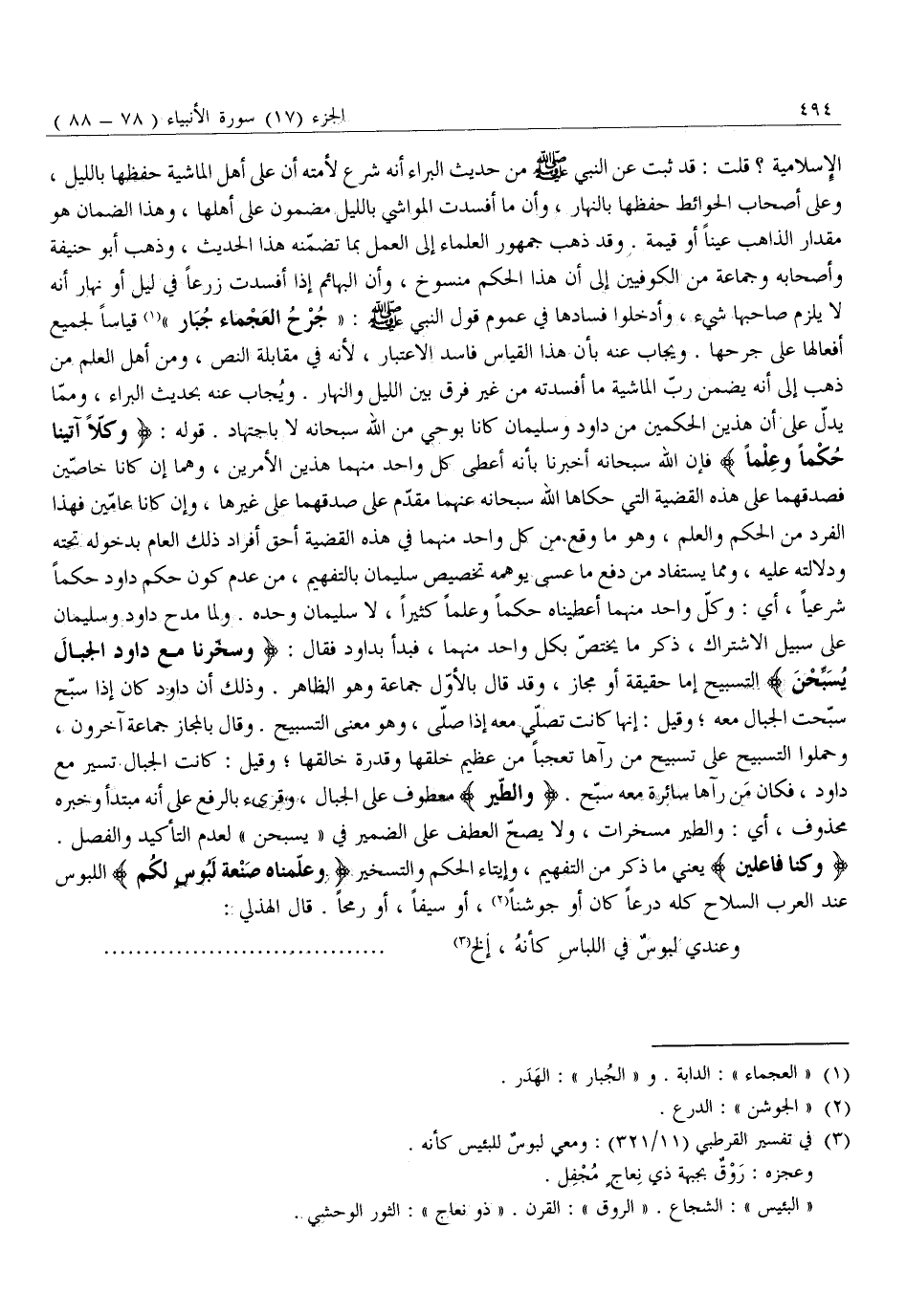 الْإِسْلَامِيَّةِ؟ قُلْتُ: قَدْ ثَبَتَ عَنِ النَّبِيِّ صَلَّى اللَّهُ عَلَيْهِ وَسَلَّمَ مِنْ حَدِيثِ الْبَرَاءِ أَنَّهُ شَرَّعَ لِأُمَّتِهِ أَنَّ عَلَى أَهْلِ الْمَاشِيَةِ حِفْظَهَا بِاللَّيْلِ، وَعَلَى أَصْحَابِ الْحَوَائِطِ حِفْظَهَا بِالنَّهَارِ، وَأَنَّ مَا أَفْسَدَتِ الْمَوَاشِي بِاللَّيْلِ مَضْمُونٌ عَلَى أَهْلِهَا، وَهَذَا الضَّمَانُ هُوَ مِقْدَارُ الذَّاهِبِ عَيْنًا أَوْ قِيمَةً. وَقَدْ ذَهَبَ جُمْهُورُ الْعُلَمَاءِ إِلَى الْعَمَلِ بِمَا تَضَمَّنَهُ هَذَا الْحَدِيثُ، وَذَهَبَ أَبُو حَنِيفَةَ وَأَصْحَابُهُ وَجَمَاعَةٌ مِنَ الْكُوفِيِّينَ إِلَى أَنَّ هَذَا الْحُكْمَ مَنْسُوخٌ، وَأَنَّ الْبَهَائِمَ إِذَا أَفْسَدَتْ زَرْعًا فِي لَيْلٍ أَوْ نَهَارٍ أَنَّهُ لَا يَلْزَمُ صَاحِبَهَا شَيْءٌ، وَأَدْخَلُوا فَسَادَهَا فِي عُمُومِ قَوْلِ النَّبِيِّ صَلَّى الله عليه وَسَلَّمَ: «جُرْحُ الْعَجْمَاءِ جُبَارٌ» «1» قِيَاسًا لِجَمِيعِ أَفْعَالِهَا عَلَى جُرْحِهَا. وَيُجَابُ عَنْهُ بِأَنَّ هَذَا الْقِيَاسَ فَاسِدُ الِاعْتِبَارِ، لِأَنَّهُ فِي مُقَابَلَةِ النَّصِّ، وَمِنْ أَهْلِ الْعِلْمِ مَنْ ذَهَبَ إِلَى أَنَّهُ يَضْمَنُ رَبُّ الْمَاشِيَةِ مَا أَفْسَدَتْهُ مِنْ غَيْرِ فَرْقٍ بَيْنَ اللَّيْلِ وَالنَّهَارِ. وَيُجَابُ عَنْهُ بِحَدِيثِ الْبَرَاءِ، وَمِمَّا يَدُلُّ عَلَى أَنَّ هَذَيْنِ الْحُكْمَيْنِ مِنْ دَاوُدَ وَسُلَيْمَانَ كَانَا بِوَحْيٍ مِنَ اللَّهِ سُبْحَانَهُ لَا بِاجْتِهَادٍ. قَوْلُهُ: وَكُلًّا آتَيْنا حُكْماً وَعِلْماً فَإِنَّ اللَّهَ سُبْحَانَهُ أَخْبَرَنَا بِأَنَّهُ أَعْطَى كُلَّ وَاحِدٍ مِنْهُمَا هَذَيْنِ الْأَمْرَيْنِ، وَهُمَا إِنْ كَانَا خَاصَّيْنِ فَصِدْقُهُمَا عَلَى هَذِهِ الْقَضِيَّةِ الَّتِي حَكَاهَا اللَّهُ سُبْحَانَهُ عَنْهُمَا مُقَدَّمٌ عَلَى صِدْقِهِمَا عَلَى غَيْرِهَا، وَإِنْ كَانَا عَامَّيْنِ فَهَذَا الْفَرْدُ مِنَ الْحُكْمِ وَالْعِلْمِ، وَهُوَ مَا وَقَعَ مِنْ كُلِّ وَاحِدٍ مِنْهُمَا فِي هَذِهِ الْقَضِيَّةِ أَحَقُّ أَفْرَادِ ذَلِكَ الْعَامِّ بِدُخُولِهِ تَحْتَهُ وَدَلَالَتِهِ عَلَيْهِ، وَمِمَّا يستفاد من دَفْعُ مَا عَسَى يُوهِمُهُ تَخْصِيصُ سُلَيْمَانَ بِالتَّفْهِيمِ، مِنْ عَدَمِ كَوْنِ حُكْمِ دَاوُدَ حُكْمًا شَرْعِيًّا، أَيْ: وَكُلُّ وَاحِدٍ مِنْهُمَا أَعْطَيْنَاهُ حُكْمًا وَعِلْمًا كَثِيرًا، لَا سُلَيْمَانَ وَحْدَهُ. وَلَمَّا مَدَحَ دَاوُدَ وَسُلَيْمَانَ عَلَى سَبِيلِ الِاشْتِرَاكِ، ذَكَرَ مَا يَخْتَصُّ بِكُلِّ وَاحِدٍ مِنْهُمَا، فَبَدَأَ بِدَاوُدَ فَقَالَ: وَسَخَّرْنا مَعَ داوُدَ الْجِبالَ يُسَبِّحْنَ التَّسْبِيحُ إِمَّا حَقِيقَةٌ أَوْ مَجَازٌ، وَقَدْ قَالَ بِالْأَوَّلِ جَمَاعَةٌ وَهُوَ الظَّاهِرُ. وَذَلِكَ أَنَّ دَاوُدَ كَانَ إِذَا سَبَّحَ سَبَّحَتِ الْجِبَالُ مَعَهُ وَقِيلَ: إِنَّهَا كَانَتْ تُصَلِّي مَعَهُ إِذَا صَلَّى، وَهُوَ مَعْنَى التَّسْبِيحِ. وَقَالَ بِالْمَجَازِ جَمَاعَةٌ آخَرُونَ، وَحَمَلُوا التَّسْبِيحَ عَلَى تَسْبِيحِ مَنْ رَآهَا تَعَجُّبًا مِنْ عَظِيمِ خَلْقِهَا وَقُدْرَةِ خَالِقِهَا وَقِيلَ: كَانَتِ الْجِبَالُ تَسِيرُ مَعَ دَاوُدَ، فَكَانَ مَنْ رَآهَا سَائِرَةً مَعَهُ سَبَّحَ. وَالطَّيْرَ مَعْطُوفٌ عَلَى الْجِبَالِ، وَقُرِئَ بِالرَّفْعِ عَلَى أَنَّهُ مُبْتَدَأٌ وَخَبَرُهُ مَحْذُوفٌ، أَيْ: وَالطَّيْرُ مُسَخَّرَاتٌ، وَلَا يَصِحُّ الْعَطْفُ عَلَى الضَّمِيرِ فِي «يُسَبِّحْنَ» لِعَدَمِ التَّأْكِيدِ وَالْفَصْلِ.
