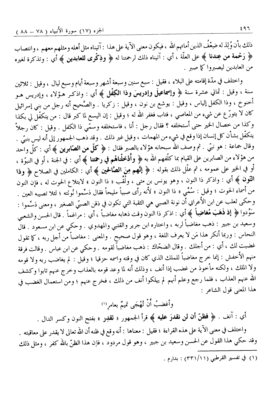 وَقَالَ جَمَاعَةٌ: هُوَ نَبِيٌّ. ثُمَّ وَصَفَ اللَّهُ سُبْحَانَهُ هَؤُلَاءِ بِالصَّبْرِ فَقَالَ: كُلٌّ مِنَ الصَّابِرِينَ أَيْ: كُلُّ وَاحِدٍ مِنْ هَؤُلَاءِ مِنَ الصَّابِرِينَ عَلَى الْقِيَامِ بِمَا كَلَّفَهُمُ اللَّهُ بِهِ وَأَدْخَلْناهُمْ فِي رَحْمَتِنا أَيْ: فِي الْجَنَّةِ، أَوْ فِي النُّبُوَّةِ، أَوْ فِي الْخَيْرِ عَلَى عُمُومِهِ، ثُمَّ عَلَّلَ ذَلِكَ بِقَوْلِهِ: إِنَّهُمْ مِنَ الصَّالِحِينَ أَيِ: الْكَامِلِينَ فِي الصَّلَاحِ وَذَا النُّونِ أَيْ: وَاذْكُرْ ذَا النُّونِ، وَهُوَ يُونُسُ بْنُ مَتَّى، وَلُقِّبَ «ذَا النُّونِ» لِابْتِلَاعِ الْحُوتِ لَهُ، فَإِنَّ النُّونَ مِنْ أَسْمَاءِ الْحُوتِ وَقِيلَ: سُمِّيَ «ذَا النُّونِ» لِأَنَّهُ رَأَى صَبِيًّا مَلِيحًا فَقَالَ دَسِّمُوا نُونَتَهُ لِئَلَّا تُصِيبَهُ الْعَيْنُ.