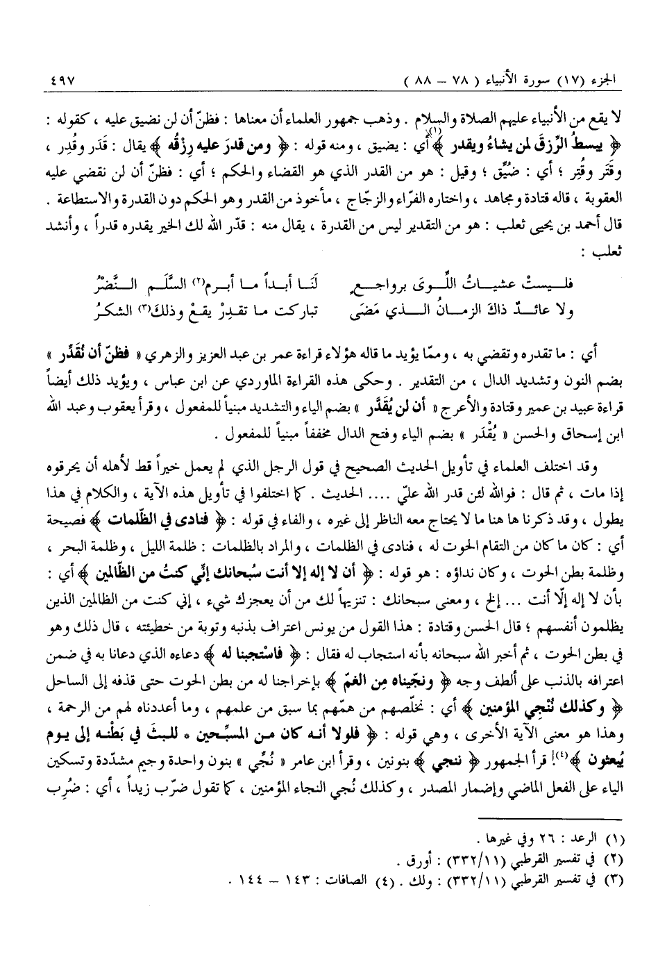 وَقَدِ اخْتَلَفَ الْعُلَمَاءُ فِي تَأْوِيلِ الْحَدِيثِ الصَّحِيحِ فِي قَوْلِ الرَّجُلِ الَّذِي لَمْ يَعْمَلْ خَيْرًا قَطُّ لِأَهْلِهِ أَنْ يَحْرِقُوهُ إذا مات، ثم قال: فو الله لَئِنْ قَدَّرَ اللَّهُ عَلَيَّ ... الْحَدِيثَ. كَمَا اخْتَلَفُوا فِي تَأْوِيلِ هَذِهِ الْآيَةِ، وَالْكَلَامُ فِي هَذَا يَطُولُ، وَقَدْ ذَكَرْنَا هَاهُنَا مَا لَا يَحْتَاجُ مَعَهُ النَّاظِرُ إِلَى غَيْرِهِ، وَالْفَاءُ فِي قَوْلِهِ: فَنادى فِي الظُّلُماتِ فَصِيحَةٌ أَيْ: كَانَ مَا كَانَ مِنِ الْتِقَامِ الْحُوتِ لَهُ، فَنَادَى فِي الظُّلُمَاتِ، وَالْمُرَادُ بِالظُّلُمَاتِ: ظُلْمَةُ اللَّيْلِ، وَظُلْمَةُ الْبَحْرِ، وَظُلْمَةُ بَطْنِ الْحُوتِ، وَكَانَ نِدَاؤُهُ: هُوَ قَوْلُهُ: أَنْ لَا إِلهَ إِلَّا أَنْتَ سُبْحانَكَ إِنِّي كُنْتُ مِنَ الظَّالِمِينَ أَيْ: