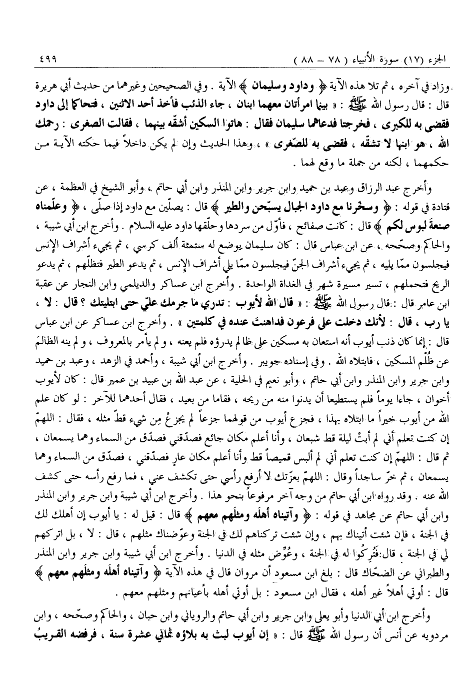 وَأَخْرَجَ عَبْدُ الرَّزَّاقِ وَعَبْدُ بْنُ حُمَيْدٍ وَابْنُ جَرِيرٍ وَابْنُ الْمُنْذِرِ وَابْنُ أَبِي حَاتِمٍ، وَأَبُو الشَّيْخِ فِي الْعَظَمَةِ، عَنْ قَتَادَةَ فِي قَوْلِهِ: وَسَخَّرْنا مَعَ داوُدَ الْجِبالَ يُسَبِّحْنَ وَالطَّيْرَ قَالَ: يُصَلِّينَ مَعَ دَاوُدَ إِذَا صَلَّى، وَعَلَّمْناهُ صَنْعَةَ لَبُوسٍ لَكُمْ قَالَ: كَانَتْ صَفَائِحَ، فَأَوَّلُ مَنْ سَرَدَهَا وحلّقها داود عليه السَّلَامُ. وَأَخْرَجَ ابْنُ أَبِي شَيْبَةَ، وَالْحَاكِمُ وَصَحَّحَهُ، عَنِ ابْنِ عَبَّاسٍ قَالَ: كَانَ سُلَيْمَانُ يُوضَعُ لَهُ سِتُّمِائَةُ أَلْفِ كُرْسِيِّ، ثُمَّ يَجِيءُ أَشْرَافُ الْإِنْسِ فَيَجْلِسُونَ مِمَّا يَلِيهِ، ثُمَّ يَجِيءُ أَشْرَافُ الْجِنِّ فَيَجْلِسُونَ مِمَّا يَلِي أَشْرَافَ الْإِنْسِ، ثُمَّ يَدْعُو الطَّيْرَ فَتُظِلُّهُمْ، ثُمَّ يَدْعُو الرِّيحَ فَتَحْمِلُهُمْ، تَسِيرُ مَسِيرَةَ شَهْرٍ فِي الْغَدَاةِ الْوَاحِدَةِ. وَأَخْرَجَ ابْنُ عَسَاكِرَ وَالدَّيْلَمِيُّ وَابْنُ النَّجَّارِ عَنْ عُقْبَةَ ابن عَامِرٍ قَالَ: قَالَ رَسُولُ اللَّهِ صَلَّى اللَّهُ عَلَيْهِ وَسَلَّمَ: «قَالَ اللَّهُ لِأَيُّوبَ: تَدْرِي مَا جُرْمَكَ عَلَيَّ حَتَّى ابْتَلَيْتُكَ؟ قَالَ: لَا، يَا رَبِّ، قَالَ: لِأَنَّكَ دَخَلْتَ عَلَى فِرْعَوْنَ فَدَاهَنْتَ عِنْدَهُ فِي كَلِمَتَيْنِ» . وَأَخْرَجَ ابْنُ عَسَاكِرَ عَنِ ابْنِ عَبَّاسٍ قَالَ: إِنَّمَا كَانَ ذَنْبُ أَيُّوبَ أَنَّهُ اسْتَعَانَ بِهِ مِسْكِينٌ عَلَى ظَالِمٍ يَدْرَؤُهُ فَلَمْ يُعِنْهُ، وَلَمْ يَأْمُرْ بِالْمَعْرُوفِ، وَلَمْ يَنْهَ الظَّالِمَ عَنْ ظُلْمِ الْمِسْكِينِ، فَابْتَلَاهُ اللَّهُ. وَفِي إِسْنَادِهِ جُوَيْبِرٌ. وَأَخْرَجَ ابْنُ أَبِي شَيْبَةَ، وَأَحْمَدُ فِي الزُّهْدِ، وَعَبْدُ بْنُ حُمَيْدٍ وَابْنُ جَرِيرٍ وَابْنُ الْمُنْذِرِ وَابْنُ أَبِي حَاتِمٍ، وَأَبُو نُعَيْمٍ فِي الْحِلْيَةِ، عَنْ عَبْدِ اللَّهِ بْنِ عُبَيْدِ بْنِ عُمَيْرٍ قَالَ: كَانَ لِأَيُّوبَ أَخَوَانِ، جَاءَا يَوْمًا فَلَمْ يَسْتَطِيعَا أَنْ يَدْنُوَا مِنْهُ مِنْ رِيحِهِ، فَقَامَا مِنْ بَعِيدٍ، فَقَالَ أَحَدُهُمَا لِلْآخَرِ: لَوْ كَانَ عَلِمَ اللَّهُ مِنْ أَيُّوبَ خَيْرًا مَا ابْتَلَاهُ بِهَذَا، فَجَزِعَ أَيْوبُ مِنْ قَوْلِهِمَا جَزَعًا لَمْ يَجْزَعْ مِنْ شَيْءٍ قَطُّ مِثْلَهُ، فَقَالَ: اللَّهُمَّ إِنْ كُنْتَ تَعْلَمُ أَنِّي لَمْ أَبِتْ لَيْلَةً قَطُّ شَبْعَانَ، وَأَنَا أَعْلَمُ مَكَانَ جَائِعٍ فَصَدِّقْنِي فَصُدِّقَ مِنَ السَّمَاءِ وَهُمَا يَسْمَعَانِ، ثُمَّ قَالَ: اللَّهُمَّ إِنْ كُنْتَ تَعْلَمُ أَنِّي لَمْ أَلْبَسْ قَمِيصًا قَطُّ وَأَنَا أَعْلَمُ مَكَانَ عَارٍ فَصَدِّقْنِي، فَصُدِّقَ مِنَ السَّمَاءِ وَهُمَا يَسْمَعَانِ، ثُمَّ خَرَّ سَاجِدًا وَقَالَ: اللَّهُمَّ بِعِزَّتِكَ لَا أَرْفَعُ رَأْسِي حَتَّى تَكْشِفَ عَنِّي، فَمَا رَفَعَ رَأْسَهُ حَتَّى كَشْفَ اللَّهُ عَنْهُ. وَقَدْ رَوَاهُ ابْنُ أَبِي حَاتِمٍ مِنْ وَجْهٍ آخَرَ مَرْفُوعًا بِنَحْوِ هَذَا. وَأَخْرَجَ ابْنُ أَبِي شَيْبَةَ وَابْنُ جَرِيرٍ وَابْنُ الْمُنْذِرِ وَابْنُ أَبِي حَاتِمٍ عَنْ مُجَاهِدٍ فِي قَوْلِهِ: وَآتَيْناهُ أَهْلَهُ وَمِثْلَهُمْ مَعَهُمْ قَالَ: قِيلَ لَهُ: يَا أَيُّوبُ إِنَّ أَهْلَكَ لَكَ في الجنة، فإن شئت أتيناك بهم، وإن شئت تركناهم لك في الجنة وعوّضناك مثلهم، قال: لا، بل اتركهم لي في الجنة، قال: فتركوا له في الجنة، وعوّض مثله فِي الدُّنْيَا. وَأَخْرَجَ ابْنُ أَبِي شَيْبَةَ وَابْنُ جَرِيرٍ وَابْنُ الْمُنْذِرِ وَالطَّبَرَانِيُّ عَنِ الضَّحَّاكِ قَالَ: بَلَغَ ابْنَ مَسْعُودٍ أَنَّ مَرْوَانَ قَالَ فِي هَذِهِ الْآيَةِ وَآتَيْناهُ أَهْلَهُ وَمِثْلَهُمْ مَعَهُمْ قَالَ: أُوتِيَ أَهْلًا غَيْرَ أَهْلِهِ، فَقَ
