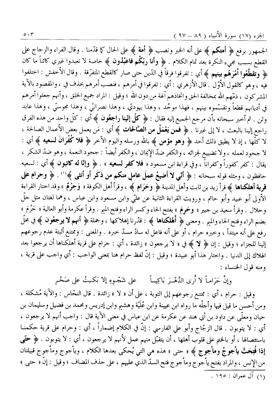 وَإِنَّ حَرَامًا لَا أَرَى الدَّهْرَ بَاكِيًا عَلَى شَجْوهِ إِلَّا بَكَيْتُ عَلَى صَخْرِ وَقِيلَ: حَرَامٌ، أَيْ: مُمْتَنِعٌ رُجُوعُهُمْ إِلَى التَّوْبَةِ، عَلَى أَنَّ «لَا» زَائِدَةٌ. قَالَ النَّحَّاسُ: وَالْآيَةُ مُشْكِلَةٌ، وَمِنْ أَحْسَنِ مَا قِيلَ فِيهَا وَأَجَلِّهِ مَا رَوَاهُ ابْنُ عُيَيْنَةَ وَابْنُ عُلَيَّةَ وَهُشَيْمٌ وَابْنُ إِدْرِيسَ وَمُحَمَّدُ بن فضيل وسليمان بن حيان وَمُعَلًّى عَنْ دَاوُدَ بْنِ أَبِي هِنْدٍ عَنْ عِكْرِمَةَ عَنِ ابْنِ عَبَّاسٍ فِي مَعْنَى الْآيَةِ قَالَ: وَاجِبٌ أَنَّهُمْ لَا يَرْجِعُونَ، أَيْ: لَا يَتُوبُونَ. قَالَ الزَّجَّاجُ وَأَبُو عَلِيٍّ الْفَارِسِيُّ: إِنَّ فِي الْكَلَامِ إِضْمَارًا، أَيْ: وَحَرَامٌ عَلَى قَرْيَةٍ حَكَمْنَا بِاسْتِئْصَالِهَا، أَوْ بِالْخَتْمِ عَلَى قُلُوبِ أَهْلِهَا، أَنْ يُتَقَبَّلَ مِنْهُمْ عَمَلٌ لِأَنَّهُمْ لَا يَرْجِعُونَ، أَيْ: لَا يَتُوبُونَ. حَتَّى إِذا فُتِحَتْ يَأْجُوجُ وَمَأْجُوجُ «حَتَّى» هَذِهِ هِيَ الَّتِي يُحْكَى بَعْدَهَا الكلام، ويأجوج ومأجوج قبيلتان من الإنس، والمراد بفتح يأجوج ومأجوج فتح السدّ الذي عليهم، على حذف المضاف وقيل: إنّ «حتى»
