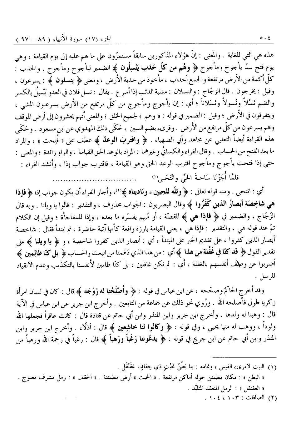 كُلُّ أَكَمَةٍ مِنَ الْأَرْضِ مُرْتَفِعَةٍ وَالْجَمْعُ أَحْدَابٌ، مَأْخُوذٌ مِنْ حَدَبَةِ الْأَرْضِ، وَمَعْنَى يَنْسِلُونَ: يُسْرِعُونَ، وَقِيلَ: يَخْرُجُونَ. قَالَ الزَّجَّاجُ: وَالنَّسَلَانُ: مِشْيَةُ الذِّئْبِ إِذَا أَسْرَعَ. يُقَالُ: نَسَلَ فُلَانٌ فِي الْعَدْوِ يَنْسِلُ بِالْكَسْرِ وَالضَّمِّ نَسْلًا وَنُسُولًا وَنُسْلَانًا أَيْ: أَنَّ يَأْجُوجَ وَمَأْجُوجَ مِنْ كُلِّ مُرْتَفِعٍ مِنَ الْأَرْضِ يُسْرِعُونَ الْمَشْيَ، وَيَتَفَرَّقُونَ فِي الْأَرْضِ وَقِيلَ: الضَّمِيرُ فِي قَوْلِهِ: «وَهُمْ» لِجَمِيعِ الْخَلْقِ وَالْمَعْنَى أَنَّهُمْ يُحْشَرُونَ إِلَى أَرْضِ الْمَوْقِفِ وَهُمْ يُسْرِعُونَ مِنْ كُلِّ مُرْتَفَعٍ مِنَ الْأَرْضِ. وَقُرِئَ بِضَمِّ السِّينِ، حَكَى ذَلِكَ الْمَهْدَوِيُّ عَنِ ابْنِ مَسْعُودٍ. وَحَكَى هَذِهِ الْقِرَاءَةَ أَيْضًا الثَّعْلَبِيُّ عَنْ مُجَاهِدٍ وَأَبِي الصَّهْبَاءِ. وَاقْتَرَبَ الْوَعْدُ عَطْفٌ عَلَى «فُتِحَتْ» ، وَالْمُرَادُ مَا بَعْدَ الْفَتْحِ مِنَ الْحِسَابِ. وَقَالَ الْفَرَّاءُ وَالْكِسَائِيُّ وَغَيْرُهُمَا: الْمُرَادُ بِالْوَعْدِ الْحَقِّ الْقِيَامَةُ، وَالْوَاوُ زَائِدَةٌ وَالْمَعْنَى: