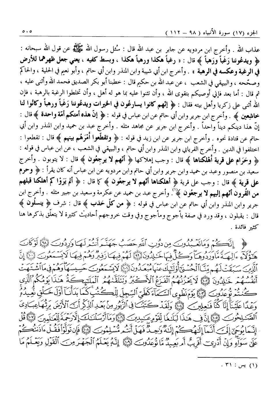 وَحَرامٌ عَلى قَرْيَةٍ أَهْلَكْناها قَالَ: وَجَبَ إِهْلَاكُهَا أَنَّهُمْ لَا يَرْجِعُونَ قَالَ: لَا يَتُوبُونَ. وَأَخْرَجَ سَعِيدُ بْنُ مَنْصُورٍ وَعَبْدُ بْنُ حُمَيْدٍ وَابْنُ جَرِيرٍ وَابْنُ أَبِي حَاتِمٍ وَابْنُ مَرْدَوَيْهِ عَنِ ابْنِ عَبَّاسٍ أَنَّهُ كَانَ يَقْرَأُ: وَحَرُمَ عَلَى قَرْيَةٍ قَالَ: وَجَبَ عَلَى قَرْيَةٍ أَهْلَكْناها أَنَّهُمْ لَا يَرْجِعُونَ كَمَا قَالَ: أَلَمْ يَرَوْا كَمْ أَهْلَكْنا قَبْلَهُمْ مِنَ الْقُرُونِ أَنَّهُمْ إِلَيْهِمْ لَا يَرْجِعُونَ «1» . وَأَخْرَجَ عَبْدُ بْنُ حُمَيْدٍ عَنْ عِكْرِمَةَ وَسَعِيدِ بْنِ جُبَيْرٍ مِثْلَهُ. وَأَخْرَجَ ابْنُ جَرِيرٍ وَابْنُ الْمُنْذِرِ وَابْنُ أَبِي حَاتِمٍ عَنِ ابْنِ عَبَّاسٍ فِي قَوْلِهِ: مِنْ كُلِّ حَدَبٍ قَالَ: شَرَفٍ يَنْسِلُونَ قَالَ: يُقْبِلُونَ، وَقَدْ وَرَدَ فِي صِفَةِ يَأْجُوجَ وَمَأْجُوجَ وَفِي وَقْتِ خُرُوجِهِمْ أَحَادِيثُ كَثِيرَةٌ لا يتعلّق بذكرها هنا كثير فائدة.