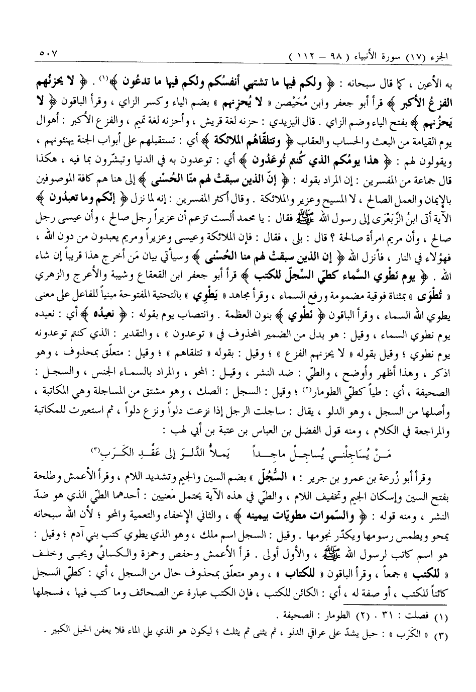 «1» . لَا يَحْزُنُهُمُ الْفَزَعُ الْأَكْبَرُ قَرَأَ أَبُو جَعْفَرٍ وَابْنُ مُحَيْصِنٍ «لَا يُحْزِنُهُمْ» بِضَمِّ الْيَاءِ وَكَسْرِ الزَّايِ، وَقَرَأَ الْبَاقُونَ لَا يَحْزُنُهُمُ بِفَتْحِ الْيَاءِ وَضَمِّ الزَّايِ. قَالَ الْيَزِيدِيُّ: حَزَنَهُ لُغَةُ قُرَيْشٍ، وَأَحْزَنَهُ لُغَةُ تَمِيمٍ، وَالْفَزَعُ الْأَكْبَرُ: أَهْوَالُ يَوْمِ الْقِيَامَةِ مِنَ الْبَعْثِ وَالْحِسَابِ وَالْعِقَابِ وَتَتَلَقَّاهُمُ الْمَلائِكَةُ أَيْ: تَسْتَقْبِلُهُمْ عَلَى أَبْوَابِ الْجَنَّةِ يُهَنِّئُونَهُمْ، وَيَقُولُونَ لَهُمْ: هَذَا يَوْمُكُمُ الَّذِي كُنْتُمْ تُوعَدُونَ أَيْ: تُوعَدُونَ بِهِ فِي الدُّنْيَا وَتُبَشَّرُونَ بِمَا فِيهِ، هَكَذَا قَالَ جَمَاعَةٌ مِنَ الْمُفَسِّرِينَ: إِنَّ الْمُرَادَ بِقَوْلِهِ: إِنَّ الَّذِينَ سَبَقَتْ لَهُمْ مِنَّا الْحُسْنى إِلَى هُنَا هُمْ كَافَّةُ الْمَوْصُوفِينَ بِالْإِيمَانِ وَالْعَمَلِ الصَّالِحِ، لَا الْمَسِيحُ وَعُزَيْرٌ وَالْمَلَائِكَةُ. وَقَالَ أَكْثَرُ الْمُفَسِّرِينَ: إِنَّهُ لَمَّا نَزَلَ إِنَّكُمْ وَما تَعْبُدُونَ الْآيَةَ أَتَى ابْنُ الزِّبَعْرَى إِلَى رَسُولِ اللَّهِ صَلَّى اللَّهُ عَلَيْهِ وَسَلَّمَ فَقَالَ: يَا مُحَمَّدُ أَلَسْتَ تَزْعُمُ أَنَّ عُزَيْرًا رَجُلٌ صَالِحٌ، وَأَنَّ عِيسَى رَجُلٌ صَالِحٌ، وَأَنَّ مَرْيَمَ امْرَأَةٌ صَالِحَةٌ؟ قَالَ: بَلَى، فَقَالَ: فَإِنَّ الْمَلَائِكَةَ وَعِيسَى وَعُزَيْرًا وَمَرْيَمَ يُعْبَدُونَ مِنْ دُونِ اللَّهِ، فَهَؤُلَاءِ فِي النَّارِ، فَأَنْزَلَ اللَّهُ إِنَّ الَّذِينَ سَبَقَتْ لَهُمْ مِنَّا الْحُسْنى وَسَيَأْتِي بَيَانُ مَنْ أَخْرَجَ هَذَا قَرِيبًا إِنْ شَاءَ اللَّهُ. يَوْمَ نَطْوِي السَّماءَ كَطَيِّ السِّجِلِّ لِلْكُتُبِ قرأ أبو جعفر ابن الْقَعْقَاعِ وَشَيْبَةُ وَالْأَعْرَجُ وَالزُّهْرِيُّ «تُطْوَى» بِمُثَنَّاةٍ فَوْقِيَّةٍ مَضْمُومَةٍ وَرَفْعِ السَّمَاءِ، وَقَرَأَ مُجَاهِدٌ «يَطْوِي» بِالتَّحْتِيَّةِ الْمَفْتُوحَةِ مَبْنِيًّا لِلْفَاعِلِ عَلَى مَعْنَى يَطْوِي اللَّهُ السَّمَاءَ، وَقَرَأَ الْبَاقُونَ نَطْوِي بِنُونِ الْعَظَمَةِ. وَانْتِصَابِ يَوْمَ بِقَوْلِهِ: نُعِيدُهُ أَيْ: نُعِيدُهُ يَوْمَ نَطْوِي السَّمَاءَ، وَقِيلَ: هُوَ بَدَلٌ مِنَ الضَّمِيرِ الْمَحْذُوفِ في «تُوعَدُونَ» ، والتقدير: الذي كُنْتُمْ تُوعَدُونَهُ يَوْمَ نَطْوِي وَقِيلَ بِقَوْلِهِ «لَا يَحْزُنُهُمُ الْفَزَعُ» وَقِيلَ: بِقَوْلِهِ «تَتَلَقَّاهُمُ» وَقِيلَ: مُتَعَلِّقٌ بِمَحْذُوفٍ، وَهُوَ اذْكُرْ، وَهَذَا أَظْهَرُ وَأَوْضَحُ، وَالطَّيُّ: ضِدُّ النَّشْرِ، وَقِيلَ: الْمَحْوُ، وَالْمُرَادُ بِالسَّمَاءِ الْجِنْسُ، وَالسِّجِلِّ:
