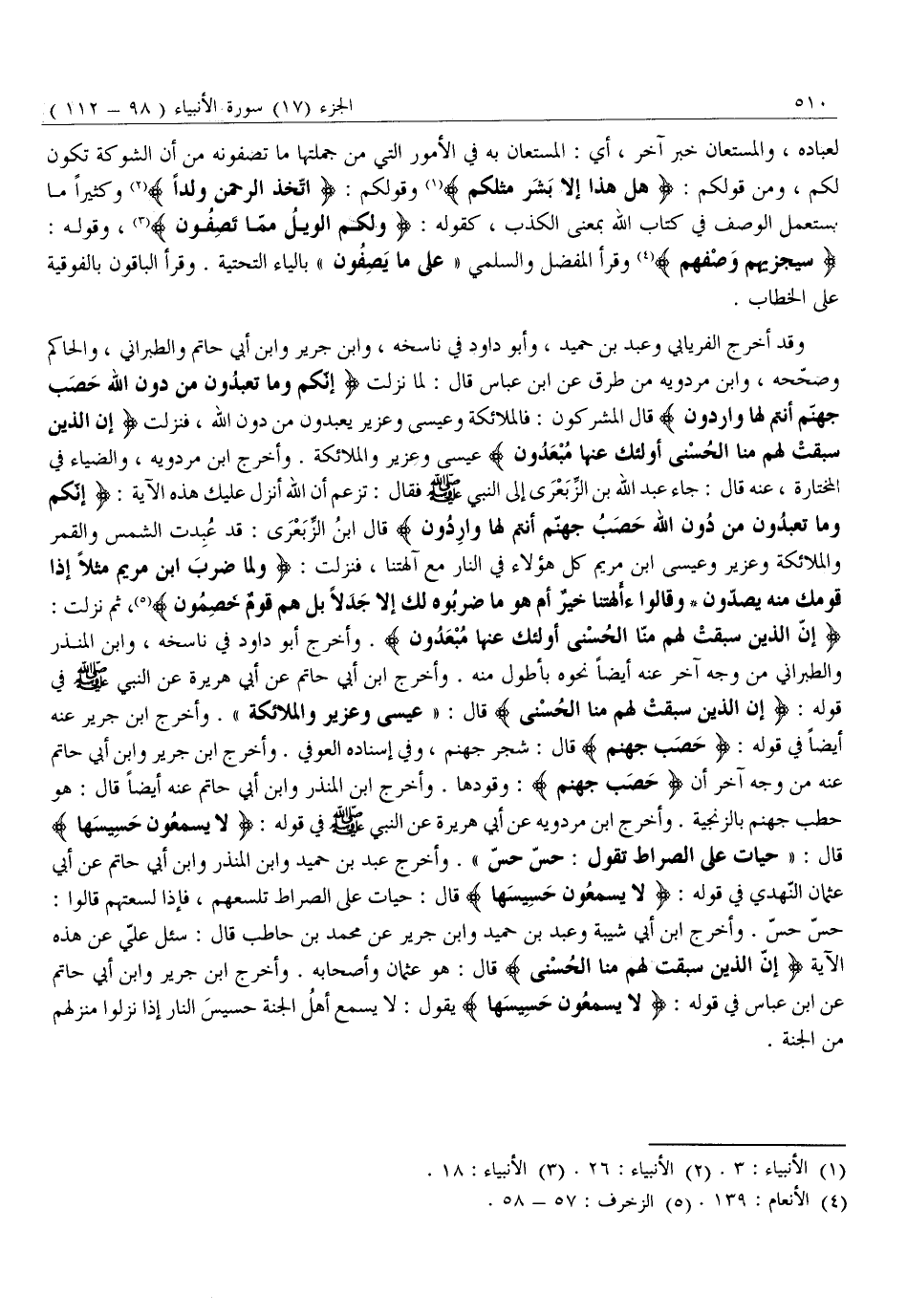 وَقَدْ أَخْرَجَ الْفِرْيَابِيُّ وَعَبْدُ بْنُ حُمَيْدٍ، وَأَبُو دَاوُدَ فِي نَاسِخِهِ، وَابْنُ جَرِيرٍ وَابْنُ أَبِي حَاتِمٍ وَالطَّبَرَانِيُّ، وَالْحَاكِمُ وَصَحَّحَهُ، وَابْنُ مَرْدَوَيْهِ مِنْ طُرُقٍ عَنِ ابْنِ عَبَّاسٍ قَالَ: لَمَّا نَزَلَتْ إِنَّكُمْ وَما تَعْبُدُونَ مِنْ دُونِ اللَّهِ حَصَبُ جَهَنَّمَ أَنْتُمْ لَها وارِدُونَ قَالَ الْمُشْرِكُونَ: فَالْمَلَائِكَةُ وَعِيسَى وَعُزَيْرٌ يُعْبَدُونَ مِنْ دُونِ اللَّهِ، فَنَزَلَتْ إِنَّ الَّذِينَ سَبَقَتْ لَهُمْ مِنَّا الْحُسْنى أُولئِكَ عَنْها مُبْعَدُونَ عِيسَى وَعُزَيْرٌ وَالْمَلَائِكَةُ. وَأَخْرَجَ ابْنُ مَرْدَوَيْهِ، وَالضِّيَاءُ فِي الْمُخْتَارَةِ، عَنْهُ قَالَ: جَاءَ عَبْدُ اللَّهِ بْنُ الزِّبَعْرَى إِلَى النَّبِيِّ صَلَّى اللَّهُ عَلَيْهِ وَسَلَّمَ فَقَالَ: تَزْعُمُ أَنَّ اللَّهَ أَنْزَلَ عَلَيْكَ هَذِهِ الْآيَةَ: إِنَّكُمْ وَما تَعْبُدُونَ مِنْ دُونِ اللَّهِ حَصَبُ جَهَنَّمَ أَنْتُمْ لَها وارِدُونَ قَالَ ابْنُ الزِّبَعْرَى: قَدْ عُبِدَتِ الشَّمْسُ وَالْقَمَرُ وَالْمَلَائِكَةُ وَعُزَيْرٌ وَعِيسَى ابْنُ مَرْيَمَ كُلُّ هَؤُلَاءِ فِي النَّارِ مَعَ آلِهَتِنَا، فَنَزَلَتْ: وَلَمَّا ضُرِبَ ابْنُ مَرْيَمَ مَثَلًا إِذا قَوْمُكَ مِنْهُ يَصِدُّونَ- وَقالُوا أَآلِهَتُنا خَيْرٌ أَمْ هُوَ مَا ضَرَبُوهُ لَكَ إِلَّا جَدَلًا بَلْ هُمْ قَوْمٌ خَصِمُونَ «5» ، ثُمَّ نَزَلَتْ: