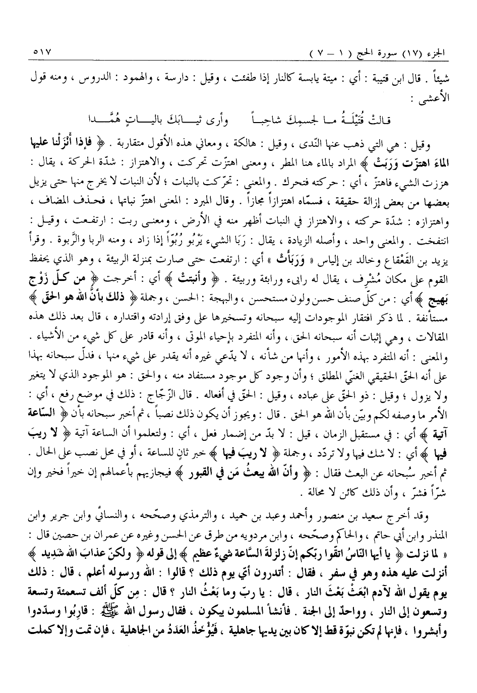 ثُمَّ أَخْبَرَ سُبْحَانَهُ عَنِ الْبَعْثِ فَقَالَ: وَأَنَّ اللَّهَ يَبْعَثُ مَنْ فِي الْقُبُورِ فَيُجَازِيهِمْ بِأَعْمَالِهِمْ إِنْ خَيْرًا فَخَيْرٌ وَإِنْ شَرًّا فَشَرٌّ، وَأَنَّ ذَلِكَ كَائِنٌ لَا مَحَالَةَ.