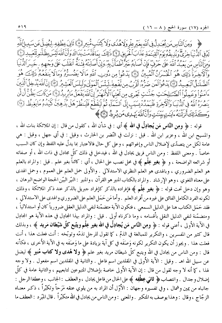 وَمِنَ النَّاسِ مَنْ يُجادِلُ فِي اللَّهِ بِغَيْرِ عِلْمٍ وَلا هُدىً وَلا كِتابٍ مُنِيرٍ (8) ثانِيَ عِطْفِهِ لِيُضِلَّ عَنْ سَبِيلِ اللَّهِ لَهُ فِي الدُّنْيا خِزْيٌ وَنُذِيقُهُ يَوْمَ الْقِيامَةِ عَذابَ الْحَرِيقِ (9) ذلِكَ بِما قَدَّمَتْ يَداكَ وَأَنَّ اللَّهَ لَيْسَ بِظَلاَّمٍ لِلْعَبِيدِ (10) وَمِنَ النَّاسِ مَنْ يَعْبُدُ اللَّهَ عَلى حَرْفٍ فَإِنْ أَصابَهُ خَيْرٌ اطْمَأَنَّ بِهِ وَإِنْ أَصابَتْهُ فِتْنَةٌ انْقَلَبَ عَلى وَجْهِهِ خَسِرَ الدُّنْيا وَالْآخِرَةَ ذلِكَ هُوَ الْخُسْرانُ الْمُبِينُ (11) يَدْعُوا مِنْ دُونِ اللَّهِ مَا لَا يَضُرُّهُ وَما لا يَنْفَعُهُ ذلِكَ هُوَ الضَّلالُ الْبَعِيدُ (12)