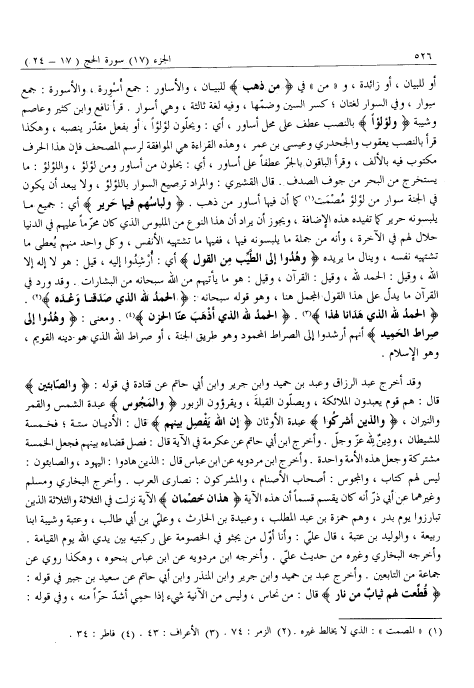 أو للبيان، أو زائدة، و «من» فِي مِنْ ذَهَبٍ لِلْبَيَانِ، وَالْأَسَاوِرُ: جَمْعُ أَسْوِرَةٍ، وَالْأَسْوِرَةُ: جَمْعُ سِوَارٍ، وَفِي السُّوَارِ لُغَتَانِ كَسْرُ السِّينِ وَضَمُّهَا، وَفِيهِ لُغَةٌ ثَالِثَةٌ، وَهِيَ أَسْوَارٌ. قَرَأَ نَافِعٌ وَابْنُ كَثِيرٍ وَعَاصِمٌ وَشَيْبَةُ وَلُؤْلُؤاً بِالنَّصْبِ عَطْفٌ عَلَى مَحَلِّ أَسَاوِرَ، أَيْ: وَيُحَلُّونَ لؤلؤا، أو بفعل مقدّر ينصبه، وَهَكَذَا قَرَأَ بِالنَّصْبِ يَعْقُوبُ وَالْجَحْدَرِيُّ وَعِيسَى بْنُ عُمَرَ، وَهَذِهِ الْقِرَاءَةُ هِيَ الْمُوَافِقَةُ لِرَسْمِ الْمُصْحَفِ فَإِنَّ هَذَا الْحَرْفَ مَكْتُوبٌ فِيهِ بِالْأَلِفِ، وَقَرَأَ الْبَاقُونَ بِالْجَرِّ عَطْفًا عَلَى أَسَاوِرَ، أَيْ: يُحَلُّونَ من أساور ومن لؤلؤ، واللؤلؤ: ما يستخرج من البحر من جوف الصدف. قال القشيري: والمراد ترصيع السوار باللؤلؤ، وَلَا يَبْعُدُ أَنْ يَكُونَ فِي الْجَنَّةِ سُوَارٌ مِنْ لُؤْلُؤٍ مُصْمَتٍ «1» كَمَا أَنَّ فِيهَا أَسَاوِرَ مِنْ ذَهَبٍ. وَلِباسُهُمْ فِيها حَرِيرٌ أَيْ: جَمِيعُ مَا يَلْبَسُونَهُ حَرِيرٌ كَمَا تُفِيدُهُ هَذِهِ الْإِضَافَةُ، وَيَجُوزُ أَنْ يُرَادَ أَنَّ هَذَا النَّوْعَ مِنَ الْمَلْبُوسِ الَّذِي كَانَ مُحَرَّمًا عَلَيْهِمْ فِي الدُّنْيَا حَلَالٌ لَهُمْ فِي الْآخِرَةِ، وَأَنَّهُ مِنْ جُمْلَةِ مَا يَلْبَسُونَهُ فِيهَا، فَفِيهَا مَا تَشْتَهِيهِ الْأَنْفُسُ، وَكُلُّ وَاحِدٍ مِنْهُمْ يُعْطَى مَا تَشْتَهِيهِ نَفْسُهُ، وَيَنَالُ مَا يُرِيدُهُ وَهُدُوا إِلَى الطَّيِّبِ مِنَ الْقَوْلِ أَيْ: أُرْشِدُوا إِلَيْهِ، قِيلَ: هُوَ لَا إِلَهَ إِلَّا اللَّهُ، وَقِيلَ: الْحَمْدُ لِلَّهِ، وَقِيلَ: الْقُرْآنُ، وَقِيلَ: هُوَ مَا يَأْتِيهِمْ مِنَ اللَّهِ سُبْحَانَهُ مِنَ الْبِشَارَاتِ. وَقَدْ وَرَدَ فِي الْقُرْآنِ مَا يَدُلُّ عَلَى هَذَا الْقَوْلِ الْمُجْمَلِ هُنَا، وَهُوَ قَوْلُهُ سُبْحَانَهُ: الْحَمْدُ لِلَّهِ الَّذِي صَدَقَنا وَعْدَهُ «2» .
