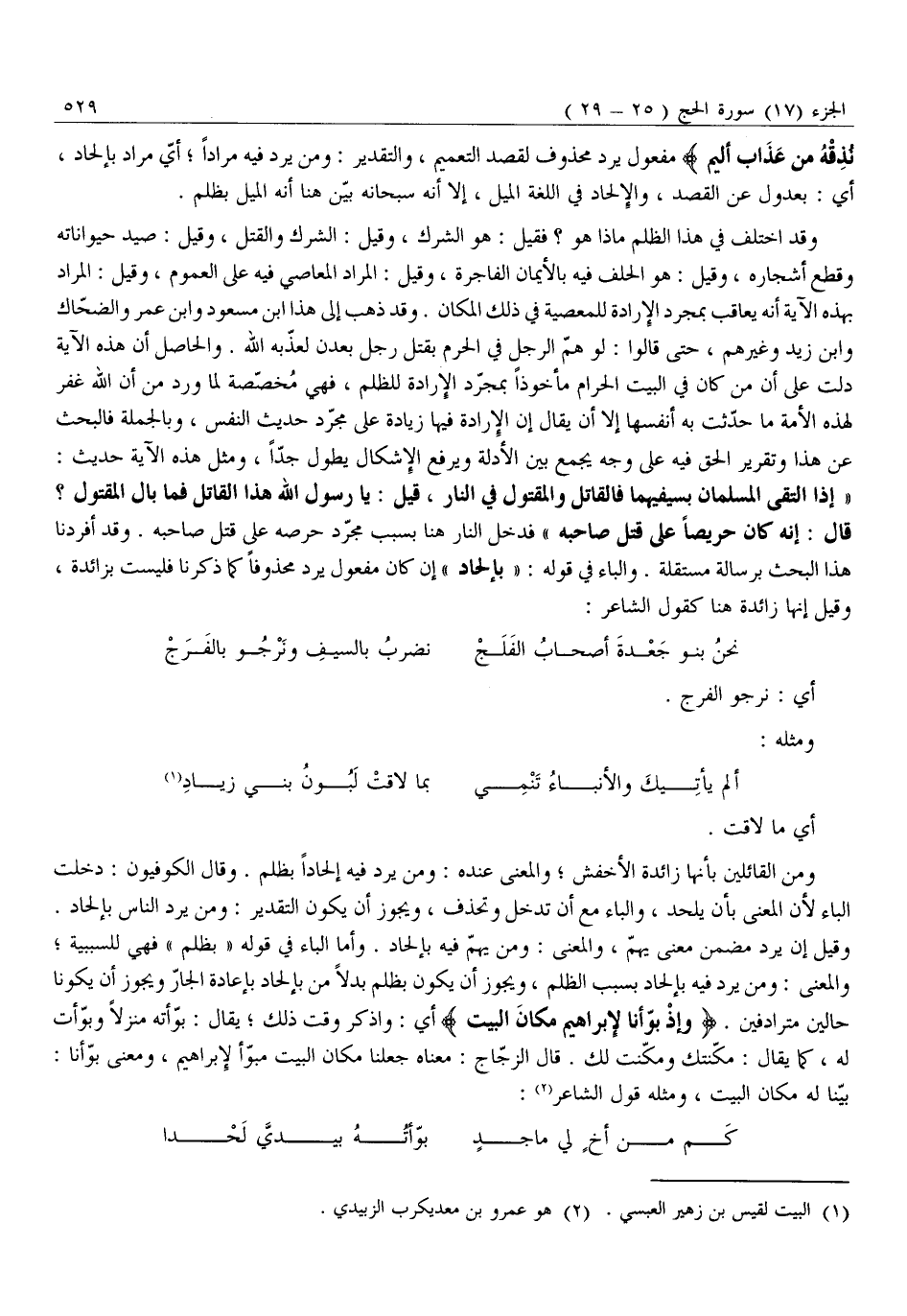 وَقِيلَ إِنْ يُرِدْ مُضَمَّنٌ مَعْنَى يَهُمُّ، وَالْمَعْنَى: وَمَنْ يَهُمُّ فِيهِ بِإِلْحَادٍ. وَأَمَّا الْبَاءُ فِي قَوْلِهِ «بِظُلْمٍ» فَهِيَ لِلسَّبَبِيَّةِ وَالْمَعْنَى: وَمَنْ يُرِدْ فِيهِ بِإِلْحَادٍ بِسَبَبِ الظُّلْمِ، وَيَجُوزُ أَنْ يَكُونَ بِظُلْمٍ بَدَلًا مِنْ بِإِلْحَادٍ بِإِعَادَةِ الْجَارِّ وَيَجُوزُ أَنْ يَكُونَا حَالَيْنِ مُتَرَادِفَيْنِ. وَإِذْ بَوَّأْنا لِإِبْراهِيمَ مَكانَ الْبَيْتِ أَيْ: وَاذْكُرْ وَقْتَ ذَلِكَ يُقَالُ: بَوَّأْتُهُ مَنْزِلًا وَبَوَّأْتُ لَهُ، كَمَا يُقَالُ: مَكَّنْتُكَ وَمَكَّنْتُ لَكَ. قَالَ الزَّجَّاجُ: مَعْنَاهُ جَعَلْنَا مَكَانَ الْبَيْتِ مُبَوَّأً لِإِبْرَاهِيمَ، وَمَعْنَى بَوَّأْنَا: