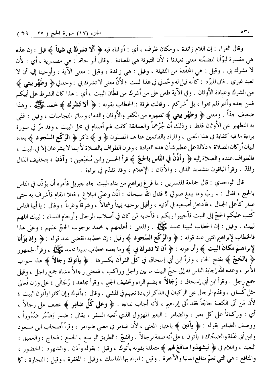 وَقَالَ الْفَرَّاءُ: إِنَّ اللَّامَ زَائِدَةٌ، وَمَكَانَ ظَرْفٌ، أَيْ: أَنْزَلْنَاهُ فِيهِ أَنْ لَا تُشْرِكْ بِي شَيْئاً قِيلَ: إِنَّ هَذِهِ هِيَ مُفَسِّرَةٌ لَبَوَّأْنَا لِتَضَمُّنِهِ مَعْنَى تَعَبَّدْنَا لِأَنَّ التَّبْوِئَةَ هِيَ لِلْعِبَادَةِ. وَقَالَ أَبُو حَاتِمٍ: هِيَ مَصْدَرِيَّةٌ، أَيْ: لِأَنْ لَا تُشْرِكَ بِي. وَقِيلَ: هِيَ الْمُخَفَّفَةُ مِنَ الثَّقِيلَةِ، وَقِيلَ: هِيَ زَائِدَةٌ، وَقِيلَ: مَعْنَى الْآيَةِ: وَأَوْحَيْنَا إِلَيْهِ أَنْ لَا تَعْبُدْ غَيْرِي. قَالَ الْمُبَرِّدُ: كَأَنَّهُ قِيلَ لَهُ وَحِّدْنِي فِي هَذَا الْبَيْتِ لِأَنَّ مَعْنَى لَا تُشْرِكْ بِي: وَحِّدْنِي وَطَهِّرْ بَيْتِيَ مِنَ الشِّرْكِ وَعِبَادَةِ الْأَوْثَانِ. وَفِي الآية طعن على من أَشْرَكَ مِنْ قُطَّانِ الْبَيْتِ، أَيْ: هَذَا كَانَ الشَّرْطَ عَلَى أَبِيكُمْ فَمَنْ بَعْدَهُ وَأَنْتُمْ فَلَمْ تَفُوا، بَلْ أَشْرَكْتُمْ. وَقَالَتْ فِرْقَةٌ: الْخِطَابُ بِقَوْلِهِ: أَنْ لَا تُشْرِكْ لِمُحَمَّدٍ صَلَّى اللَّهُ عَلَيْهِ وَسَلَّمَ، وَهَذَا ضَعِيفٌ جِدًّا. وَمَعْنَى وَطَهِّرْ بَيْتِيَ تَطْهِيرُهُ مِنَ الْكُفْرِ وَالْأَوْثَانِ وَالدِّمَاءِ وَسَائِرِ النَّجَاسَاتِ، وَقِيلَ: عَنَى بِهِ التَّطْهِيرَ عَنِ الْأَوْثَانِ فَقَطْ، وَذَلِكَ أَنَّ جُرْهُمًا وَالْعَمَالِقَةَ كَانَتْ لَهُمْ أَصْنَامٌ فِي مَحَلِّ الْبَيْتِ، وَقَدْ مَرَّ فِي سُورَةِ بَرَاءَةٍ مَا فِيهِ كِفَايَةٌ فِي هَذَا الْمَعْنَى، والمراد بالقائمين هنا هم المصلون وَذكر الرُّكَّعِ السُّجُودِ بَعْدَهُ لِبَيَانِ أَرْكَانِ الصَّلَاةِ دَلَالَةً عَلَى عِظَمِ شَأْنِ هَذِهِ الْعِبَادَةِ، وَقَرَنَ الطَّوَافَ بِالصَّلَاةِ لِأَنَّهُمَا لَا يُشْرَعَانِ إِلَّا فِي الْبَيْتِ، فَالطَّوَافُ عِنْدَهُ وَالصَّلَاةُ إِلَيْهِ وَأَذِّنْ فِي النَّاسِ بِالْحَجِّ قَرَأَ الْحَسَنُ وَابْنُ مُحَيْصِنٍ «وَآذِنْ» بِتَخْفِيفِ الذَّالِ وَالْمَدِّ. وَقَرَأَ الْبَاقُونَ بِتَشْدِيدِ الذَّالِ، وَالْأَذَانُ: الْإِعْلَامُ، وَقَدْ تَقَدَّمَ فِي بَرَاءَةٍ.