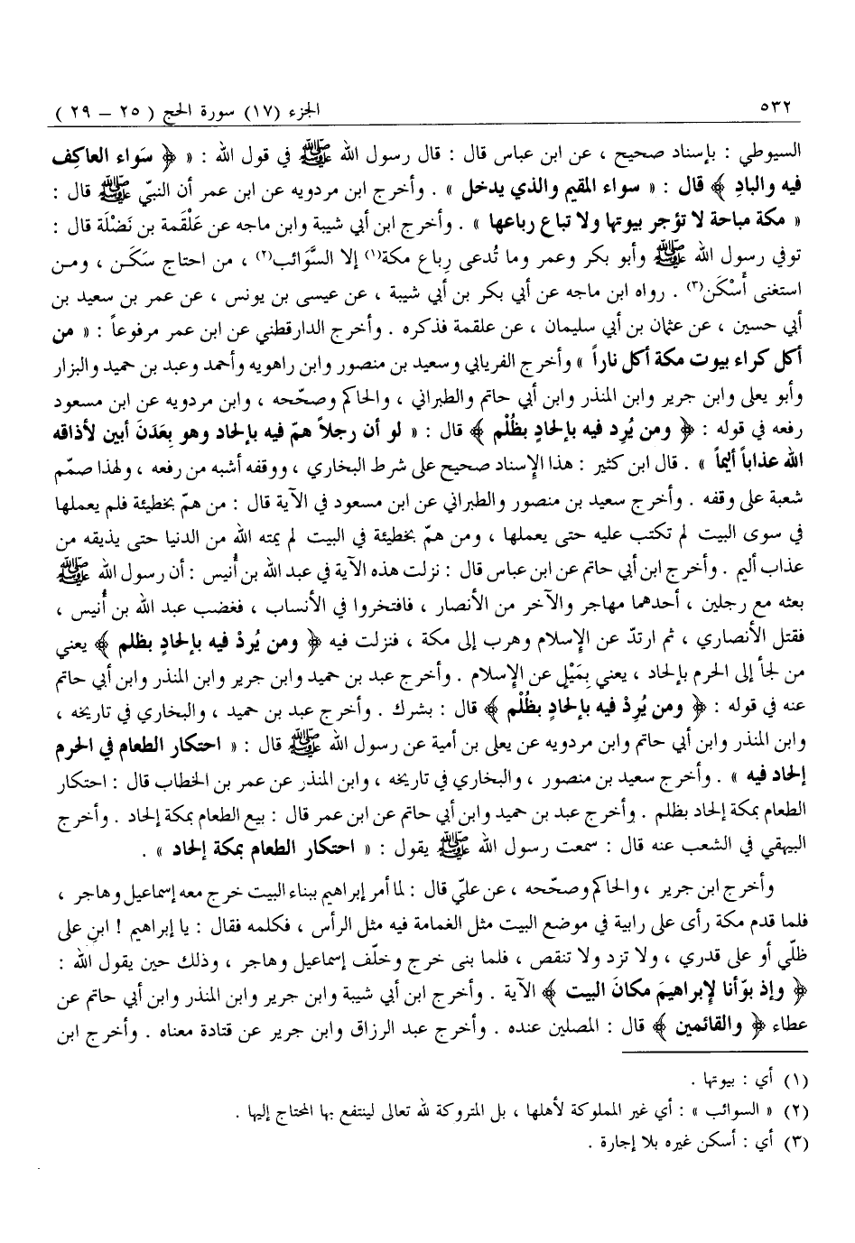 السُّيُوطِيُّ: بِإِسْنَادٍ صَحِيحٍ، عَنِ ابْنِ عَبَّاسٍ قَالَ: قَالَ رَسُولُ اللَّهِ صَلَّى اللَّهُ عَلَيْهِ وَسَلَّمَ في قول الله: «سَواءً الْعاكِفُ فِيهِ وَالْبادِ قَالَ: «سَوَاءٌ الْمُقِيمُ وَالَّذِي يَدْخُلُ» . وَأَخْرَجَ ابْنُ مَرْدَوَيْهِ عَنِ ابْنِ عُمَرَ أَنَّ النَّبِيَّ صَلَّى اللَّهُ عَلَيْهِ وَسَلَّمَ قَالَ: