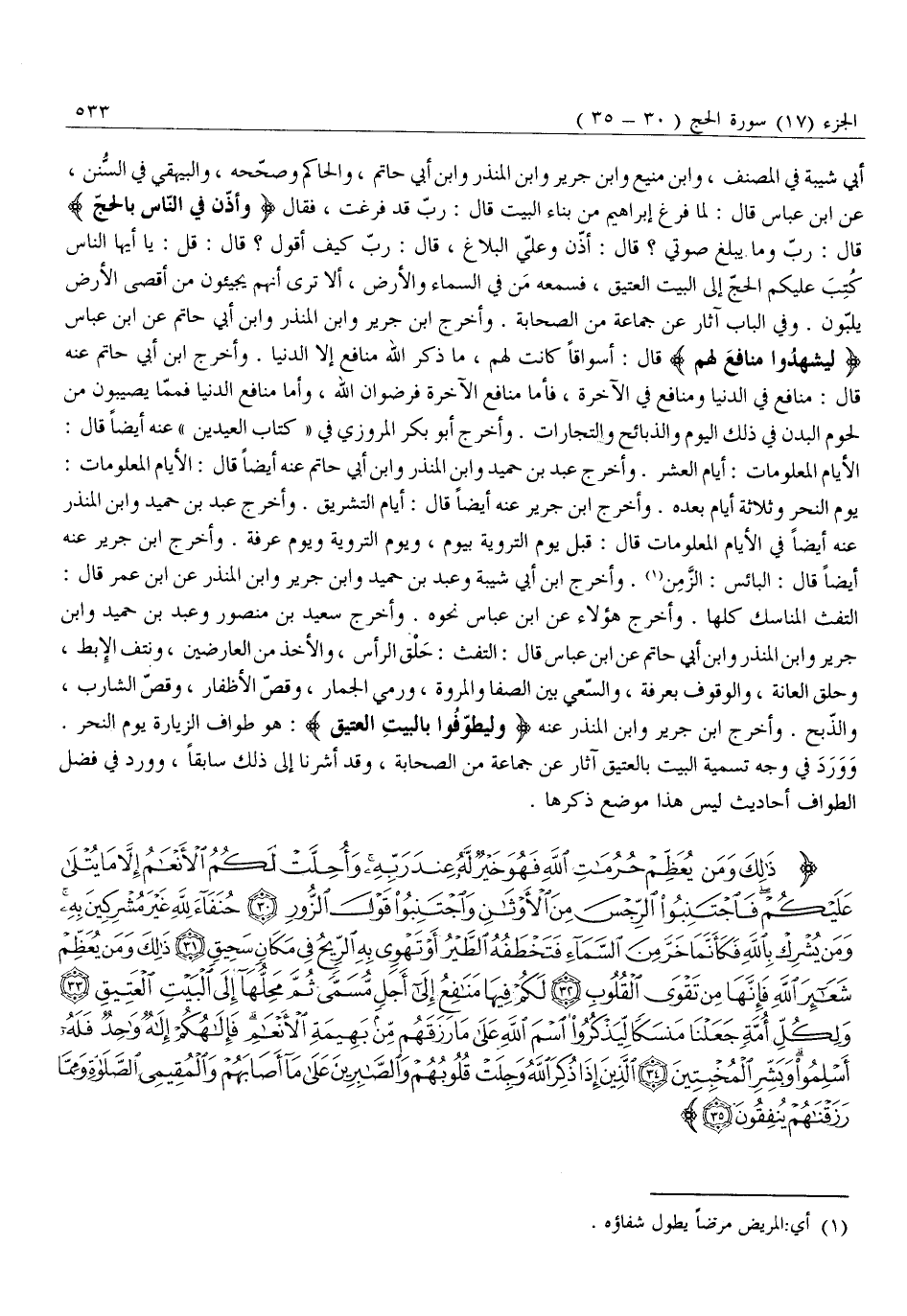 أَبِي شَيْبَةَ فِي الْمُصَنَّفِ، وَابْنُ مَنِيعٍ وَابْنُ جَرِيرٍ وَابْنُ الْمُنْذِرِ وَابْنُ أَبِي حَاتِمٍ، وَالْحَاكِمُ وَصَحَّحَهُ، وَالْبَيْهَقِيُّ فِي السُّنَنِ، عَنِ ابْنِ عَبَّاسٍ قَالَ: لَمَّا فَرَغَ إِبْرَاهِيمُ مِنْ بِنَاءِ الْبَيْتِ قَالَ: رَبِّ قَدْ فَرَغْتُ، فَقَالَ وَأَذِّنْ فِي النَّاسِ بِالْحَجِّ قَالَ: رَبِّ وَمَا يُبَلِّغُ صَوْتِي؟ قَالَ: أَذِّنْ وَعَلَيَّ الْبَلَاغُ، قَالَ: رَبِّ كَيْفَ أَقُولُ؟ قَالَ: قُلْ: يَا أَيُّهَا النَّاسُ كُتِبَ عَلَيْكُمُ الْحَجُّ إِلَى الْبَيْتِ الْعَتِيقِ، فَسَمِعَهُ مَنْ فِي السَّمَاءِ وَالْأَرْضِ، أَلَا تَرَى أَنَّهُمْ يَجِيئُونَ مِنْ أَقْصَى الْأَرْضِ يُلَبُّونَ. وَفِي الْبَابِ آثَارٌ عَنْ جَمَاعَةٍ مِنَ الصَّحَابَةِ. وَأَخْرَجَ ابْنُ جَرِيرٍ وَابْنُ الْمُنْذِرِ وَابْنُ أَبِي حَاتِمٍ عَنِ ابْنِ عَبَّاسٍ لِيَشْهَدُوا مَنافِعَ لَهُمْ قَالَ: أَسْوَاقًا كَانَتْ لَهُمْ، مَا ذَكَرَ اللَّهُ مَنَافِعَ إِلَّا الدُّنْيَا. وَأَخْرَجَ ابْنُ أَبِي حَاتِمٍ عَنْهُ قَالَ: مَنَافِعُ فِي الدُّنْيَا وَمَنَافِعُ فِي الْآخِرَةِ، فَأَمَّا مَنَافِعُ الْآخِرَةِ فَرِضْوَانُ اللَّهِ، وَأَمَّا مَنَافِعُ الدُّنْيَا فَمِمَّا يُصِيبُونَ مِنْ لُحُومِ الْبُدْنِ فِي ذَلِكَ الْيَوْمِ والذبائح والتجارات. وأخرج أبو بكر المروزي فِي «كِتَابِ الْعِيدَيْنِ» عَنْهُ أَيْضًا قَالَ: