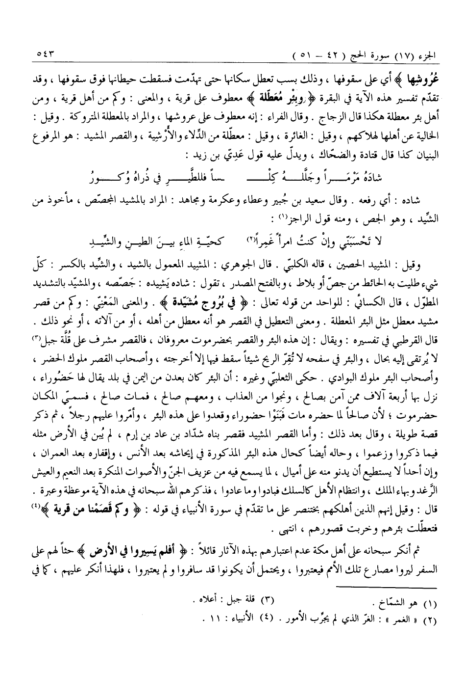وَقِيلَ: الْمَشِيدُ الْحَصِينُ، قَالَهُ الْكَلْبِيُّ. قَالَ الْجَوْهَرِيُّ: الْمَشِيدُ الْمَعْمُولُ بِالشِّيدِ، وَالشِّيدُ بِالْكَسْرِ: كُلُّ شَيْءٍ طَلَيْتُ بِهِ الْحَائِطَ مِنْ جِصٍّ أَوْ بَلَاطٍ، وَبِالْفَتْحِ الْمَصْدَرُ، تَقُولُ: شَادَهُ يَشِيدُهُ: جَصَّصَهُ، وَالْمُشَيَّدُ بِالتَّشْدِيدِ الْمُطَوَّلُ، قَالَ الْكِسَائِيُّ: لِلْوَاحِدِ مِنْ قوله تعالى: فِي بُرُوجٍ مُشَيَّدَةٍ. وَالْمَعْنَى الْمَعْنِيُّ: وَكَمْ مِنْ قَصْرٍ مُشَيَّدٍ مُعَطَّلٍ مِثْلِ الْبِئْرِ الْمُعَطَّلَةِ. وَمَعْنَى التَّعْطِيلُ فِي الْقَصْرِ هُوَ أَنَّهُ مُعَطَّلٌ مِنْ أَهْلِهِ، أَوْ مِنْ آلَاتِهِ، أَوْ نَحْوِ ذَلِكَ.