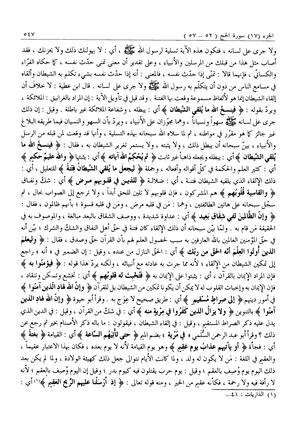 أَيْ: فِي شَكٍّ مِنَ الْقُرْآنِ، وَقِيلَ: فِي الدِّينِ الَّذِي يَدُلُّ عَلَيْهِ ذِكْرُ الصِّرَاطِ الْمُسْتَقِيمِ، وَقِيلَ: فِي إِلْقَاءِ الشَّيْطَانِ، فَيَقُولُونَ: مَا بَالُهُ ذَكَرَ الْأَصْنَامَ بِخَيْرٍ ثُمَّ رَجَعَ عَنْ ذَلِكَ؟ وَقَرَأَ أَبُو عَبْدِ الرَّحْمَنِ السُّلَمِيُّ «فِي مِرْيَةٍ» بِضَمِّ الْمِيمِ حَتَّى تَأْتِيَهُمُ السَّاعَةُ أَيِ: الْقِيَامَةُ بَغْتَةً أَيْ: فَجْأَةً أَوْ يَأْتِيَهُمْ عَذابُ يَوْمٍ عَقِيمٍ وَهُوَ يَوْمُ الْقِيَامَةِ لِأَنَّهُ لَا يَوْمَ بَعْدَهُ، فَكَانَ بِهَذَا الِاعْتِبَارِ عَقِيمًا، وَالْعَقِيمُ فِي اللُّغَةِ: مَنْ لَا يَكُونُ لَهُ ولد، ولما كانت الأيام نتوالى جُعِلَ ذَلِكَ كَهَيْئَةِ الْوِلَادَةِ، وَلَمَّا لَمْ يَكُنْ بَعْدَ ذَلِكَ الْيَوْمِ يَوْمٌ وُصِفَ بِالْعُقْمِ وَقِيلَ: يَوْمُ حَرْبٍ يُقْتَلُونَ فِيهِ كَيَوْمِ بَدْرٍ وَقِيلَ إِنَّ الْيَوْمَ وُصِفَ بِالْعُقْمِ لِأَنَّهُ لَا رَأْفَةَ فِيهِ وَلَا رَحْمَةَ، فَكَأَنَّهُ عَقِيمٌ مِنَ الْخَيْرِ، وَمِنْهُ قَوْلُهُ تَعَالَى: إِذْ أَرْسَلْنا عَلَيْهِمُ الرِّيحَ الْعَقِيمَ «1» أي: