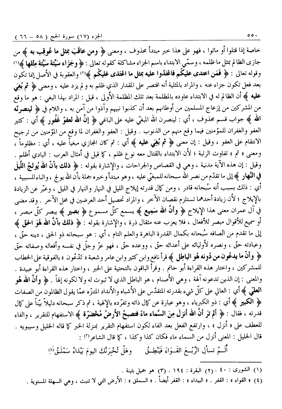 خَاصَّةً إِذَا قُتِلُوا أَوْ مَاتُوا، فَهُوَ عَلَى هَذَا خَبَرُ مُبْتَدَأٍ مَحْذُوفٍ، وَمَعْنَى وَمَنْ عاقَبَ بِمِثْلِ مَا عُوقِبَ بِهِ مَنْ جَازَى الظَّالِمَ بِمِثْلِ مَا ظَلَمَهُ، وَسُمِّيَ الِابْتِدَاءُ بِاسْمِ الْجَزَاءِ مُشَاكَلَةً كَقَوْلِهِ تَعَالَى: وَجَزاءُ سَيِّئَةٍ سَيِّئَةٌ مِثْلُها «1» وَقَوْلُهُ تَعَالَى: فَمَنِ اعْتَدى عَلَيْكُمْ فَاعْتَدُوا عَلَيْهِ بِمِثْلِ مَا اعْتَدى عَلَيْكُمْ «2» وَالْعُقُوبَةُ فِي الْأَصْلِ إِنَّمَا تَكُونُ بَعْدَ فِعْلٍ تَكُونُ جَزَاءً عَنْهُ، وَالْمُرَادُ بِالْمِثْلِيَّةِ أَنَّهُ اقْتَصَرَ عَلَى الْمِقْدَارِ الَّذِي ظُلِمَ بِهِ وَلَمْ يَزِدْ عَلَيْهِ، وَمَعْنَى ثُمَّ بُغِيَ عَلَيْهِ أَنَّ الظَّالِمَ لَهُ فِي الِابْتِدَاءِ عَاوَدَهُ بِالْمَظْلَمَةِ بَعْدَ تِلْكَ الْمَظْلَمَةِ الْأُولَى، قِيلَ: الْمُرَادُ بِهَذَا الْبَغْيِ: هُوَ مَا وَقَعَ مِنَ الْمُشْرِكِينَ مِنْ إِزْعَاجِ الْمُسْلِمِينَ مِنْ أَوْطَانِهِمْ بَعْدَ أَنْ كَذَّبُوا نَبِيَّهُمْ وَآذَوْا مَنْ آمَنَ بِهِ، وَاللَّامُ فِي لَيَنْصُرَنَّهُ اللَّهُ جَوَابُ قَسَمٍ مَحْذُوفٍ، أَيْ: لَيَنْصُرَنَّ اللَّهُ الْمَبْغِيَّ عَلَيْهِ عَلَى الْبَاغِي إِنَّ اللَّهَ لَعَفُوٌّ غَفُورٌ أَيْ: كَثِيرُ الْعَفْوِ وَالْغُفْرَانِ لِلْمُؤْمِنِينَ فِيمَا وَقَعَ مِنْهُمْ مَنِ الذُّنُوبِ. وَقِيلَ: الْعَفْوُ وَالْغُفْرَانُ لِمَا وَقَعَ مِنَ الْمُؤْمِنِينَ مِنْ تَرْجِيحِ الِانْتِقَامِ عَلَى الْعَفْوِ، وَقِيلَ: إِنَّ مَعْنَى ثُمَّ بُغِيَ عَلَيْهِ أَيْ: ثُمَّ كَانَ الْمُجَازِي مَبْغِيًّا عَلَيْهِ، أَيْ: مَظْلُومًا، وَمَعْنَى «ثُمَّ» تَفَاوُتُ الرُّتْبَةِ لِأَنَّ الِابْتِدَاءَ بِالْقِتَالِ مَعَهُ نَوْعُ ظُلْمٍ، كَمَا قِيلَ فِي أَمْثَالِ الْعَرَبِ: الْبَادِي أَظْلِمُ.