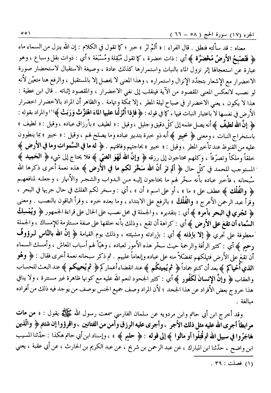 وَقَدْ أَخْرَجَ ابْنُ أَبِي حَاتِمٍ وَابْنُ مَرْدَوَيْهِ عَنْ سَلْمَانَ الْفَارِسِيِّ سَمِعَتْ رَسُولَ اللَّهِ صَلَّى اللَّهُ عَلَيْهِ وَسَلَّمَ يَقُولُ: «مَنْ مَاتَ مُرَابِطًا أَجْرَى اللَّهُ عَلَيْهِ مِثْلَ ذَلِكَ الْأَجْرِ، وَأَجْرَى عَلَيْهِ الرِّزْقَ وَأَمِنَ مِنَ الْفَتَّانِينَ، وَاقْرَءُوا إِنْ شِئْتُمْ وَالَّذِينَ هاجَرُوا فِي سَبِيلِ اللَّهِ ثُمَّ قُتِلُوا أَوْ ماتُوا إِلَى قَوْلِهِ: حَلِيمٌ» ، وَإِسْنَادُ ابْنِ أَبِي حاتم هكذا: حدّثنا المسيب ابن وَاضِحٍ، حَدَّثَنَا ابْنُ الْمُبَارَكِ، عَنْ عَبْدِ الرَّحْمَنِ بْنِ شُرَيْحٍ، عَنْ عَبْدِ الْكَرِيمِ بْنِ الْحَارِثِ، عن أبي عقبة، يعني