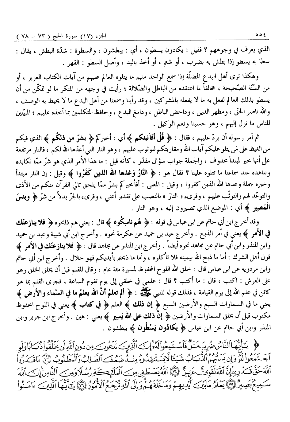 وَقَدْ أَخْرَجَ ابْنُ أَبِي حَاتِمٍ عَنِ ابْنِ عَبَّاسٍ فِي قَوْلِهِ: هُمْ ناسِكُوهُ قَالَ: يَعْنِي هُمْ ذَابِحُوهُ فَلا يُنازِعُنَّكَ فِي الْأَمْرِ يَعْنِي فِي أَمْرِ الذَّبْحِ. وَأَخْرَجَ عَبْدُ بْنُ حُمَيْدٍ عَنْ عِكْرِمَةَ نَحْوَهُ. وَأَخْرَجَ ابْنُ أَبِي شَيْبَةَ وَعَبْدُ بْنُ حُمَيْدٍ وَابْنُ الْمُنْذِرِ وَابْنُ أَبِي حَاتِمٍ عَنْ مُجَاهِدٍ نَحْوَهُ أَيْضًا. وَأَخْرَجَ ابْنُ الْمُنْذِرِ عَنْ مُجَاهِدٍ قَالَ: فَلا يُنازِعُنَّكَ فِي الْأَمْرِ قَوْلُ أَهْلِ الشِّرْكِ: أَمَّا مَا ذَبَحَ اللَّهُ بِيَمِينِهِ فَلَا تَأْكُلُوهُ، وَأَمَّا مَا ذَبَحْتُمْ بِأَيْدِيكُمْ فَهُوَ حَلَالٌ. وَأَخْرَجَ ابْنُ أَبِي حَاتِمٍ وَابْنُ مَرْدَوَيْهِ عَنْ ابْنِ عَبَّاسٍ قَالَ: خَلَقَ اللَّهُ اللَّوْحَ الْمَحْفُوظَ لمسيرة مِائَةِ عَامٍ، وَقَالَ لِلْقَلَمِ قَبْلَ أَنْ يَخْلُقَ الْخَلْقَ وَهُوَ عَلَى الْعَرْشِ: اكْتُبْ، قَالَ: مَا أَكْتُبُ؟ قَالَ: عِلْمِي فِي خَلْقِي إِلَى يَوْمِ تَقُومُ السَّاعَةُ، فَجَرَى الْقَلَمُ بِمَا هُوَ كَائِنٌ فِي عِلْمِ اللَّهِ إِلَى يَوْمِ الْقِيَامَةِ، فَذَلِكَ قوله للنبي صلّى الله عليه وَسَلَّمَ: أَلَمْ تَعْلَمْ أَنَّ اللَّهَ يَعْلَمُ مَا فِي السَّماءِ وَالْأَرْضِ يَعْنِي مَا فِي السَّمَاوَاتِ السَّبْعِ وَالْأَرَضِينَ السَّبْعِ إِنَّ ذلِكَ الْعِلْمُ فِي كِتابٍ يَعْنِي فِي اللَّوْحِ الْمَحْفُوظِ مَكْتُوبٌ قَبْلَ أَنْ يَخْلُقَ السَّمَاوَاتِ وَالْأَرَضِينَ إِنَّ ذلِكَ عَلَى اللَّهِ يَسِيرٌ يَعْنِي: هَيِّنٌ. وَأَخْرَجَ ابْنُ جَرِيرٍ وَابْنُ الْمُنْذِرِ وَابْنُ أَبِي حَاتِمٍ عَنِ ابْنِ عباس يَكادُونَ يَسْطُونَ يبطشون.