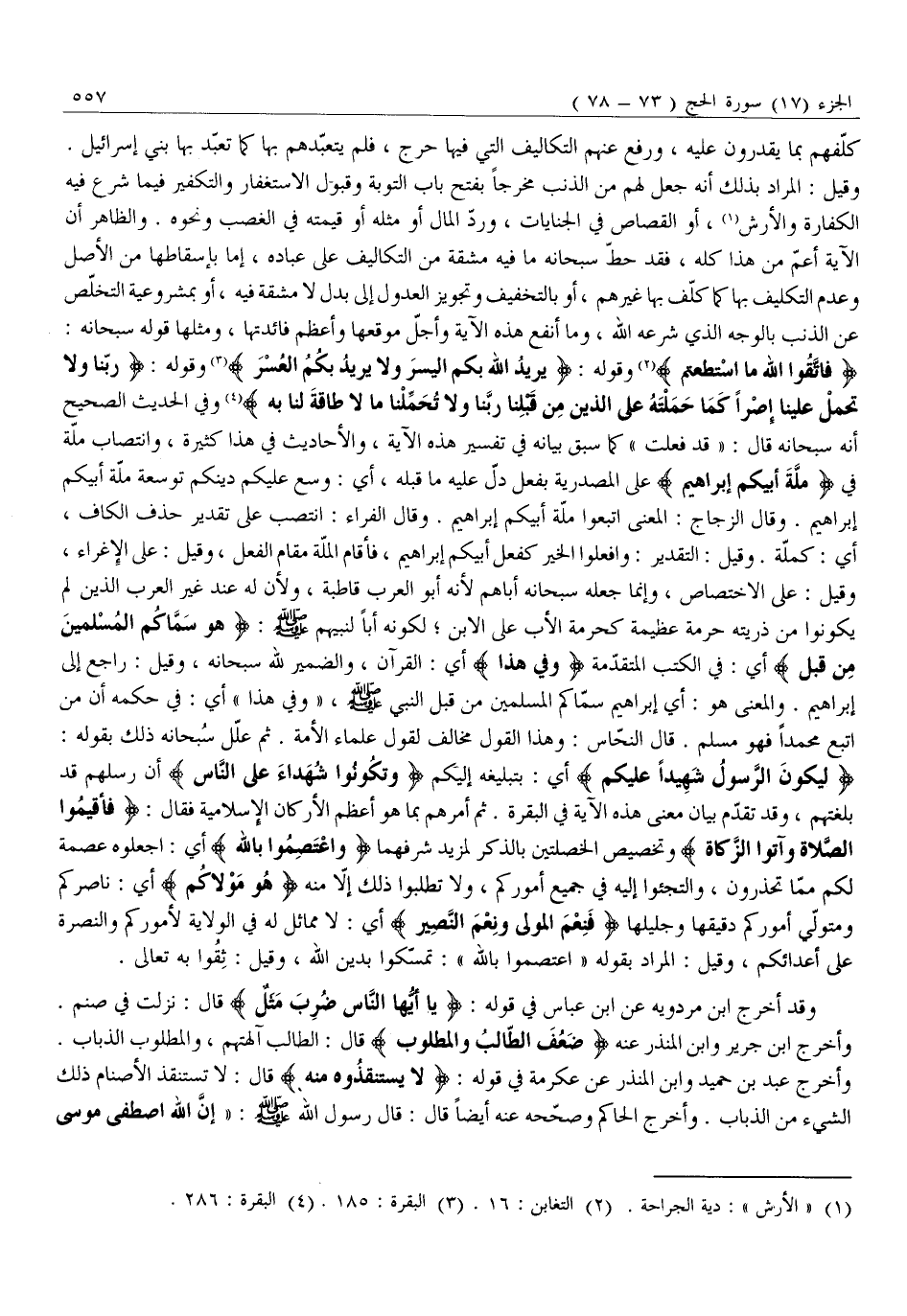 فَاتَّقُوا اللَّهَ مَا اسْتَطَعْتُمْ «2» وَقَوْلُهُ: يُرِيدُ اللَّهُ بِكُمُ الْيُسْرَ وَلا يُرِيدُ بِكُمُ الْعُسْرَ «3» وَقَوْلُهُ: رَبَّنا وَلا تَحْمِلْ عَلَيْنا إِصْراً كَما حَمَلْتَهُ عَلَى الَّذِينَ مِنْ قَبْلِنا رَبَّنا وَلا تُحَمِّلْنا ما لا طاقَةَ لَنا بِهِ «4» وَفِي الْحَدِيثِ الصَّحِيحِ أَنَّهُ سُبْحَانَهُ قَالَ: «قَدْ فَعَلْتُ» كَمَا سَبَقَ بَيَانُهُ فِي تَفْسِيرِ هَذِهِ الْآيَةِ، وَالْأَحَادِيثُ فِي هَذَا كَثِيرَةٌ، وَانْتِصَابُ مِلَّةَ فِي مِلَّةَ أَبِيكُمْ إِبْراهِيمَ عَلَى الْمَصْدَرِيَّةِ بِفِعْلٍ دَلَّ عَلَيْهِ مَا قَبْلَهُ، أَيْ: وَسَّعَ عَلَيْكُمْ دِينَكُمْ تَوْسِعَةَ مِلَّةِ أَبِيكُمْ إِبْرَاهِيمَ. وَقَالَ الزَّجَّاجُ: الْمَعْنَى اتَّبِعُوا مِلَّةَ أَبِيكُمْ إِبْرَاهِيمَ. وَقَالَ الْفَرَّاءُ: انْتَصَبَ عَلَى تَقْدِيرِ حَذْفِ الْكَافِ، أَيْ: كَمِلَّةِ. وَقِيلَ: التَّقْدِيرُ: وَافْعَلُوا الْخَيْرَ كَفِعْلِ أَبِيكُمْ إِبْرَاهِيمَ، فَأَقَامَ الْمِلَّةَ مَقَامَ الْفِعْلِ، وَقِيلَ: عَلَى الْإِغْرَاءِ، وَقِيلَ: عَلَى الِاخْتِصَاصِ، وَإِنَّمَا جَعَلَهُ سُبْحَانَهُ أَبَاهُمْ لِأَنَّهُ أَبُو الْعَرَبِ قَاطِبَةً، وَلِأَنَّ لَهُ عِنْدَ غَيْرِ الْعَرَبِ الَّذِينَ لَمْ يَكُونُوا مِنْ ذُرِّيَّتِهِ حُرْمَةً عَظِيمَةً كَحُرْمَةِ الْأَبِ عَلَى الِابْنِ لِكَوْنِهِ أبا لنبيهم صلّى الله عليه وَسَلَّمَ: هُوَ سَمَّاكُمُ الْمُسْلِمِينَ مِنْ قَبْلُ أَيْ: فِي الْكُتُبِ الْمُتَقَدِّمَةِ وَفِي هَذَا أَيِ: الْقُرْآنِ، وَالضَّمِيرُ لِلَّهِ سُبْحَانَهُ، وَقِيلَ: رَاجِعٌ إِلَى إِبْرَاهِيمَ. وَالْمَعْنَى هُو: أَيْ إِبْرَاهِيمُ سَمَّاكُمُ الْمُسْلِمِينَ مِنْ قبل النبي صلّى الله عليه وَسَلَّمَ، «وَفِي هَذَا» أَيْ: فِي حُكْمِهِ أَنَّ مَنِ اتَّبَعَ مُحَمَّدًا فَهُوَ مُسْلِمٌ. قَالَ النَّحَّاسُ: وَهَذَا الْقَوْلُ مُخَالِفٌ لِقَوْلِ عُلَمَاءِ الْأُمَّةِ. ثُمَّ عَلَّلَ سُبْحَانَهُ ذَلِكَ بِقَوْلِهِ: