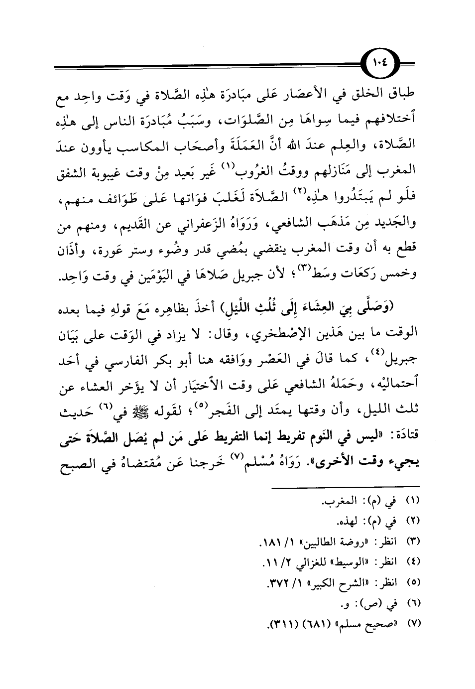 طباق الخلق في الأعصَار عَلى مبَادرَة هذِه الصَّلاة في وَقت واحِد مع اختلافهم فيما سِواهَا مِن الصَّلوَات، وسَبَبُ مُبَادرَة الناس إلى هذِه الصَّلاة، والعِلم عندَ الله أنَّ العَمَلَةَ وأصحَاب المكاسب يأوون عندَ المغرب إلى مَنَازلهم ووقتُ الغرُوب (¬1) غَير بَعيد مِنْ وقت غيبوبة الشفق فلَو لم يَبتَدُروا هذِه (¬2) الصَّلَاة لَغَلبَ فوَاتها عَلى طَوَائف منهم، والجَديد مِن مَذهَب الشافعي، وَرَوَاهُ الزَعفراني عن القَديم، ومنهم من قطع به أن وقت المغرب ينقضي بمُضي قدر وضُوء وستر عَورة، وأذَان وخمس رَكعَات وسَط (¬3)؛ لأن جبريل صَلاهَا في اليَوْمَين في وقت وَاحِد.