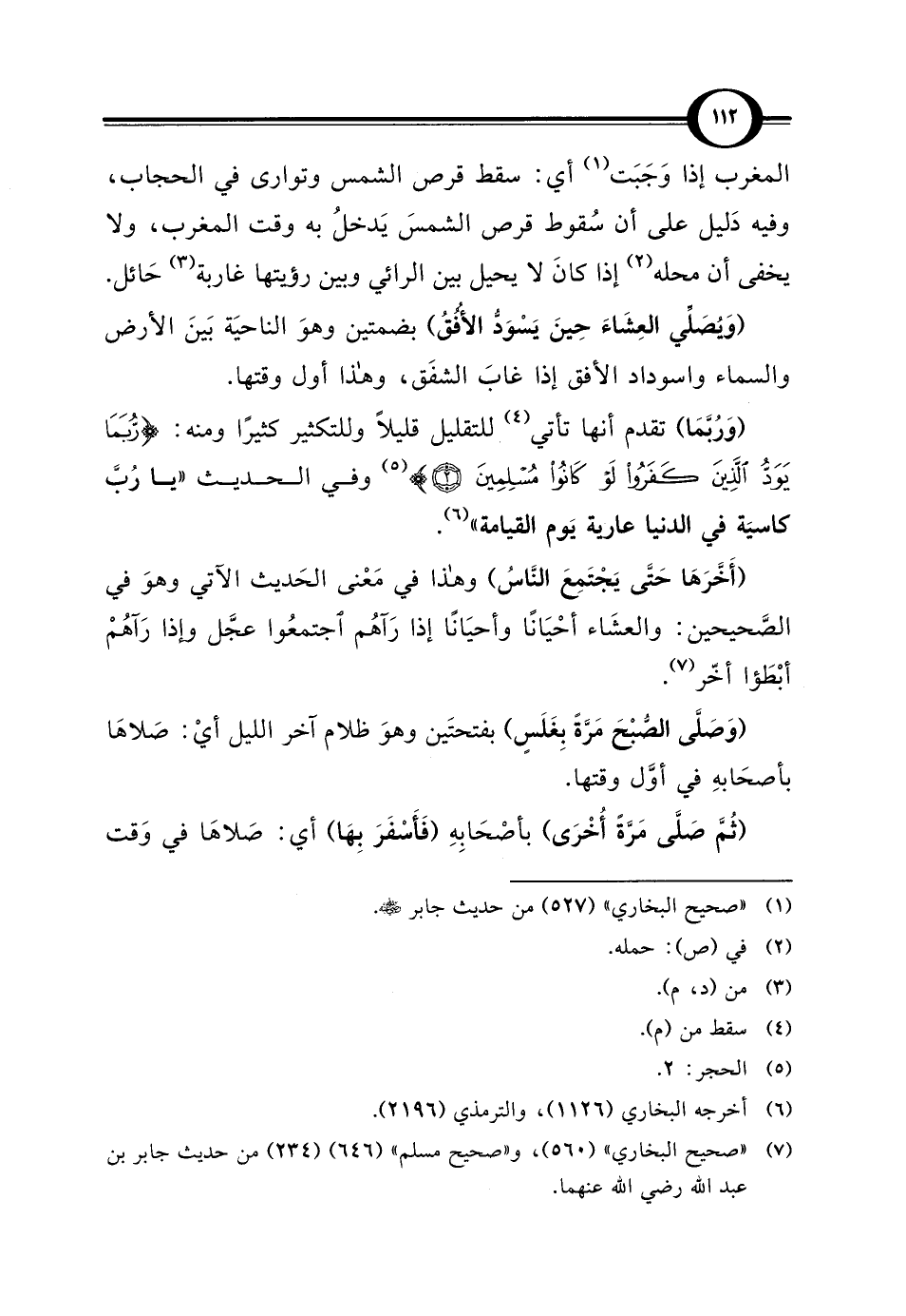 المغرب إذا وَجَبَت (¬1) أي: سقط قرص الشمس وتوارى في الحجاب، وفيه دَليل على أن سُقوط قرص الشمسَ يَدخلُ به وقت المغرب، ولا يخفى أن محله (¬2) إذا كانَ لا يحيل بين الرائي وبين رؤيتها غاربة (¬3) حَائل.