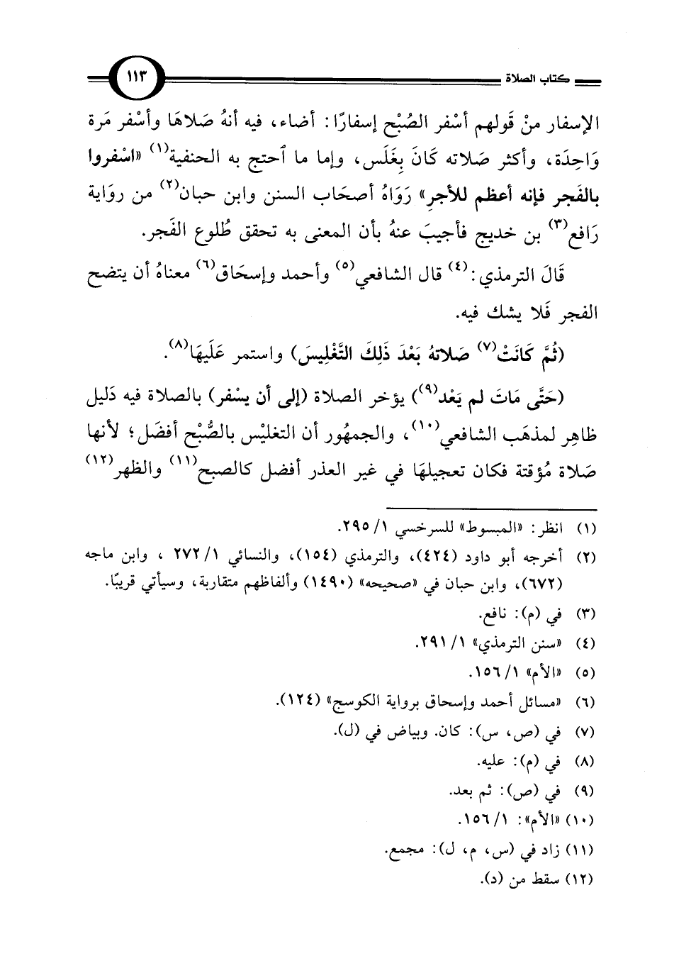 الإسفار منْ قَولهم أسْفر الصُبْح إسفارًا: أضاء، فيه أنهُ صَلاهَا وأسْفر مَرة وَاحِدَة، وأكثر صَلاته كَانَ بِغَلَس، وإما ما احتج به الحنفية (¬1) "اسفروا بالفَجر فإنه أعظم للأجرِ" رَوَاهُ أصحَاب السنن وابن حبان (¬2) من روَاية رَافع (¬3) بن خديج فأجيبَ عنهُ بأن المعنى به تحقق طُلوع الفَجر.