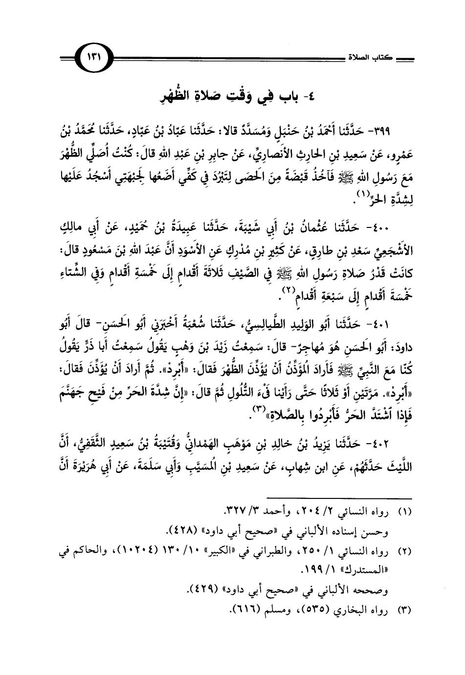 399 - حَدَّثَنا أَحْمَدُ بْنُ حَنْبَلٍ وَمُسَدَّدٌ قالا: حَدَّثَنا عَبّادُ بْنُ عَبّادٍ، حَدَّثَنا مُحَمَّدُ بْنُ عَمْرٍو، عَنْ سَعِيدِ بْنِ الحارِثِ الأنصَارِيِّ، عَنْ جابِرِ بْنِ عَبْدِ اللهِ قالَ: كُنْتُ أُصَلِّي الظُّهْرَ مَعَ رَسُولِ اللهِ - صلى الله عليه وسلم - فَآخُذُ قَبْضَةً مِنَ الحَصى لِتَبْرُدَ فِي كَفِّي أَضَعُها لِجَبْهَتِي أَسْجُدُ عَلَيْها لِشِدَّةِ الحرِّ (¬1).