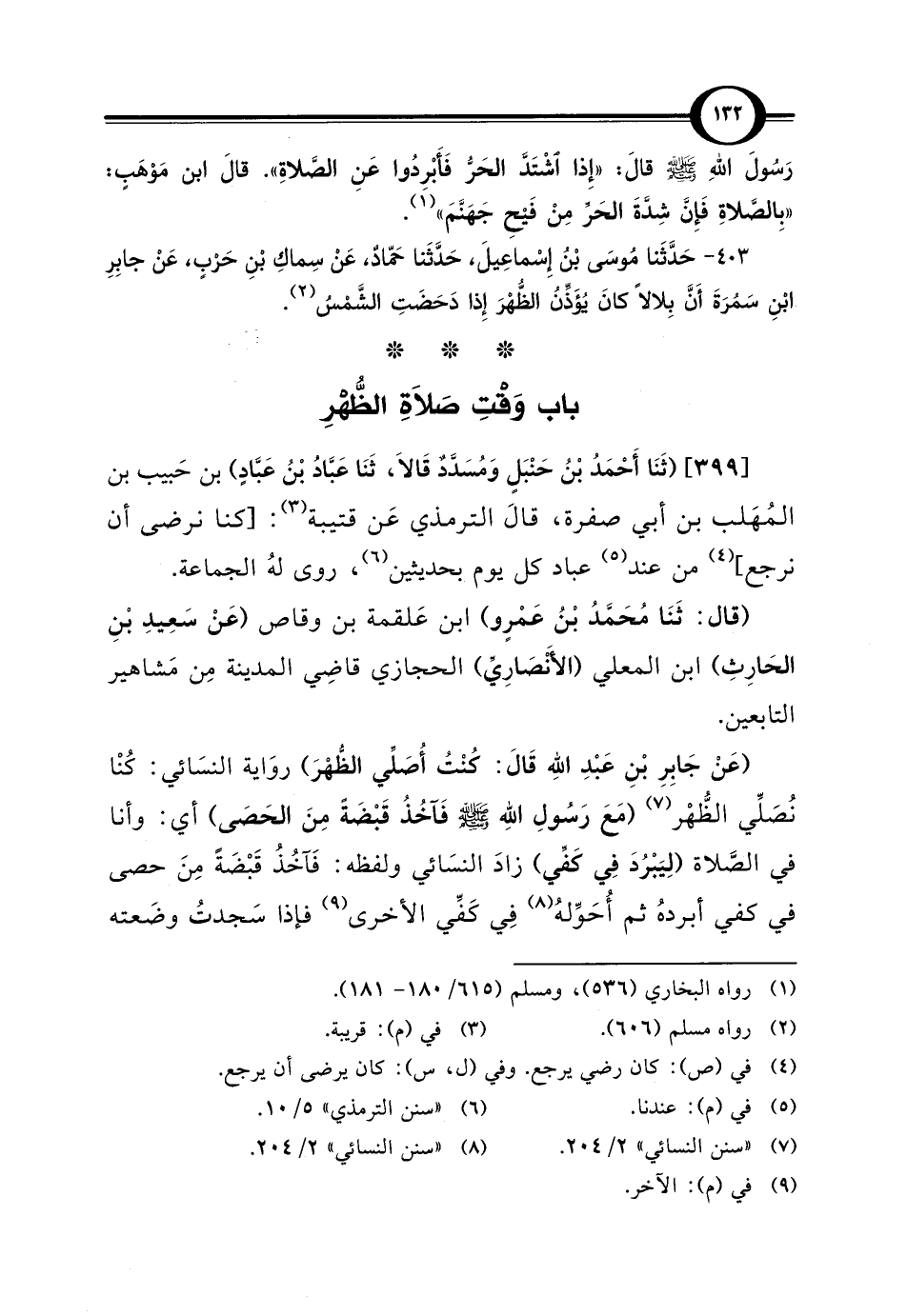 [399] (ثَنَا أَحْمَدُ بْنُ حَنْبَل وَمُسَدَّدٌ قَالَا، ثَنَا عَبَّادُ بْنُ عَبَّادٍ) بن حَبيب بن المُهَلب بن أبي صفرة، قالَ الترمذي عَن قتيبة (¬3): [كنا نرضى أن نرجع] (¬4) من عند (¬5) عباد كل يوم بحديثين (¬6)، روى لهُ الجماعة.
