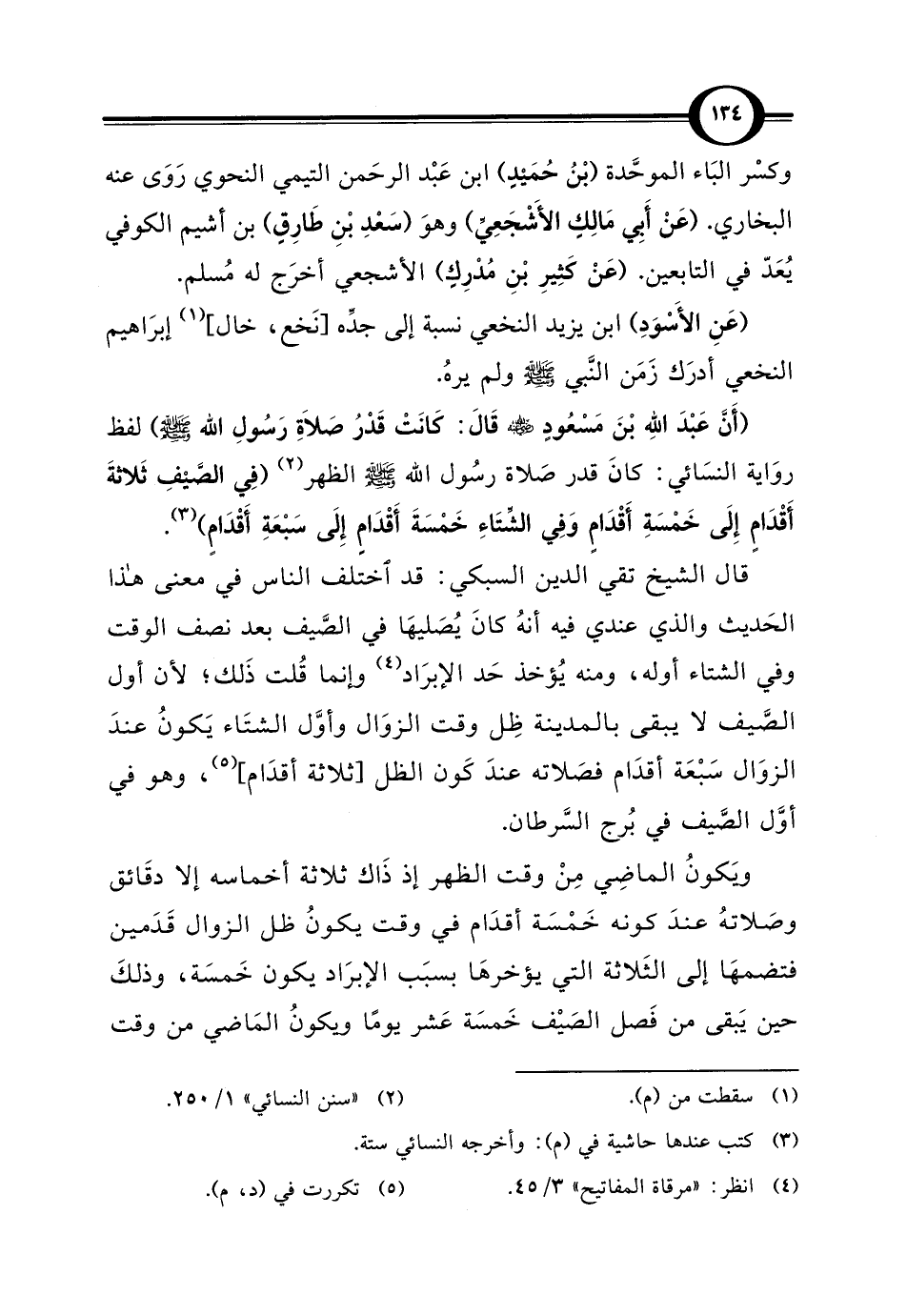 (أَنَّ عَبْدَ الله بْنَ مَسْعُودٍ - رضي الله عنه - قَالَ: كَانَتْ قَدْرُ صَلَاةِ رَسُولِ الله - صلى الله عليه وسلم -) لفظ روَاية النسَائي: كانَ قدر صَلاة رسُول الله - صلى الله عليه وسلم - الظهر (¬2) (فِي الصَّيْفِ ثَلاثةَ أَقْدَامٍ إِلَى خَمْسَةِ أَقْدَامٍ وَفِي الشَّتَاءِ خَمْسَةَ أَقْدَامِ إِلَى سَبْعَةِ أَقْدَامٍ) (¬3).